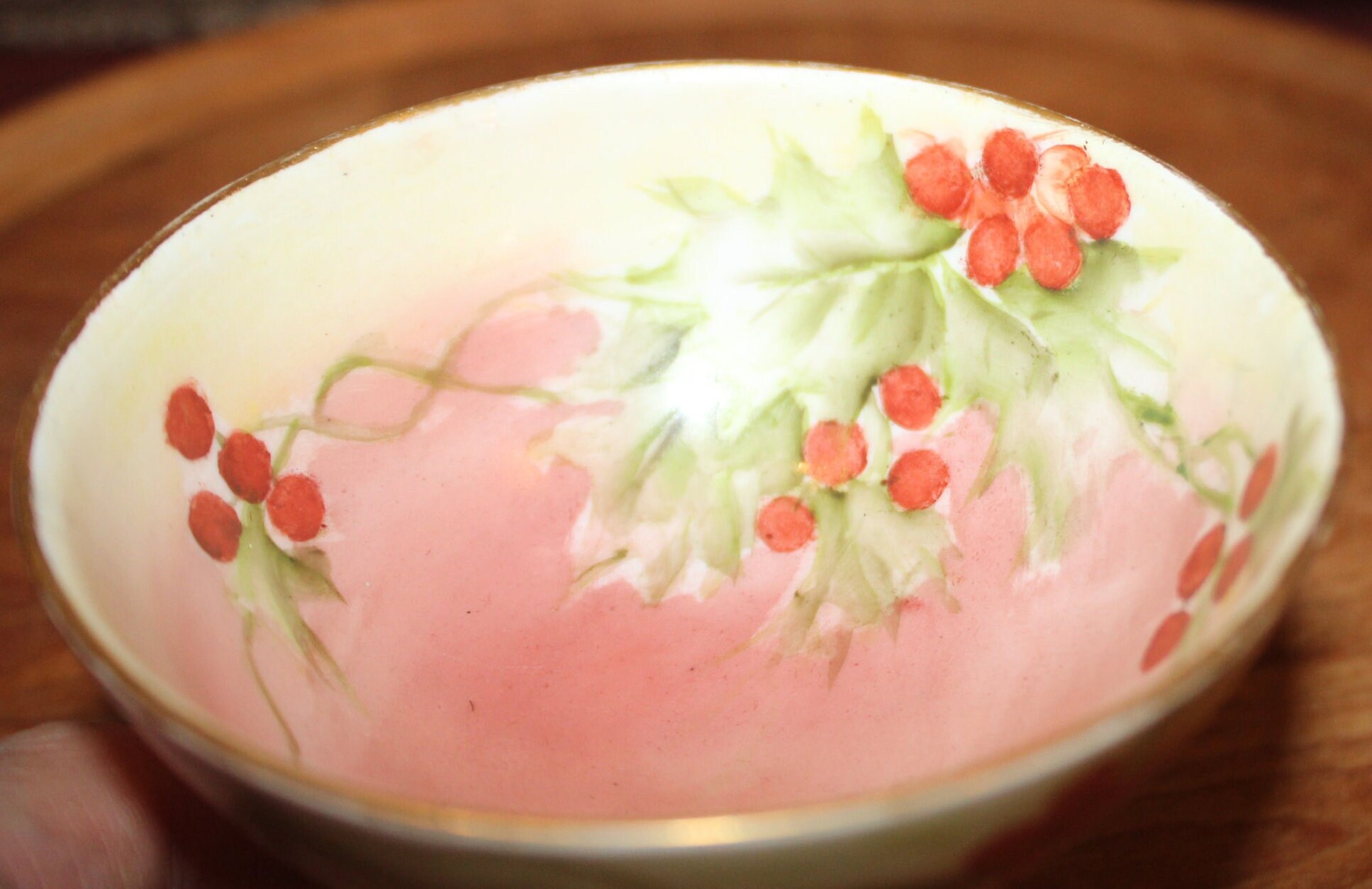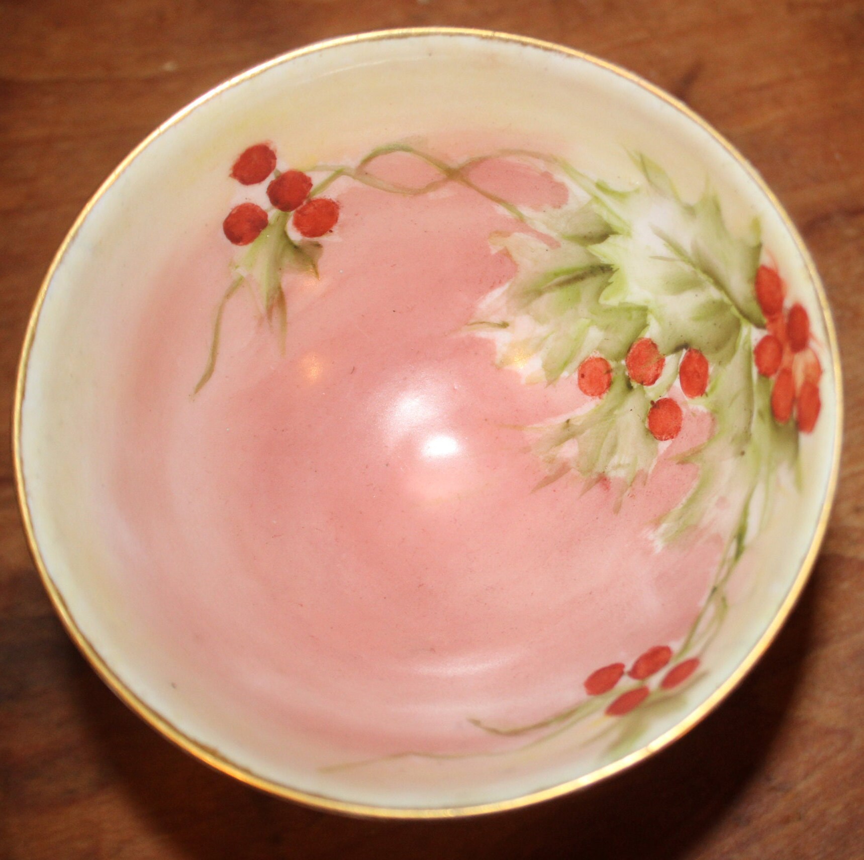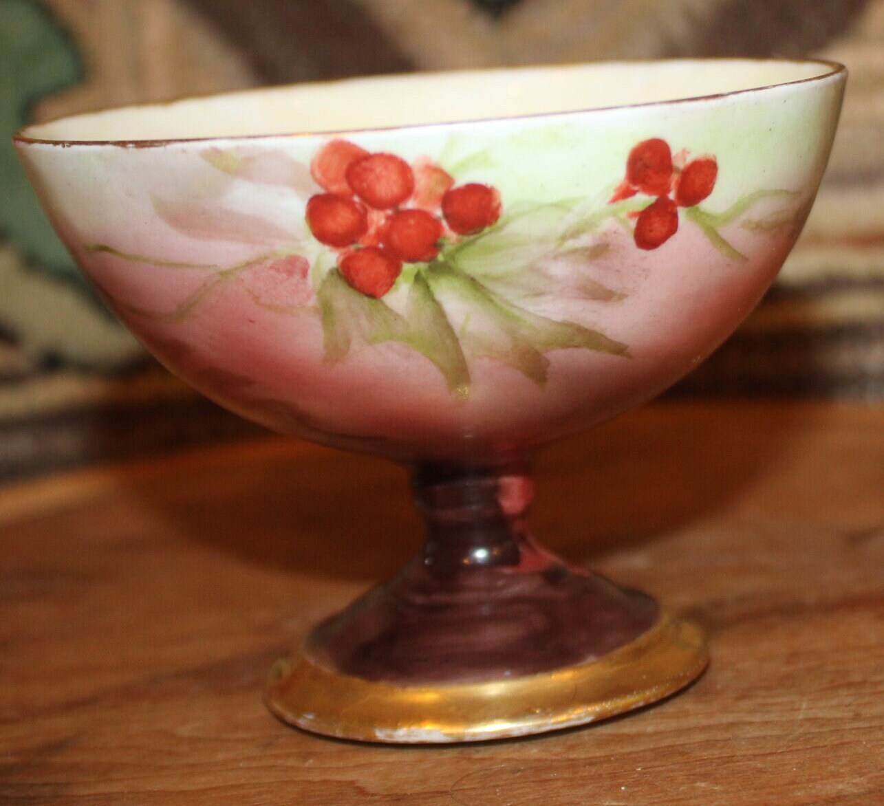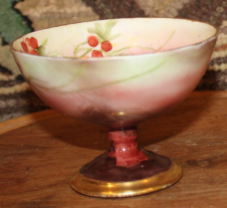 This Unsigned German Sherbet Cup Compote is so gorgeously painted and detailed- the holly is handpainted to the interior of the bowl as well as the exterior; the rim and base are finished with gold gilt. It measures approximately 3.75 in diameter x 2.75 tall; it is fantastic condition with no chips or cracks.