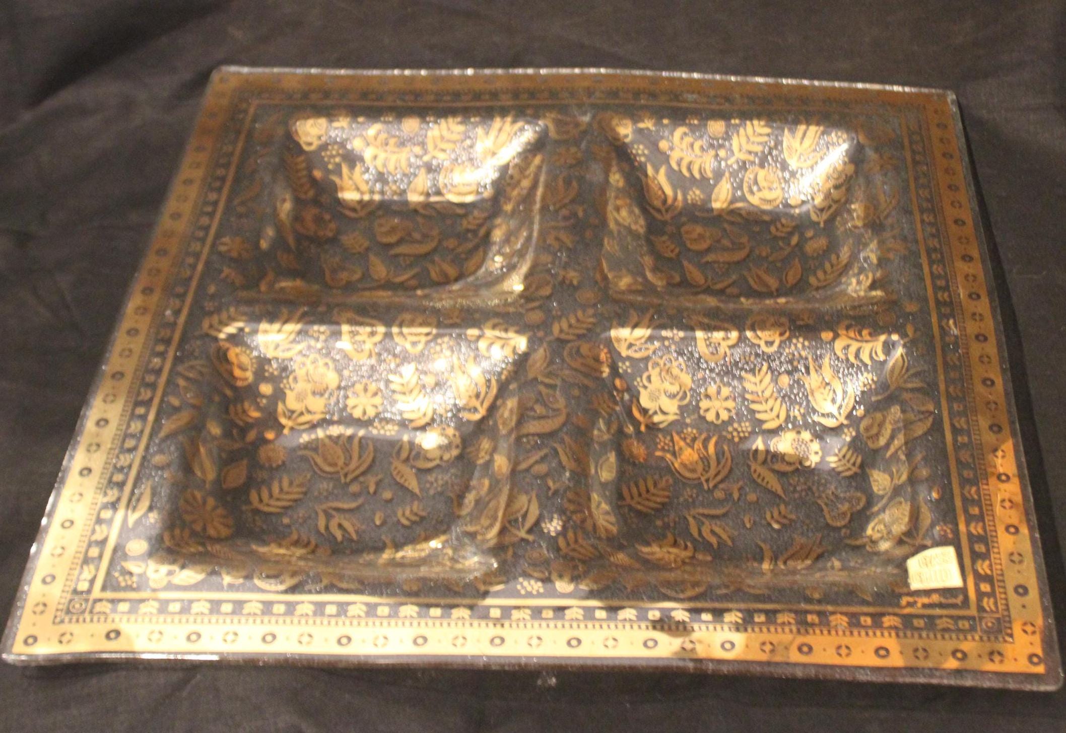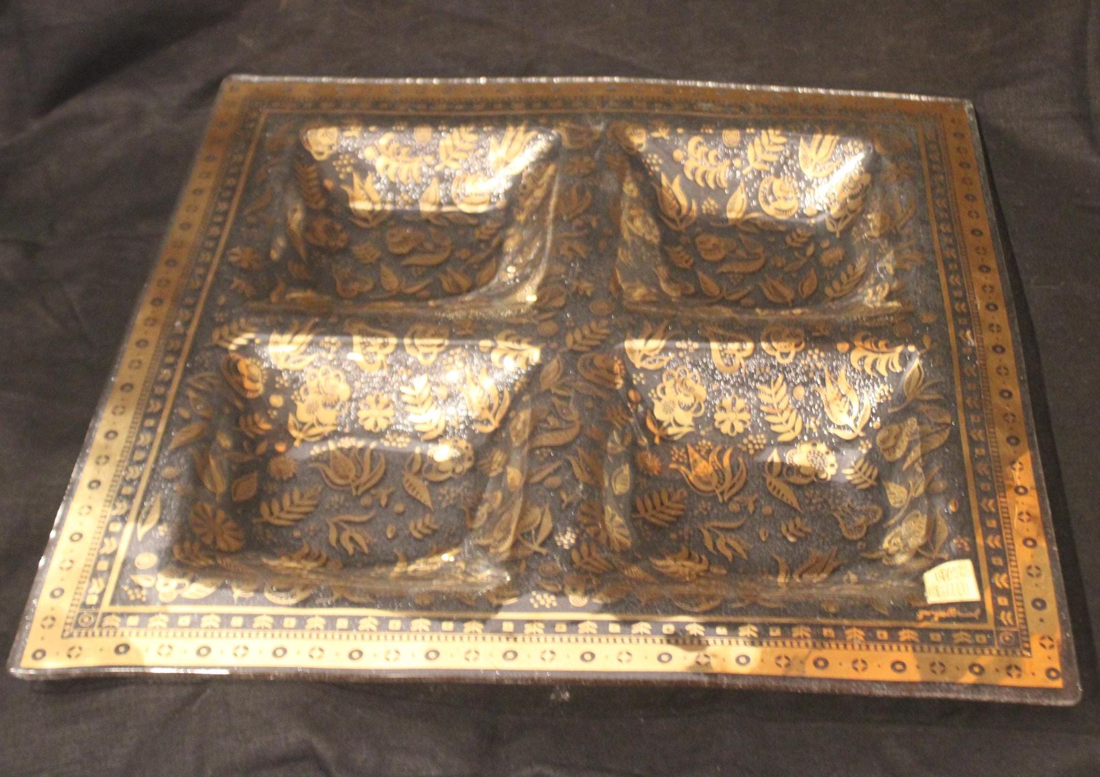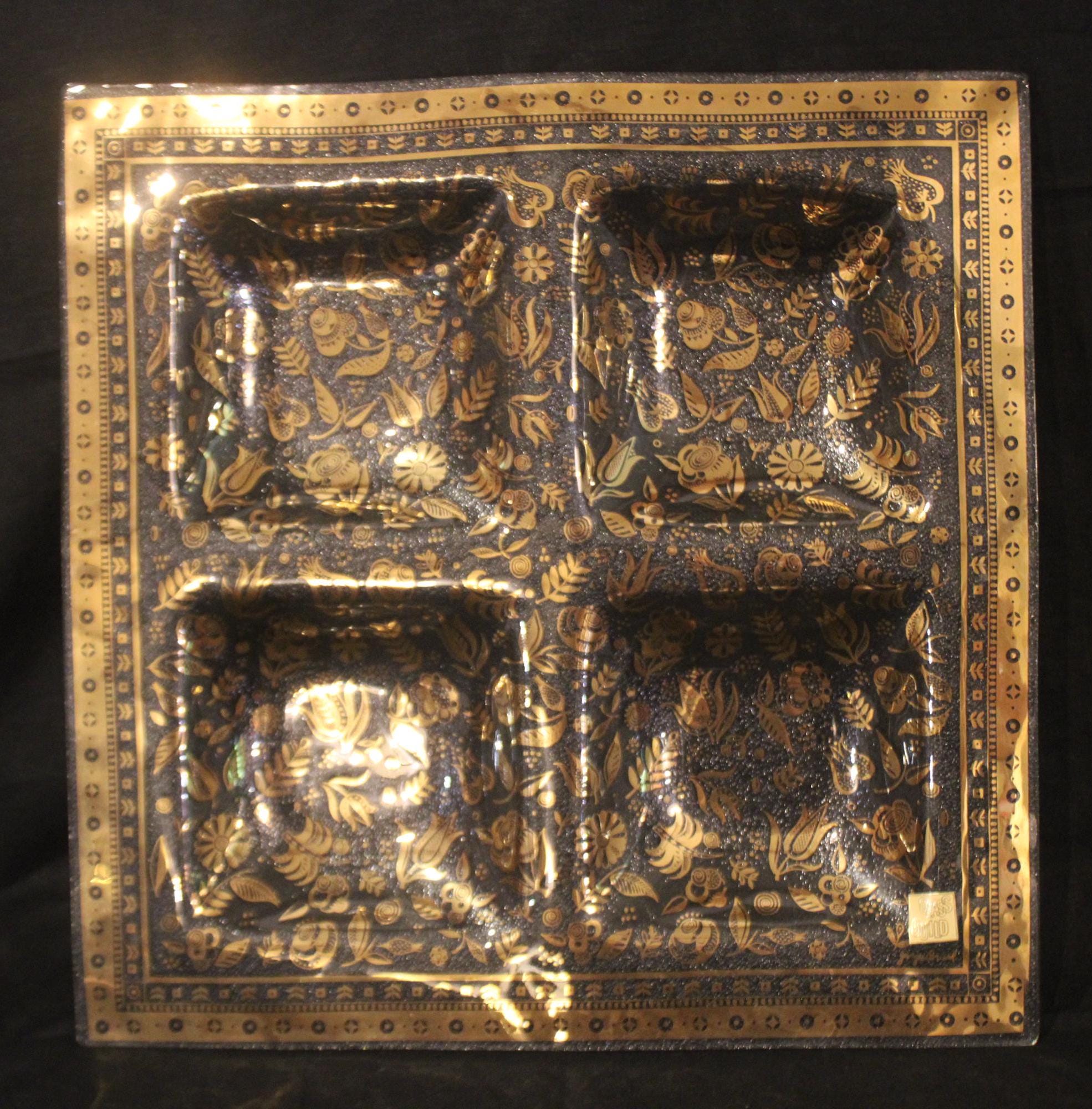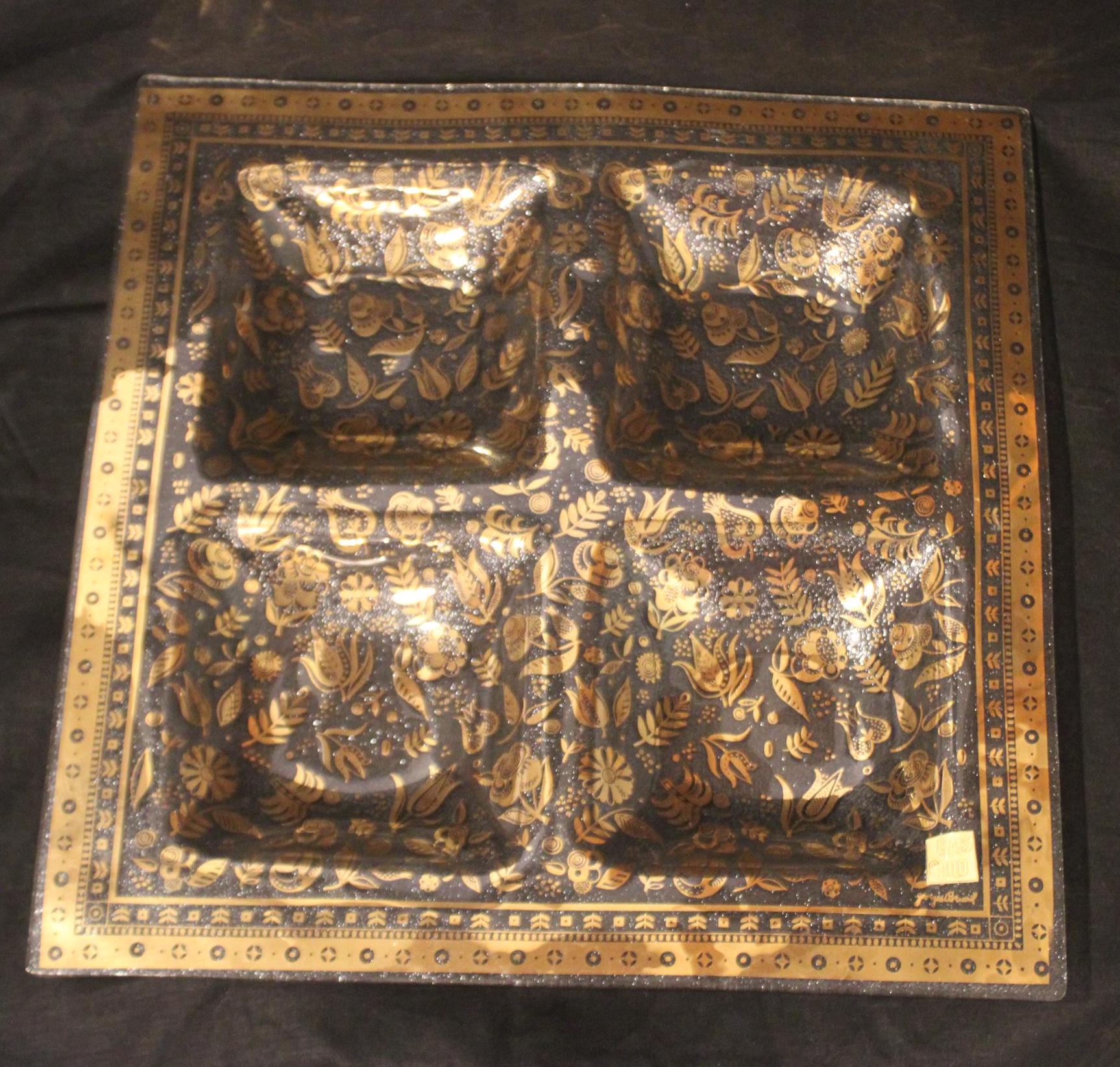 This Gorgeous Mid Century Signed George Briard Gold Glass Persian Garden Forbidden Fruit Tray is available to you! It would make such a nice wedding gift to be cherished for a lifetime- perfect to serve appetizers to family and friends! The gold gilt design is in great condition with no wear (the original sticker is located in the bottom right corner above George Briard's signature). It is 15" x 15" with four 5" square compartments. It has no chips or cracks. Please message us if you have any questions- Thanks for looking!
