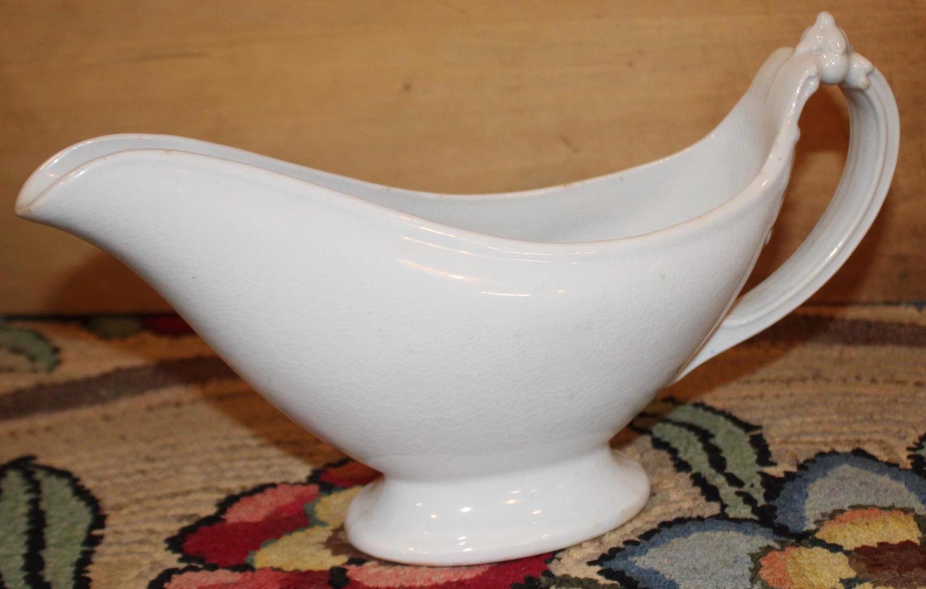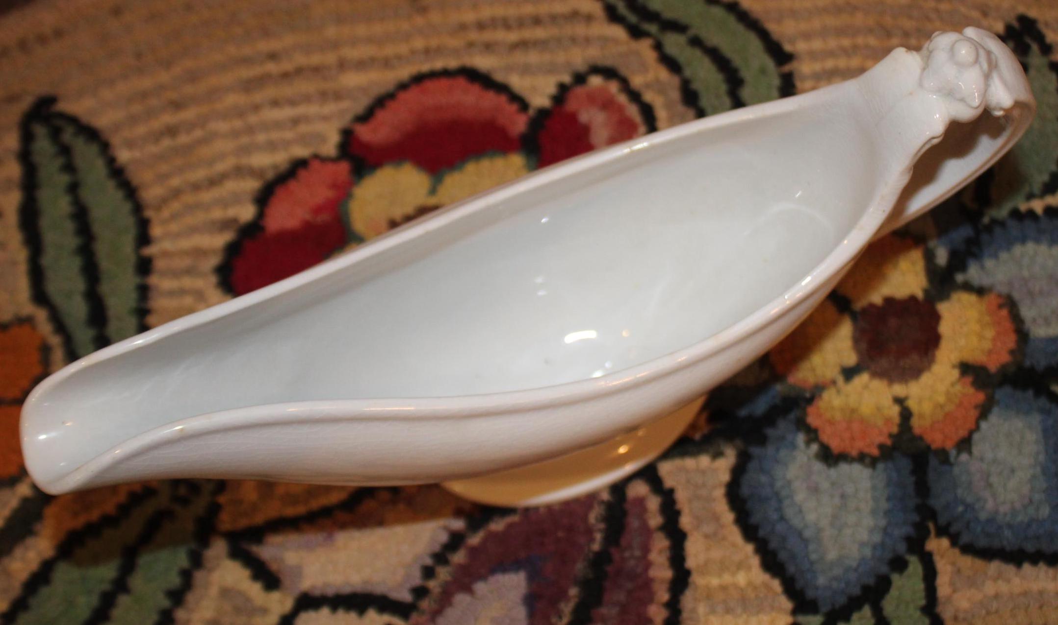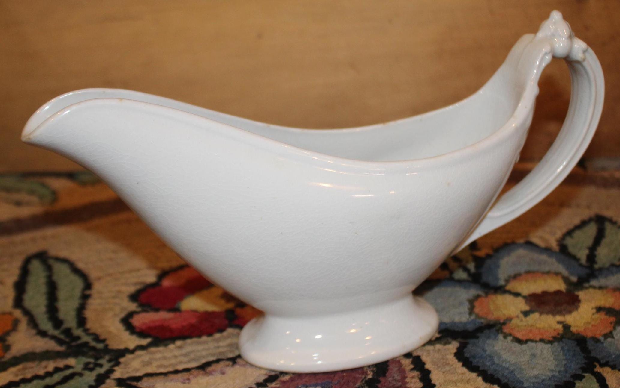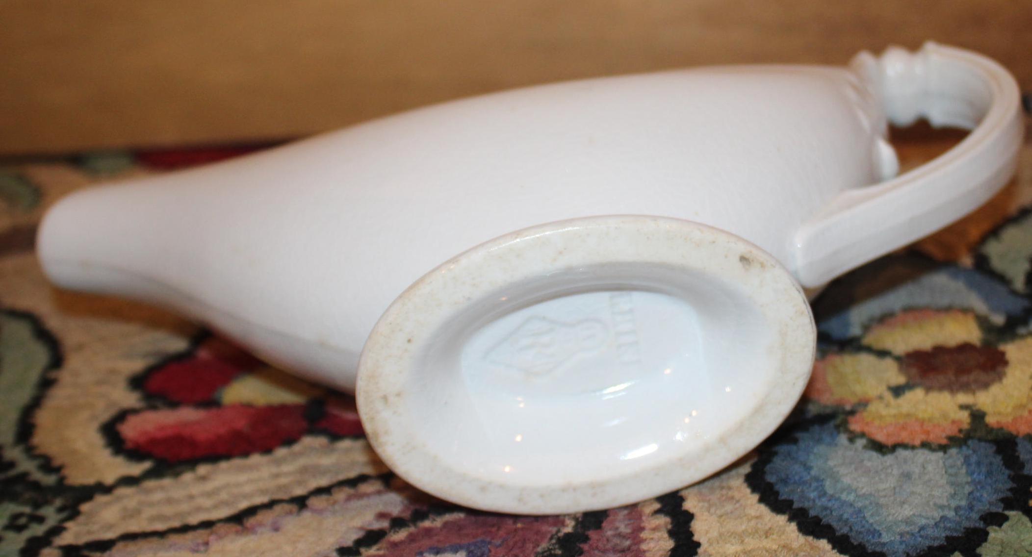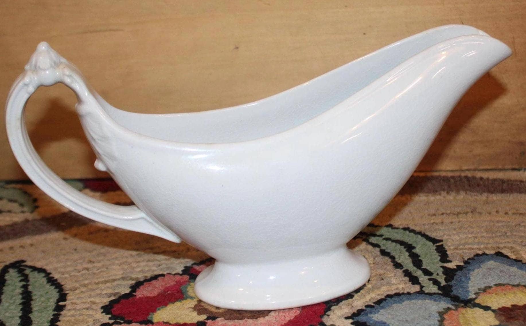 This Early English White Ironstone Gravy Pitcher would be a great addition to your ironstone collection! It is approximately 10” long”x 5” tall x 2.5" wide. It is in wonderful condition with no chips or cracks. It would be perfect for display or to use for you next family dinner- the ultimate vessel to hold bernaise or horseradish sauce- or of course gravy for your turkey dinner! Please message us if you have any questions- Thanks for looking!