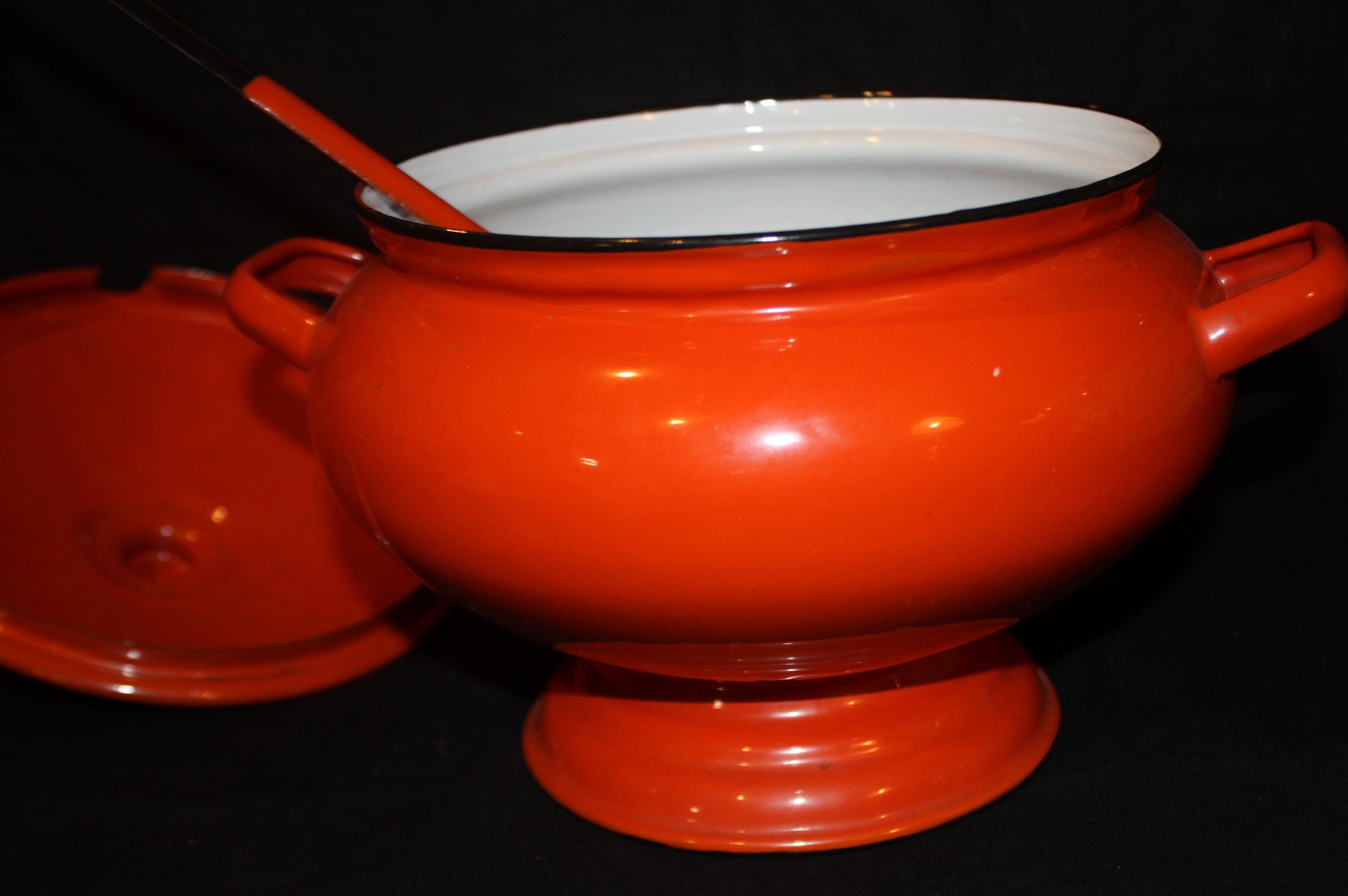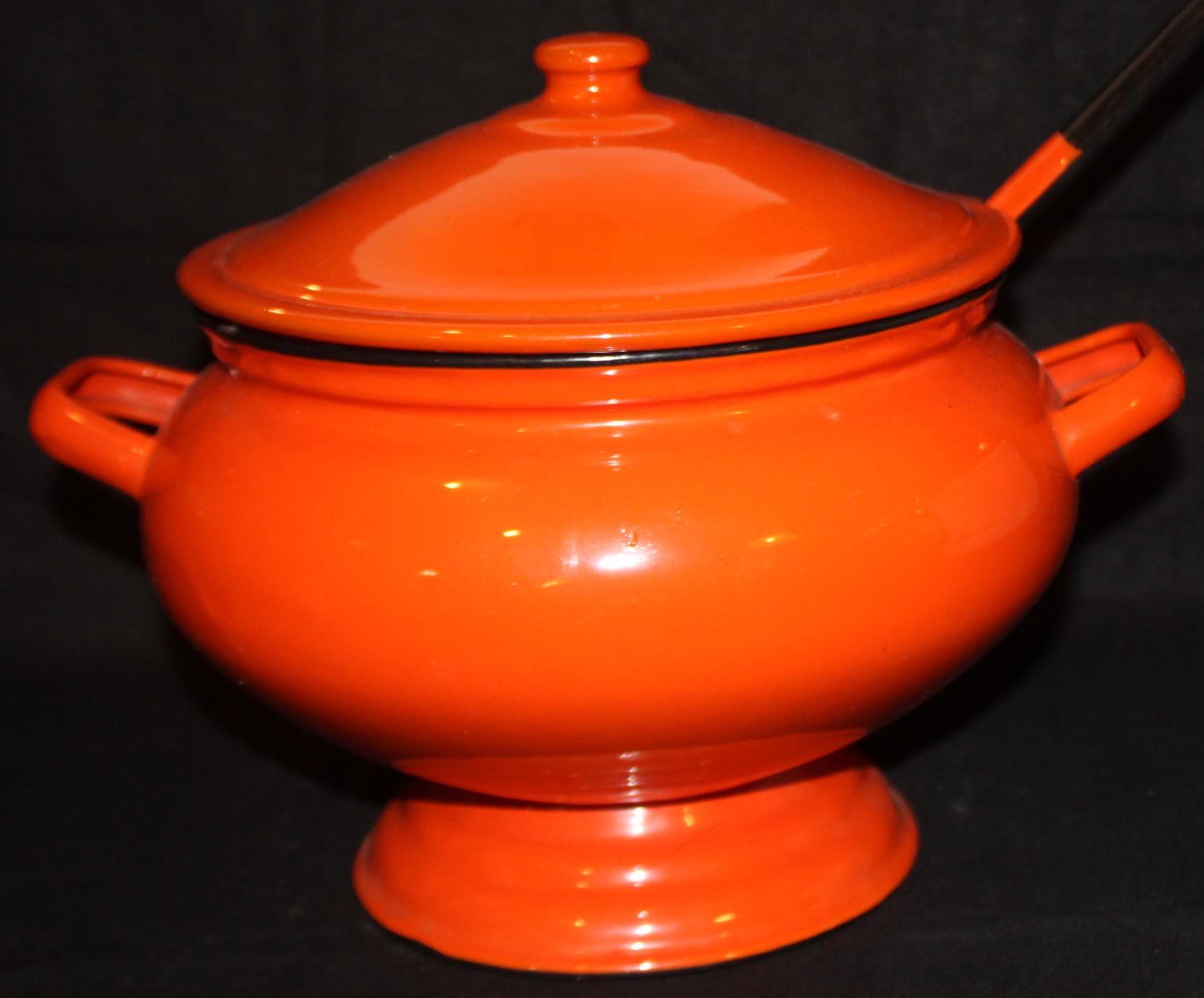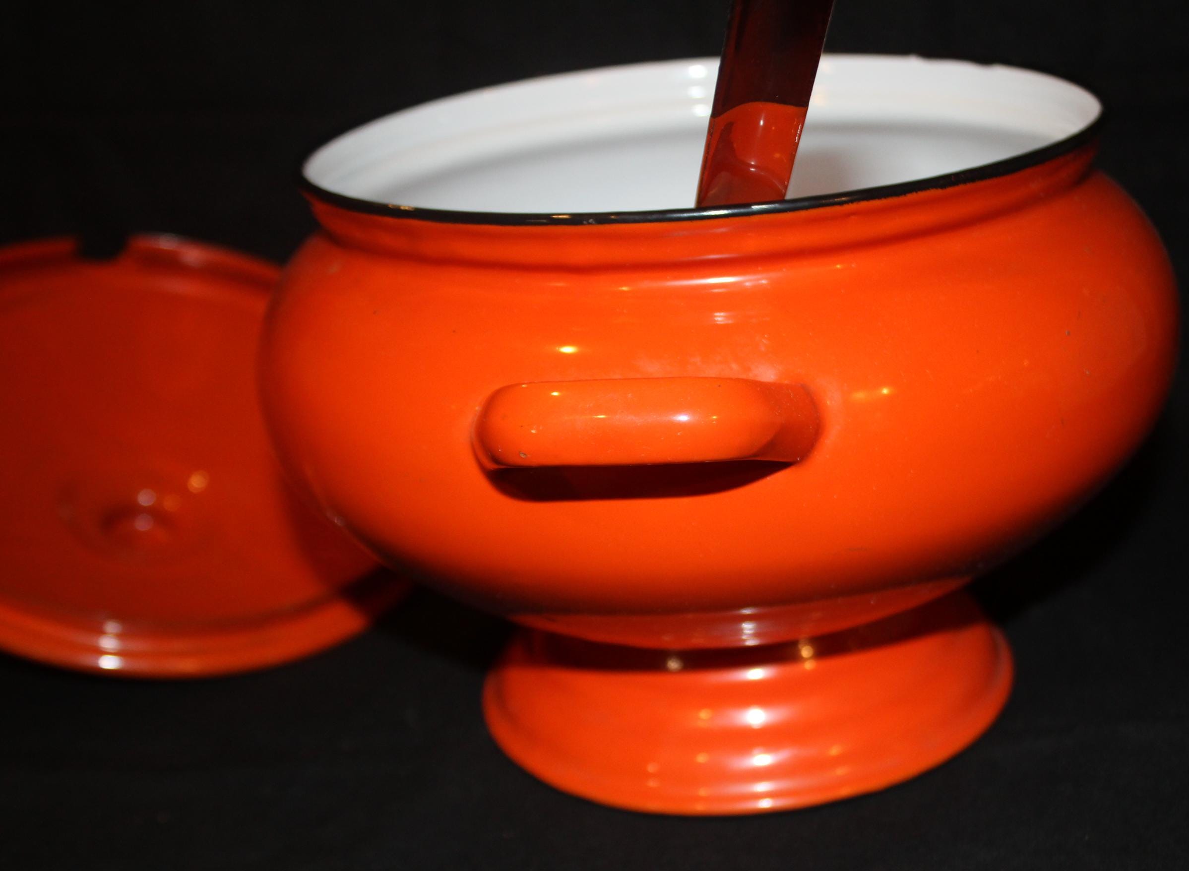Wonderful Enamelware Orange Soup Tureen with Ladle- Halloween/Soup/Fall Decor