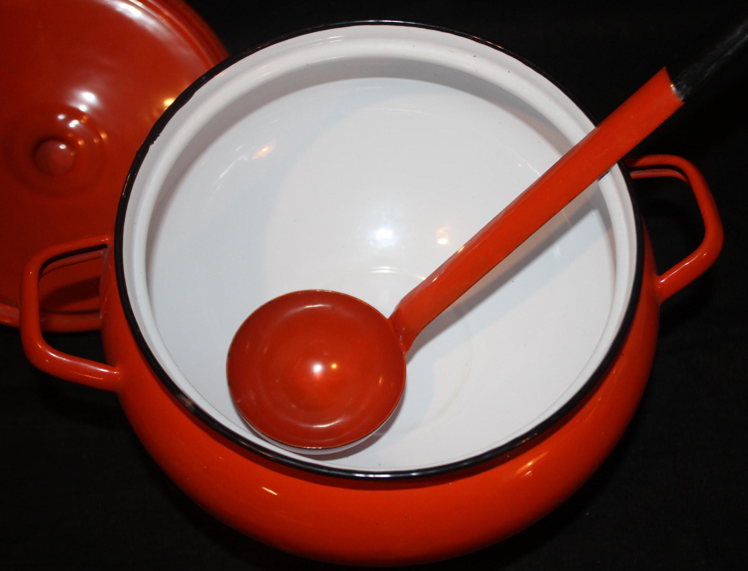 This Wonderful Enamelware Orange Soup Tureen with the matching Ladle is available just in time for the Fall- perfect for your favorite Fall stew or soup- or for "that" Halloween witch's brew! It measures 8" in diameter at the opening and is 6.5" high to the top rim of the bowl and 9.5" tall with the lid on; it holds 2.5 quarts. The orange enamel is in great condition with no chips or cracks. Please message us if you have any questions- Thanks for looking!
