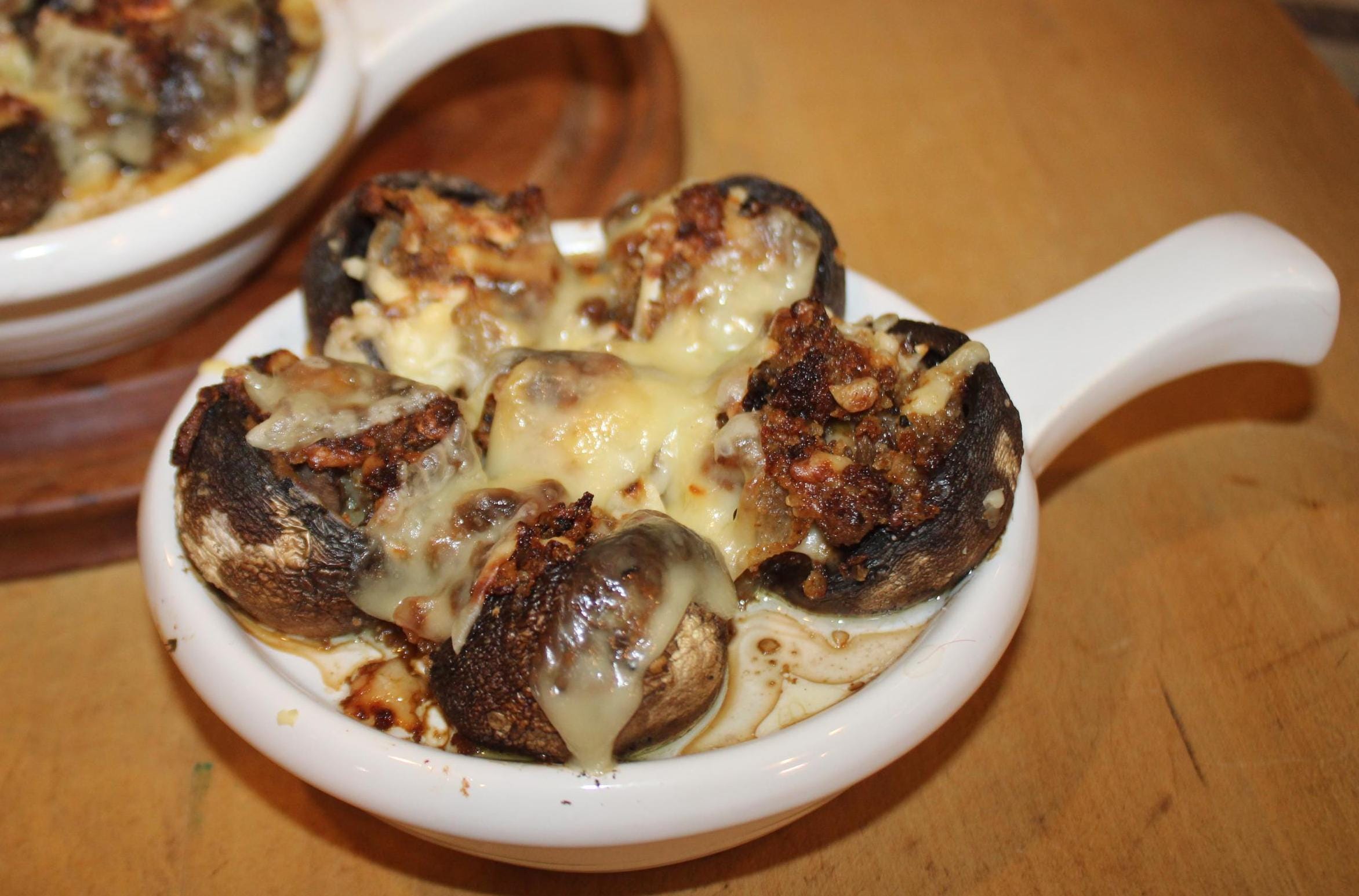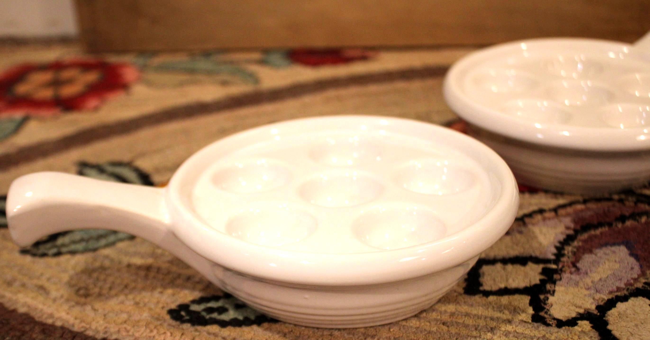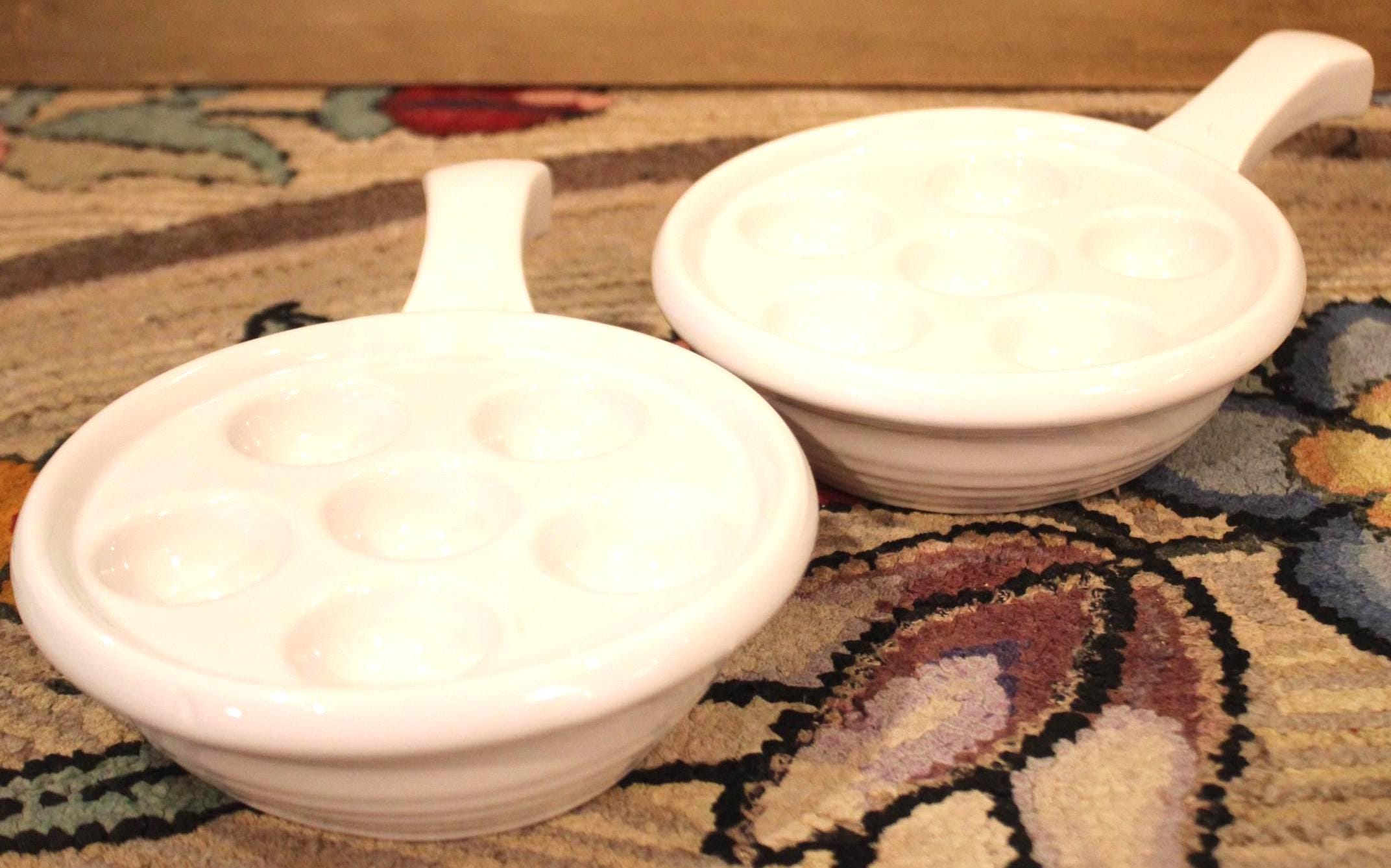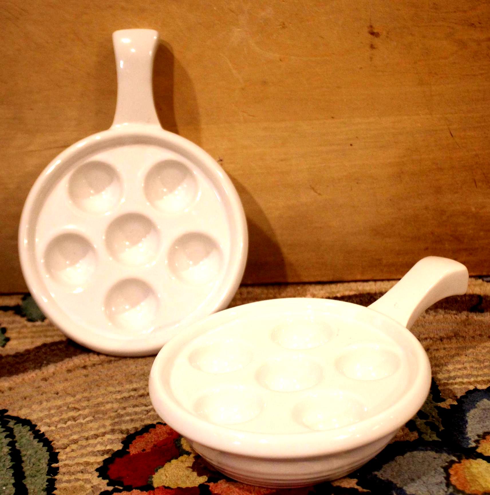 This Set of Two Heavy White Escargot/Stuffed Mushroom Dishes would be a lovely addition to your dinnerware collection! Saute some chopped garlic, shallots, and parsley in butter and chardonnay; then pour over the escargot positioned in the dish- bake in the oven at 375 degrees for 15 minutes- and WOW your guests! The escargot (which is precooked can be ordered through Amazon).