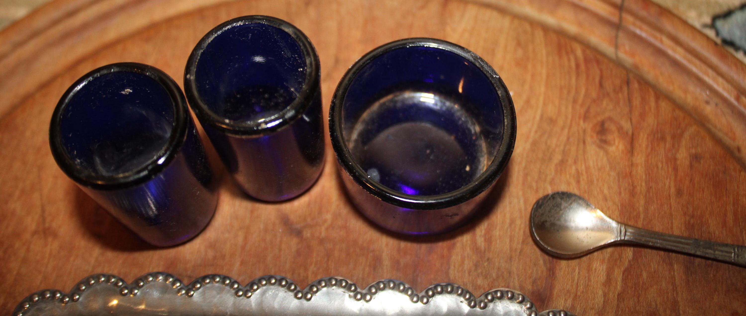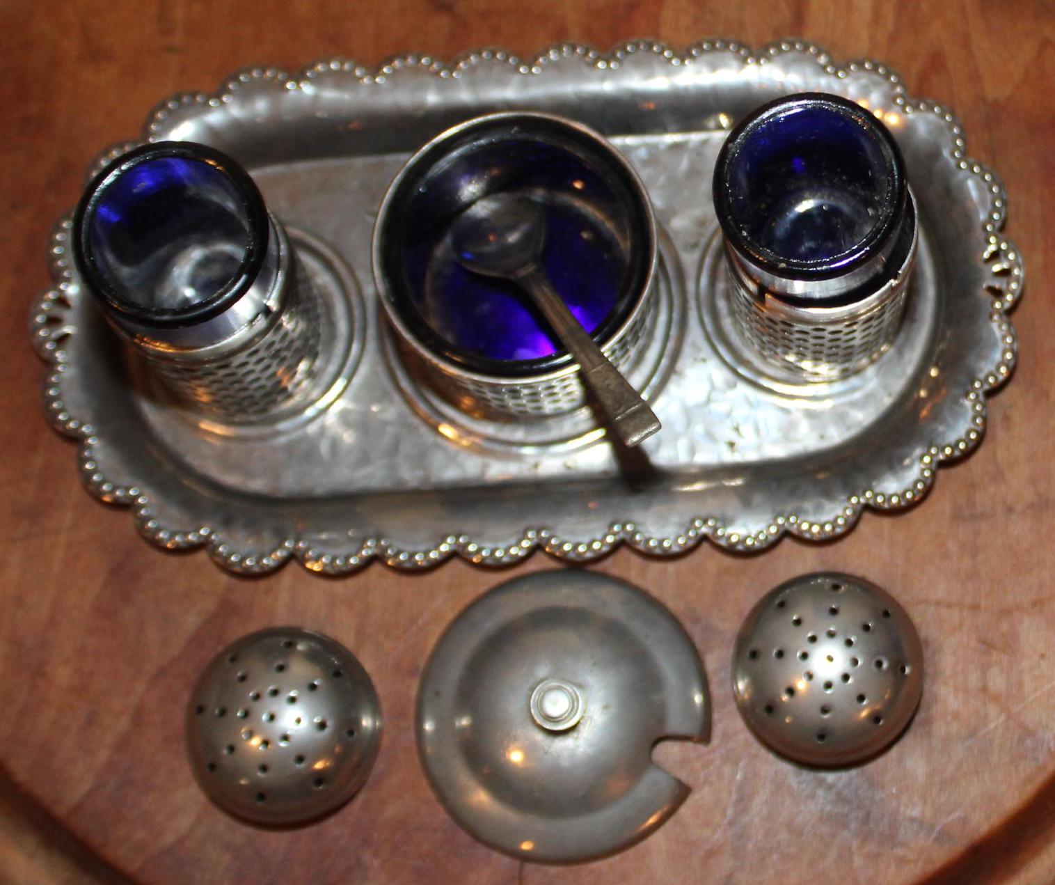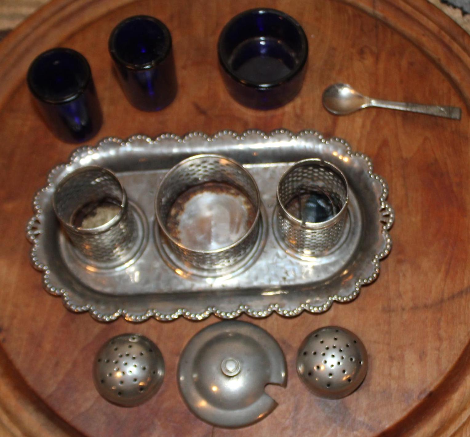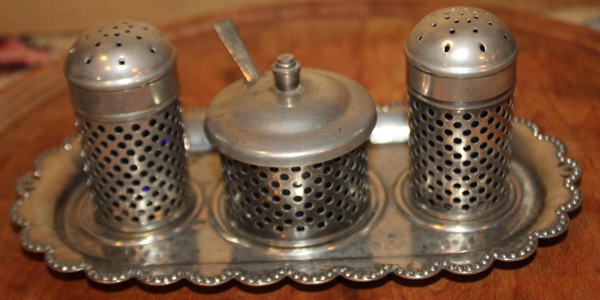 This Wonderful Sheffield Silverplate Salt, Pepper, and Mustard Pot would be a great addition to your dinnerware! It is beautifully crafted of plated silver with cobalt blue inserts. The tray measures 6.5" in length x 3.5" wide; the shakers stand 2.5" tall. While their are no dents- there is some corrosion on the top of the tray and the spoon (please see our photos). Please message us if you have any questions- Thanks for looking!