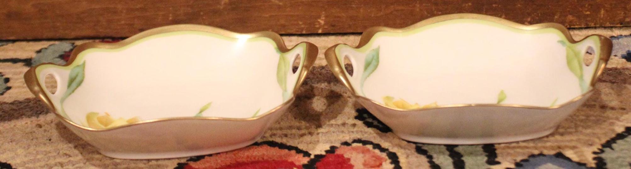 This Matching Pair of Bavaria Hand Painted Porcelain Trinket Dishes is available to you! They are in gorgeous condition with no chips, cracks, hairlines, or scratches. Each measures 5.5" x 5" x 1"; the back of each is numbered 3066/64 with the P.T. shield. Please message us if you have any questions- Thanks for looking!