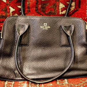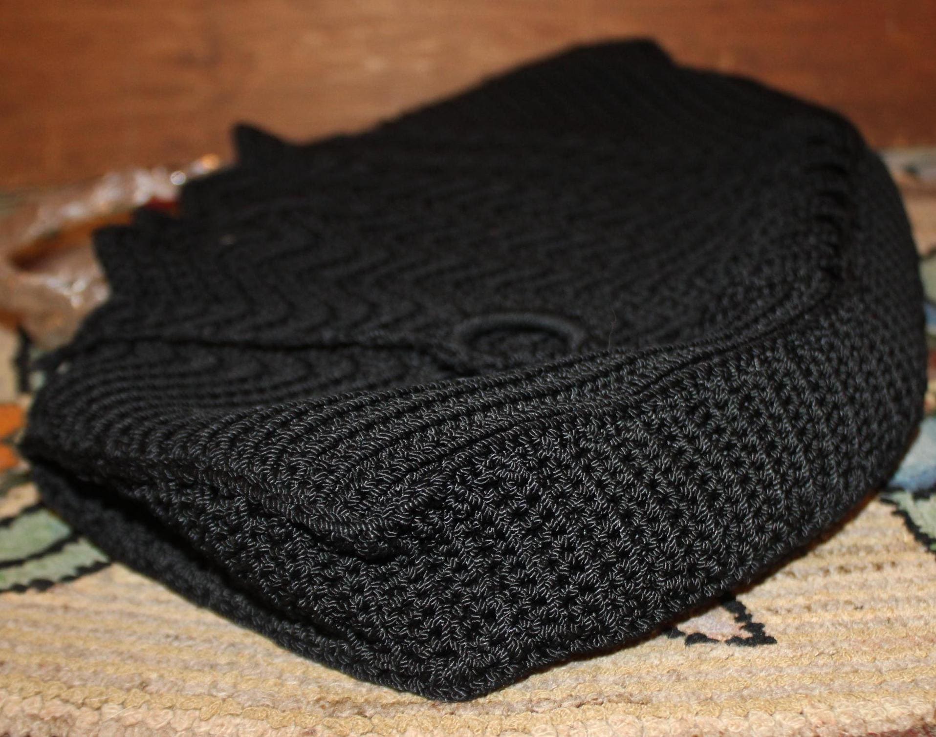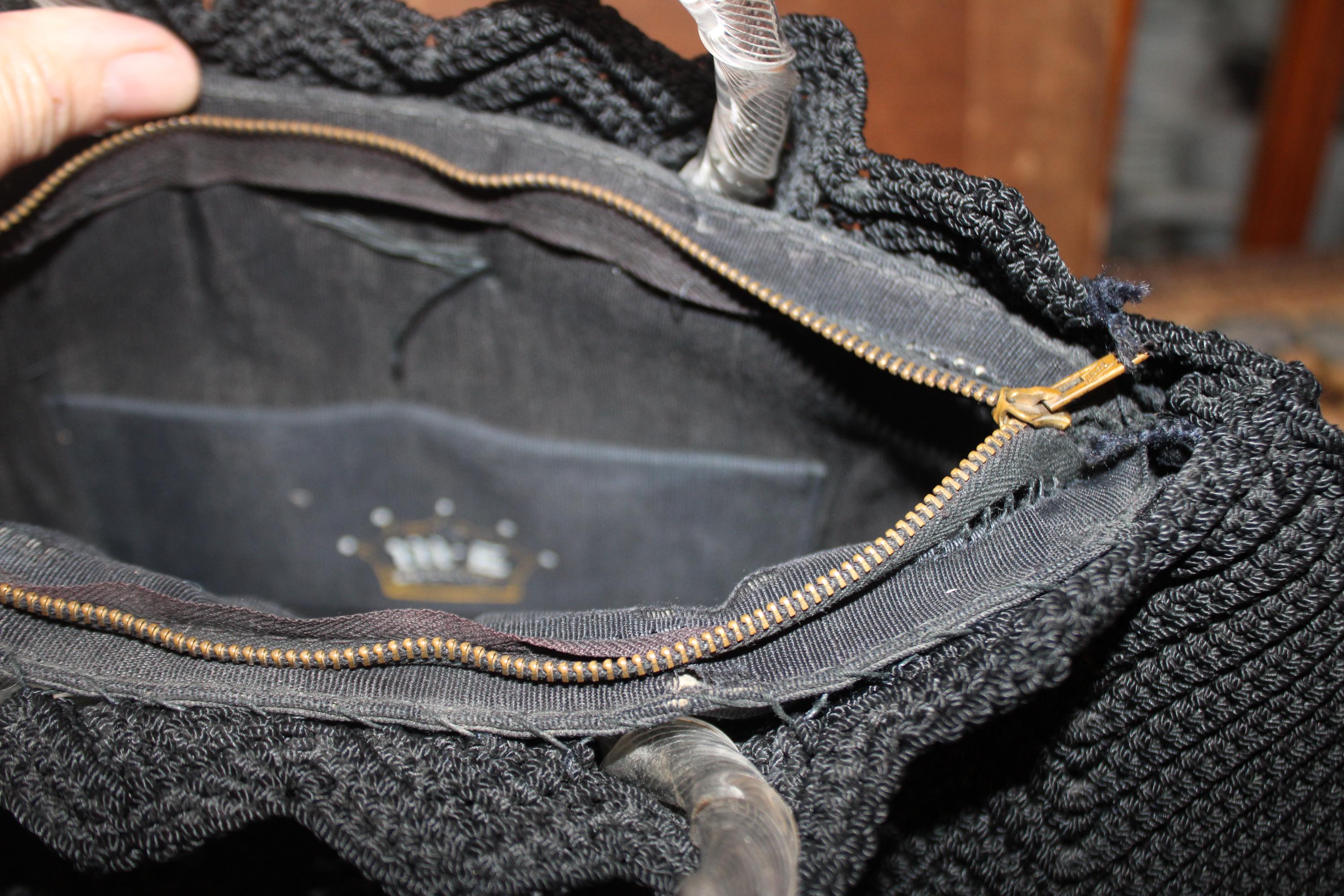 This Vintage 1940's ME Products Lucite Handled Black Crochet Hand Bag is very chic and well made- the intricate crochet zigzag pattern, the lined interior, and the beautiful swirled Lucite handles are some fantastic elements that make this bag so elegant- not to mention it will look fabulous with your little black dress! The purse measures 16" wide X 10.5" tall including the handles; the top zipper is about 8.5 long. There is a 1" wide unzippered pocket in the interior. There are no tears, snags, or breaks; the zipper opens and closes easily. The perfect vintage bag that is large enough to hold everything (cell phone, tissues, lipstick, wallet, your pistol...) but not too bulky! Please message us if you have any questios- Thanks for looking!