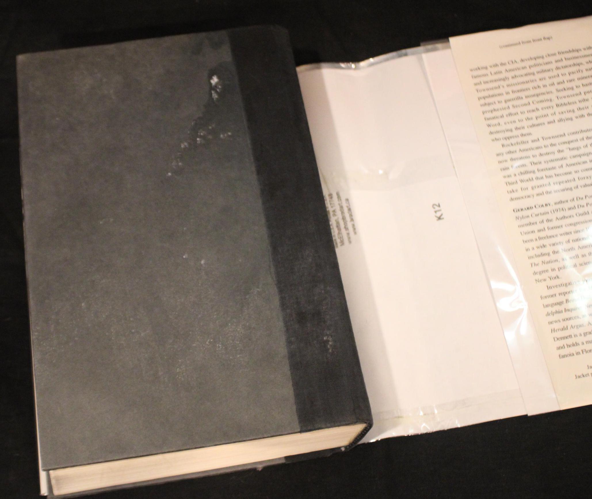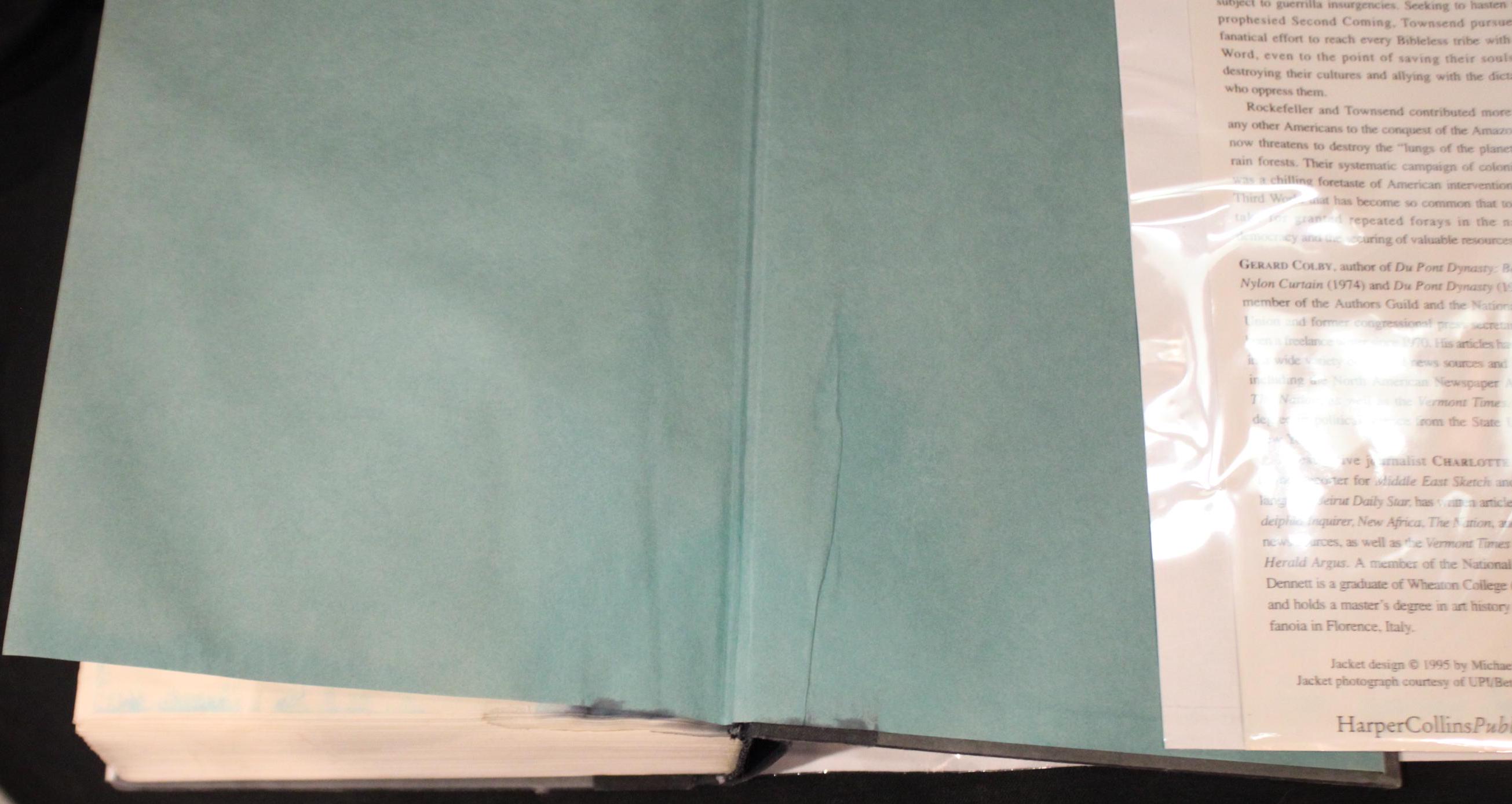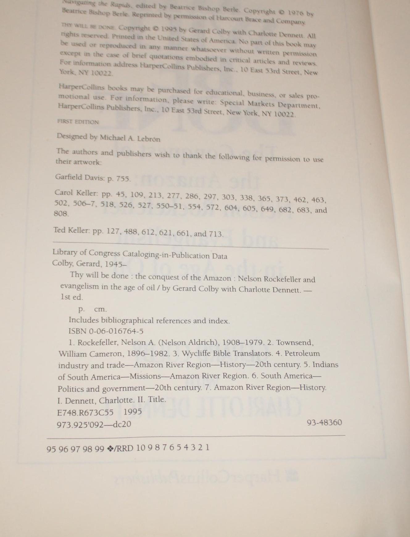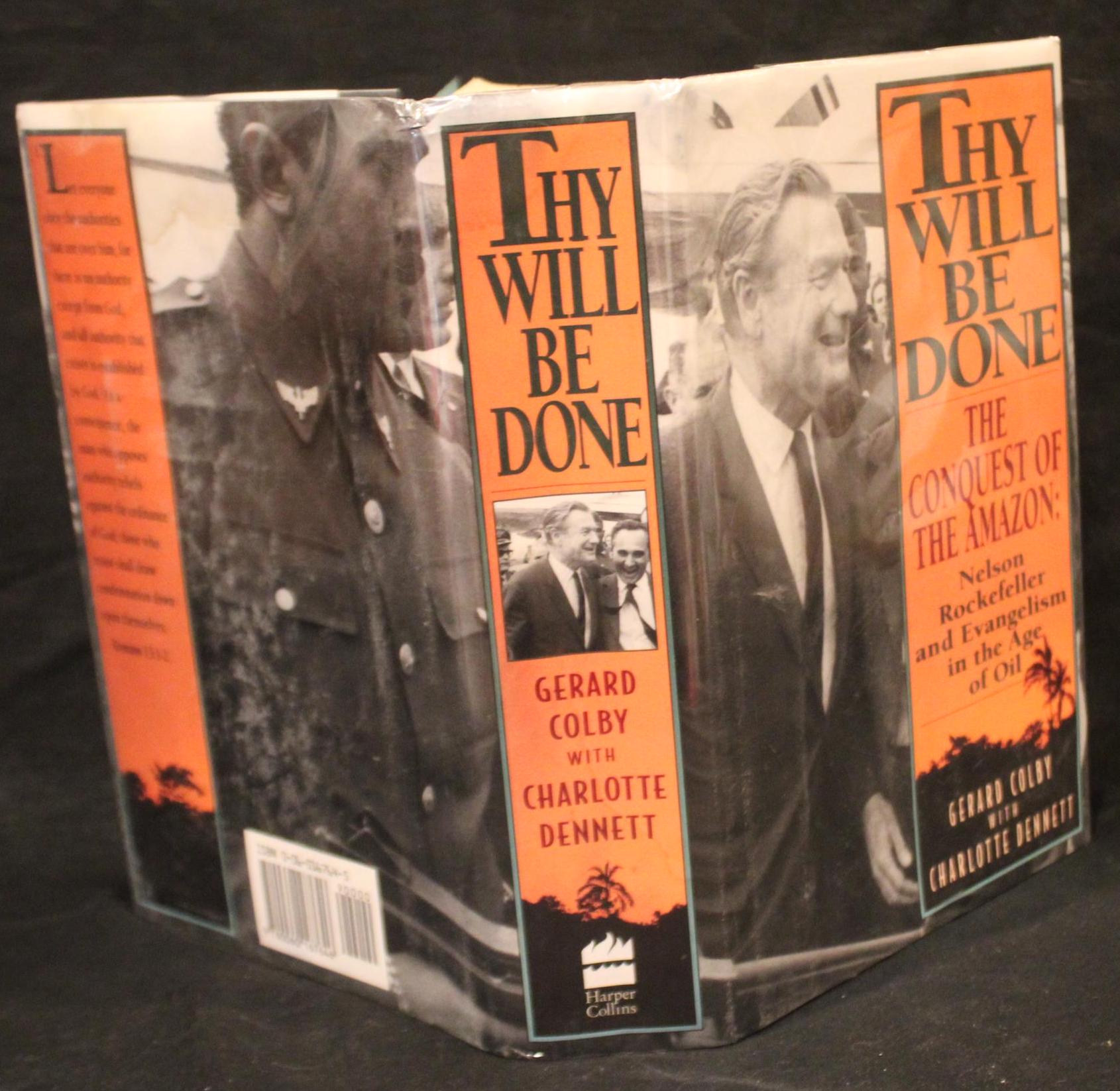 Thy Will Be Done: The Conquest of the Amazon by Gerald Colby. Hardcover. First Edition-complete number line. Clean pages- index pages have some water staining and curling. Tight binding. Boards are in good condition; back board has some water staining. Dust jacket is in good condition and is protected in mylar. NOT ex-library. Overall this first edition is in good condition- at one time it was damaged by water- please see our photos. Please message us if you have any questions- Thanks for looking!