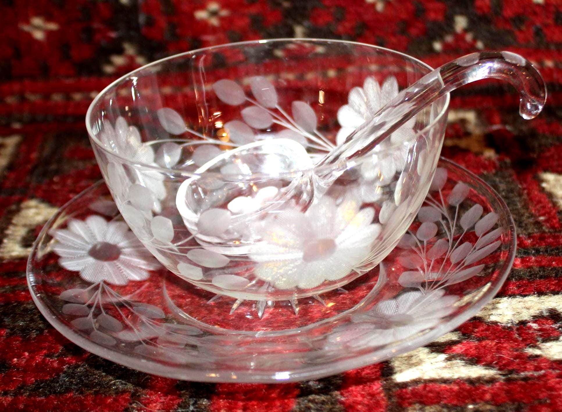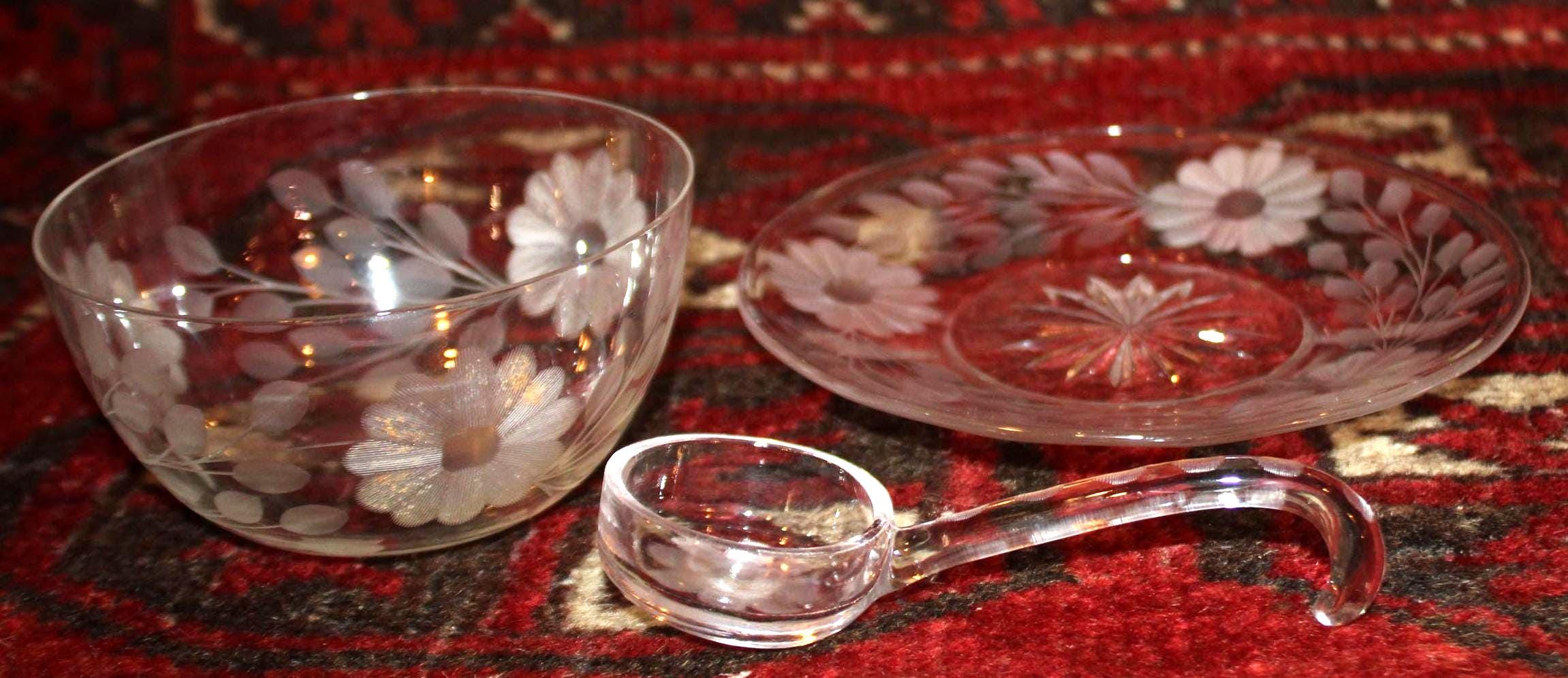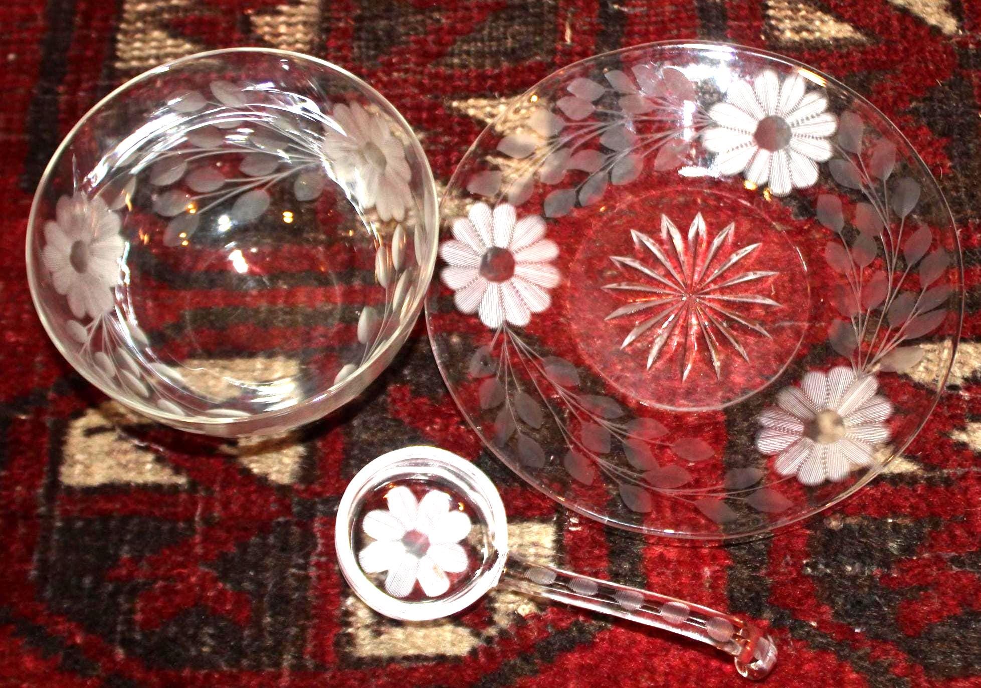 This Wonderful American Brilliant Period Daisies and Vines Etched Glass Relish Dish would be perfect to serve your delectable chutney or special sauce in at your next dinner party! The plate is 6.75 in diameter; the cup holds 1 cup (8 ozs). The floral etched bowl rests upon a matching saucer with a gorgeous matching ladle! A beautiful set with no chips or cracks. Please message us if you have any questions- Thanks for looking!
