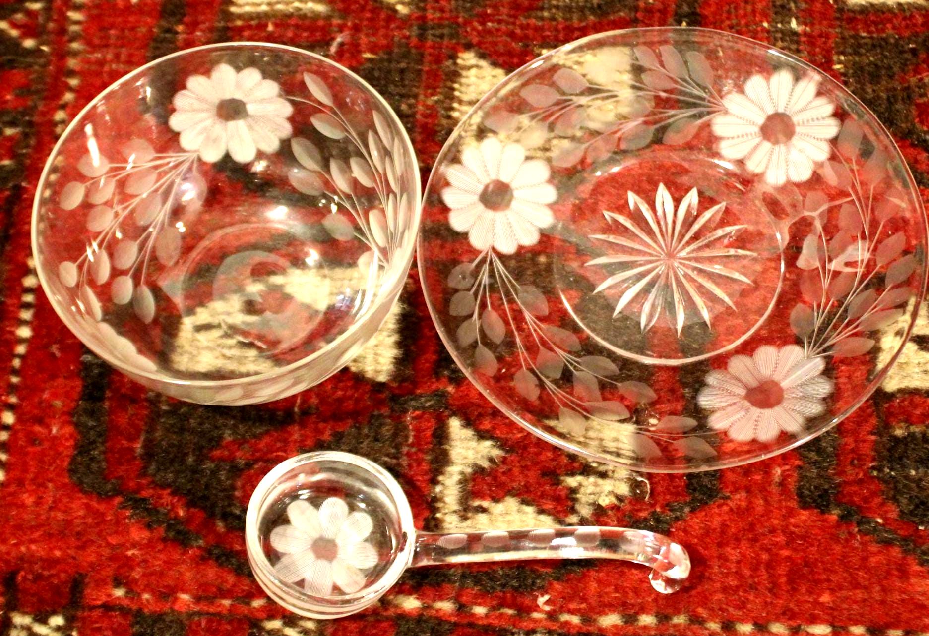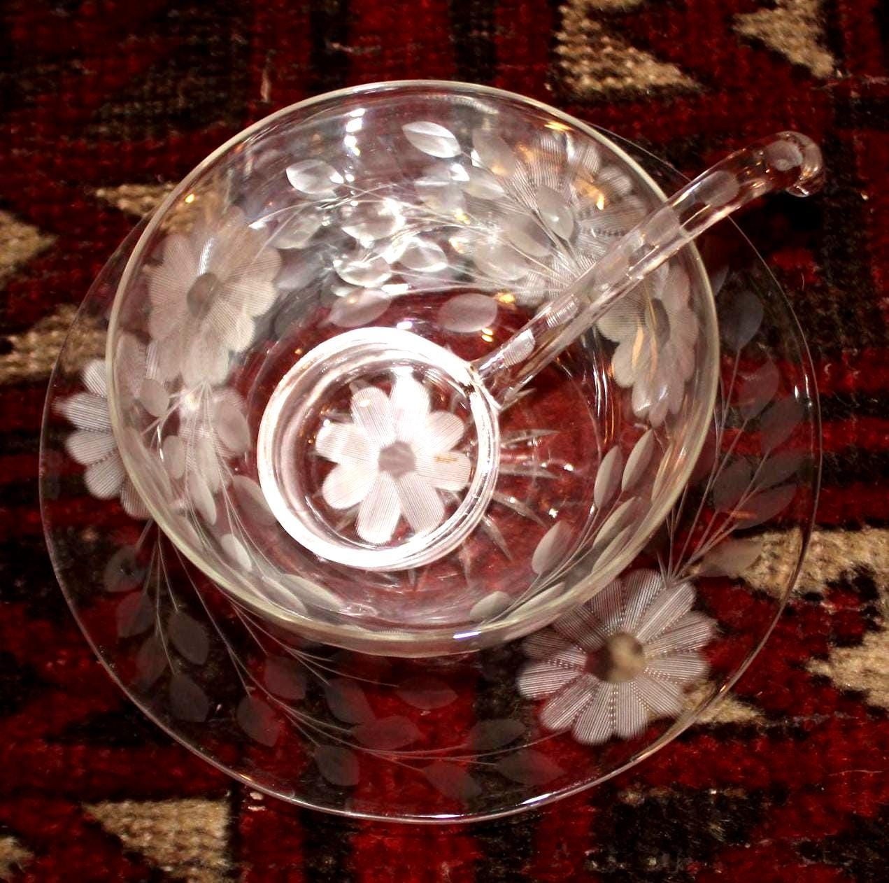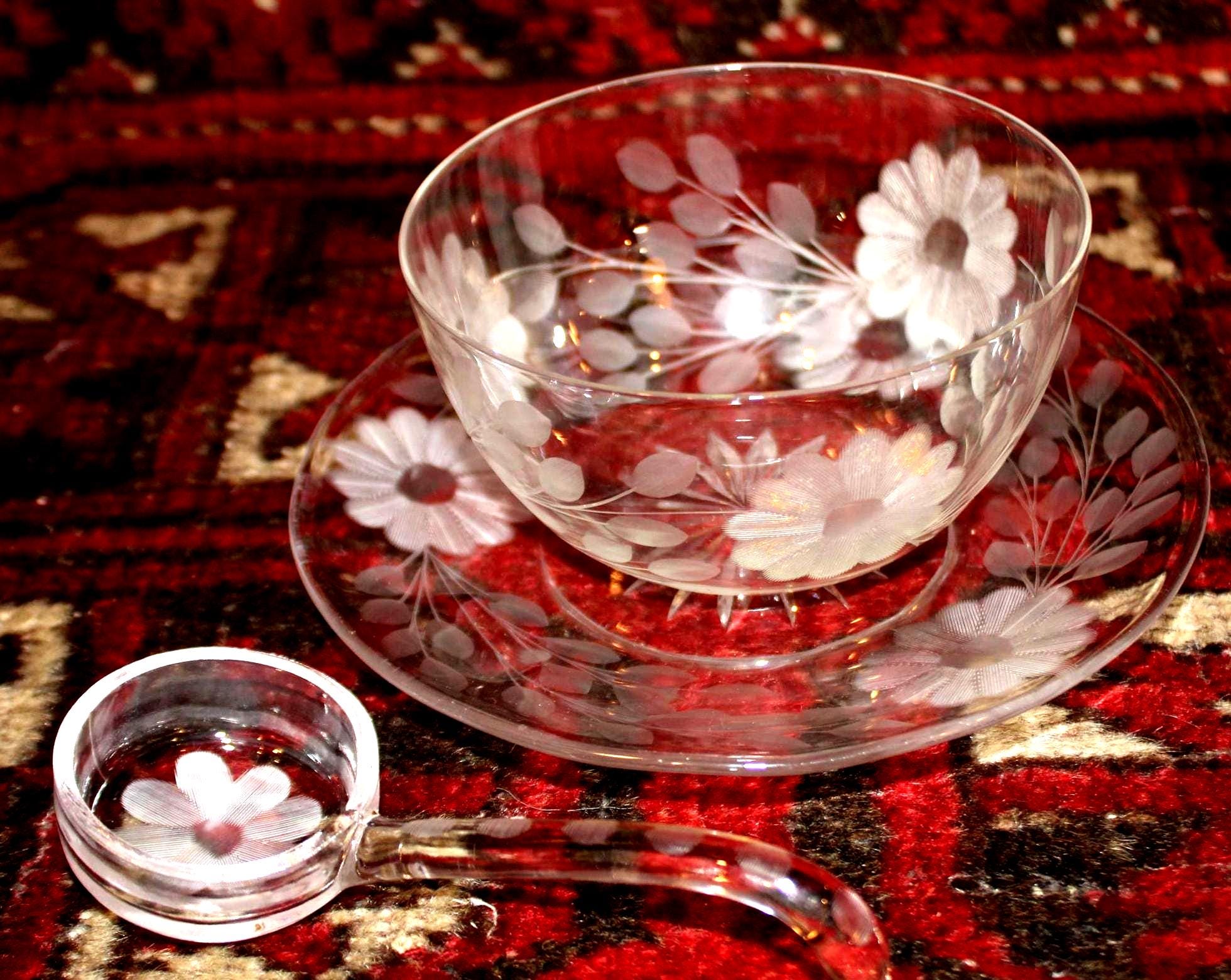 This Wonderful American Brilliant Period Daisies and Vines Etched Glass Relish Dish would be perfect to serve your delectable chutney or special sauce in at your next dinner party! The plate is 6.75 in diameter; the cup holds 1 cup (8 ozs). The floral etched bowl rests upon a matching saucer with a gorgeous matching ladle! A beautiful set with no chips or cracks. Please message us if you have any questions- Thanks for looking!
