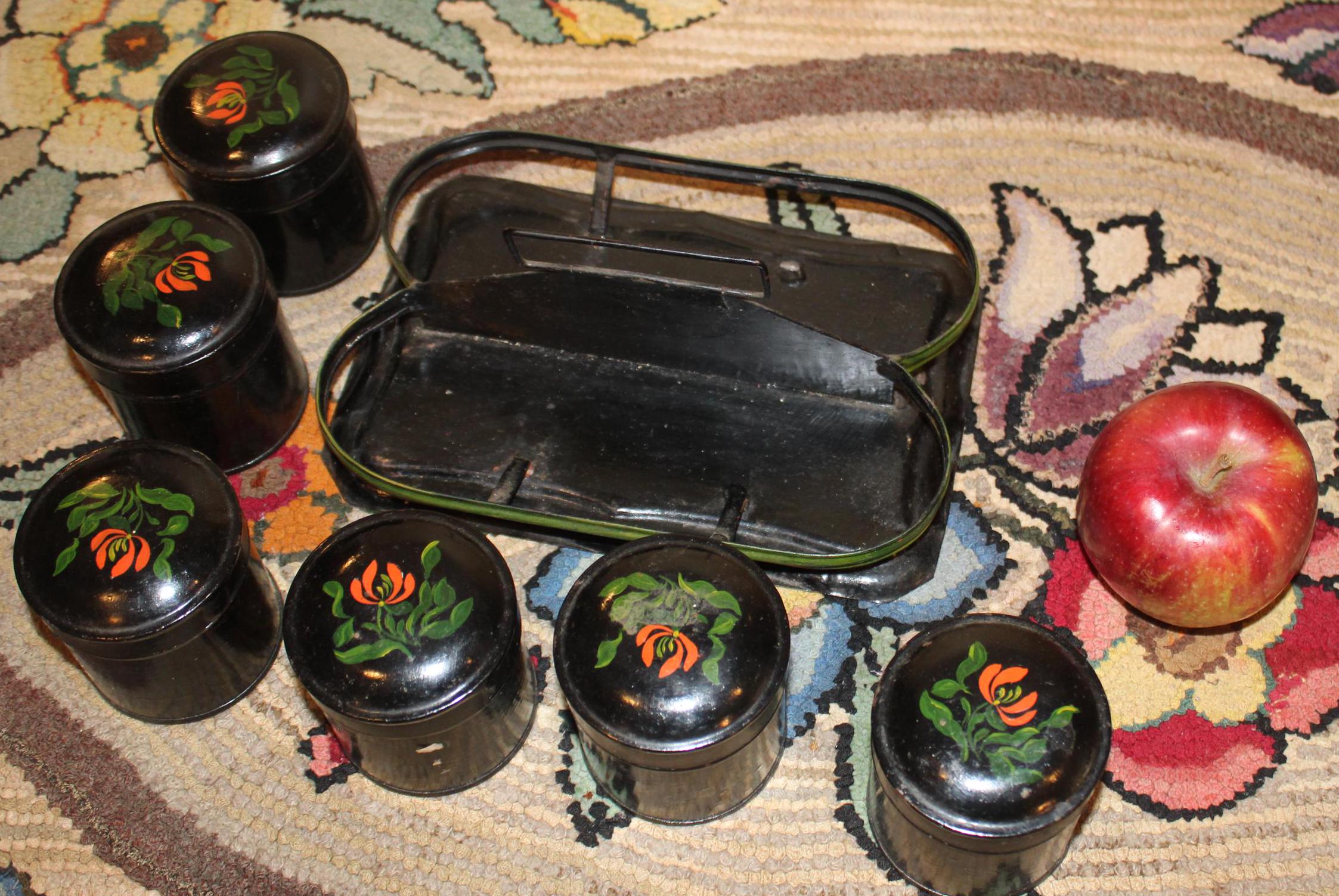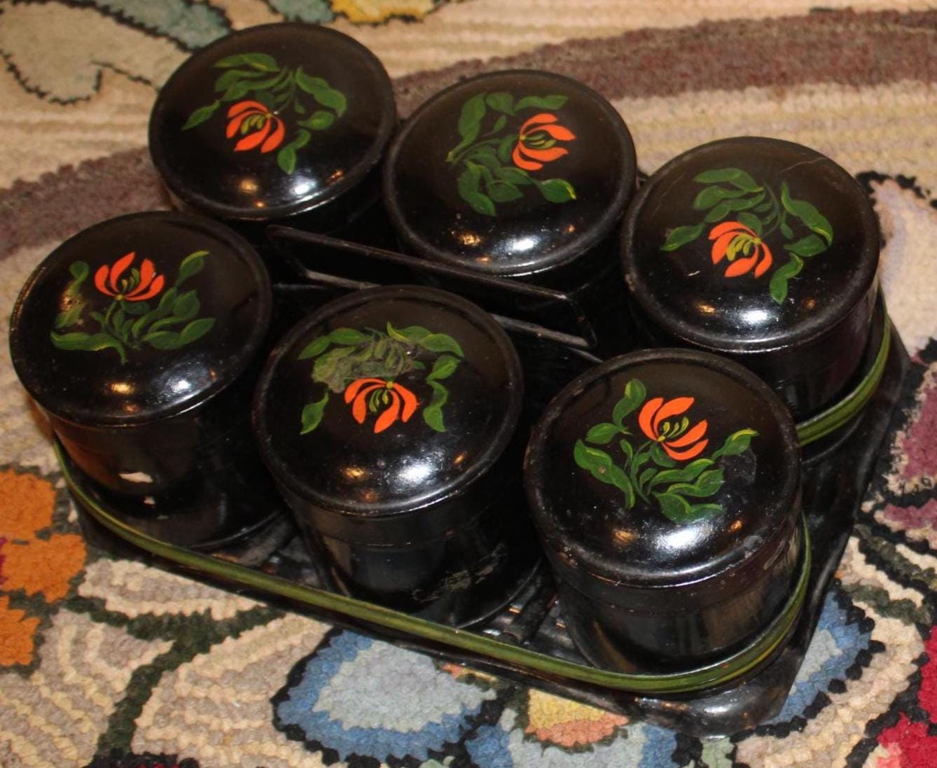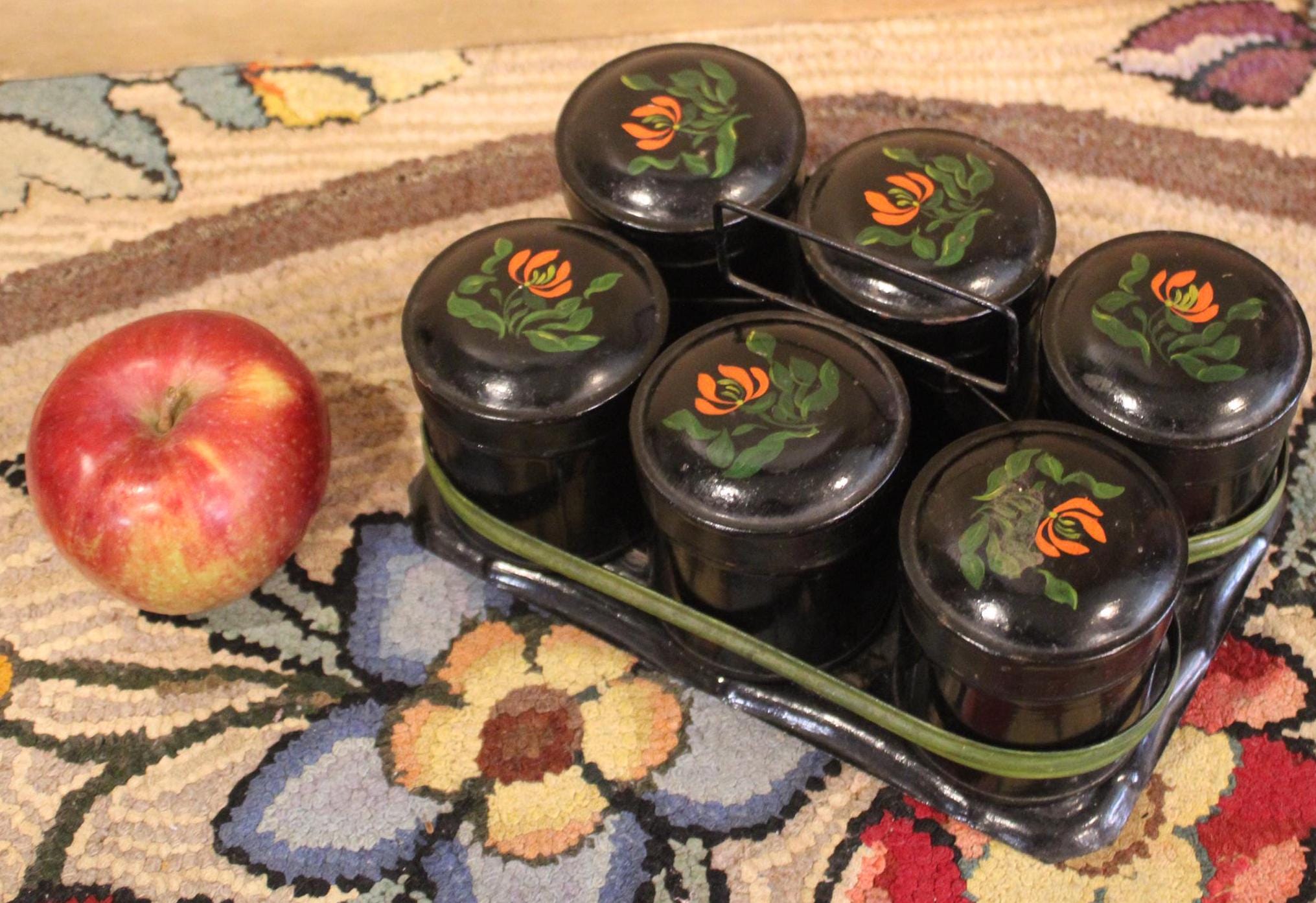 Vintage Handpainted Tin Tole Spice Set with Carrier- Farmhouse/Country/Storage