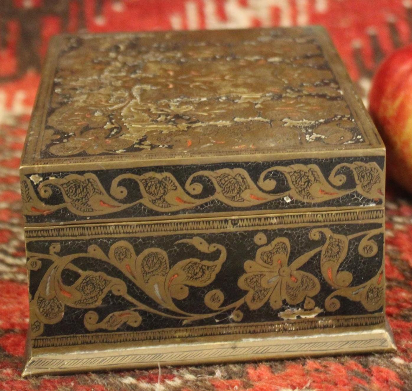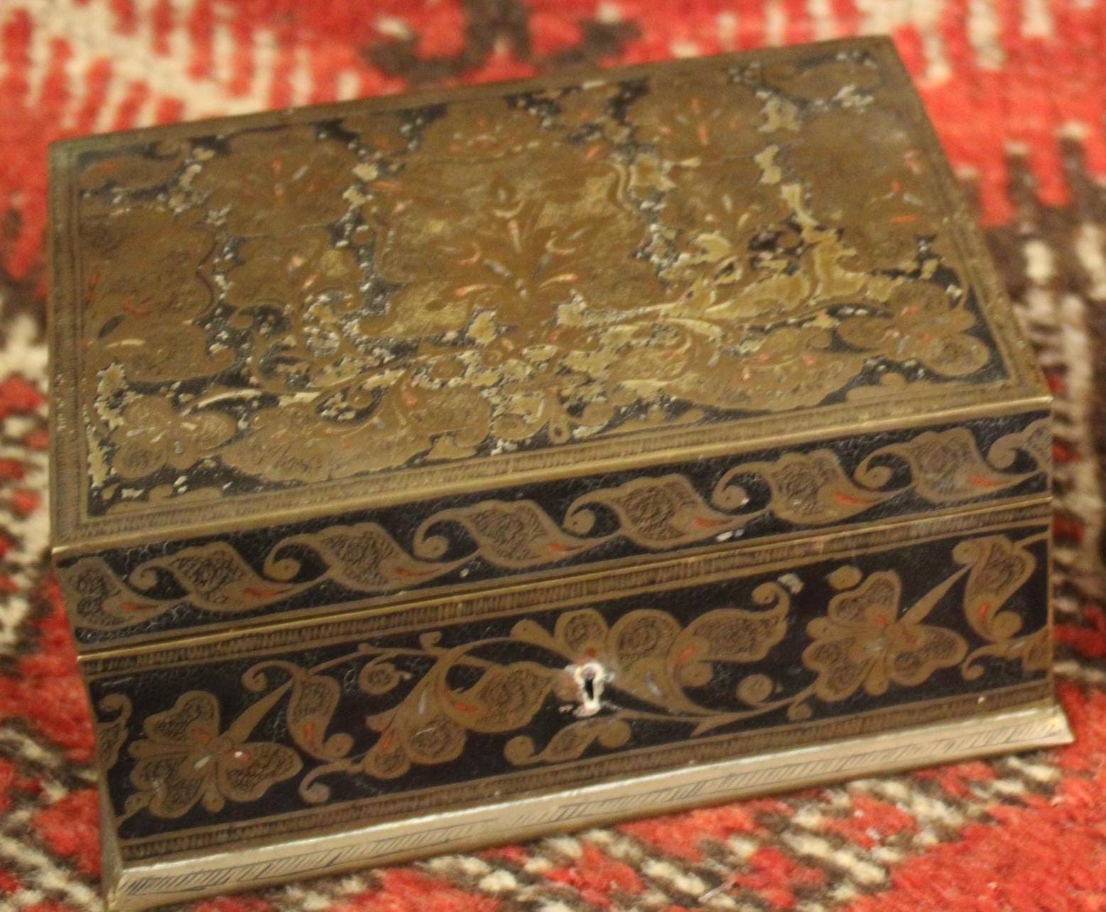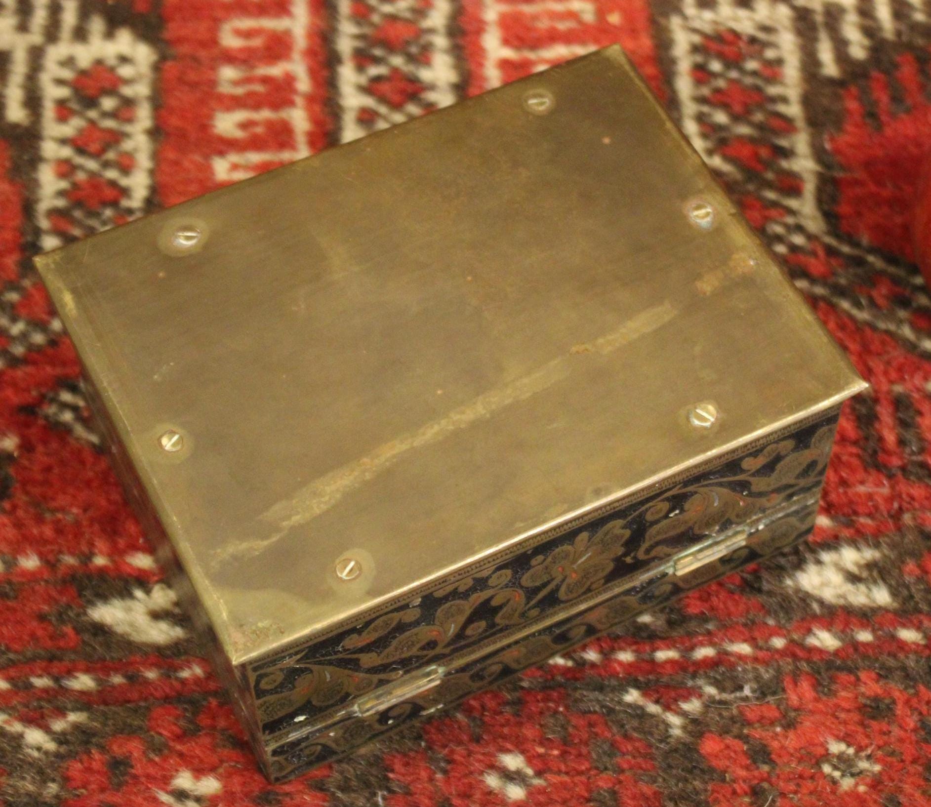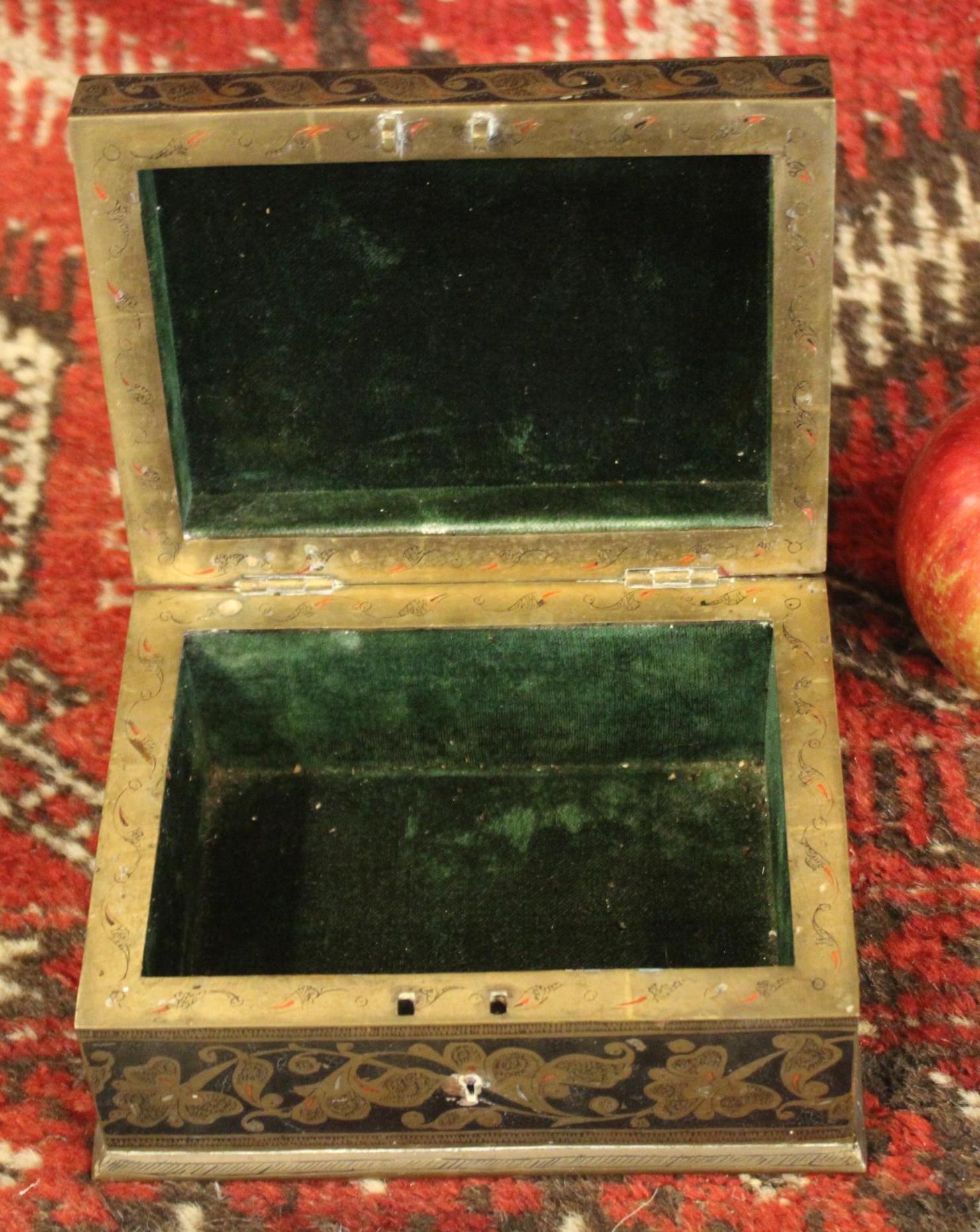 This Early 20th Century Benares Ware Cloisonne Felt Lined Trinket Jewelry Box is in such great condition for its age! Made of age darkened brass with black and red foliate enameling with a gorgeaous dark green velvet interior- it is 6" x 4.5" x 3" tall- the perfect size for gift giving this holiday season...(hint, hint...stash a ring or gift certificate in it)!! There are no dents; it closes squarey and easily- some pieces of the red cloisonne are missing (very hard to notice)- A gorgeous piece that will be admired and cherished! Please message us if you have any questions- Thanks for looking!