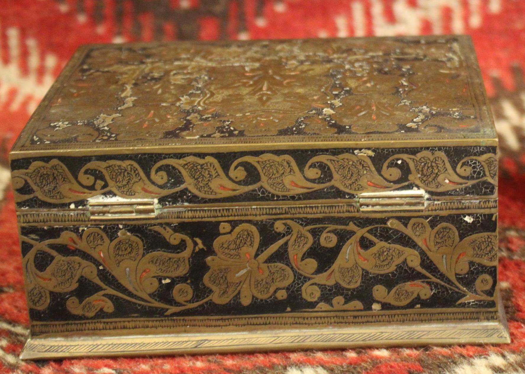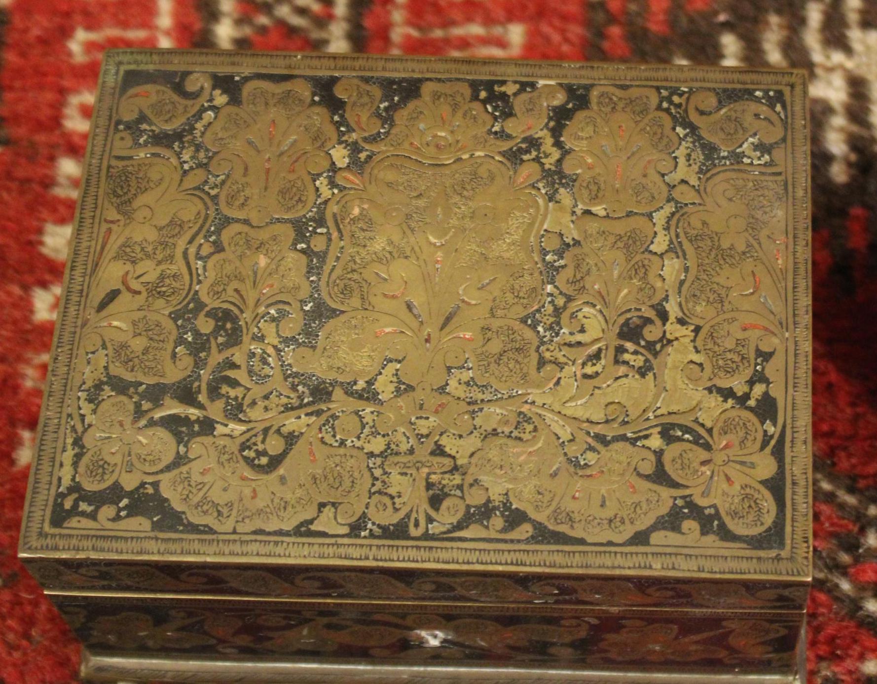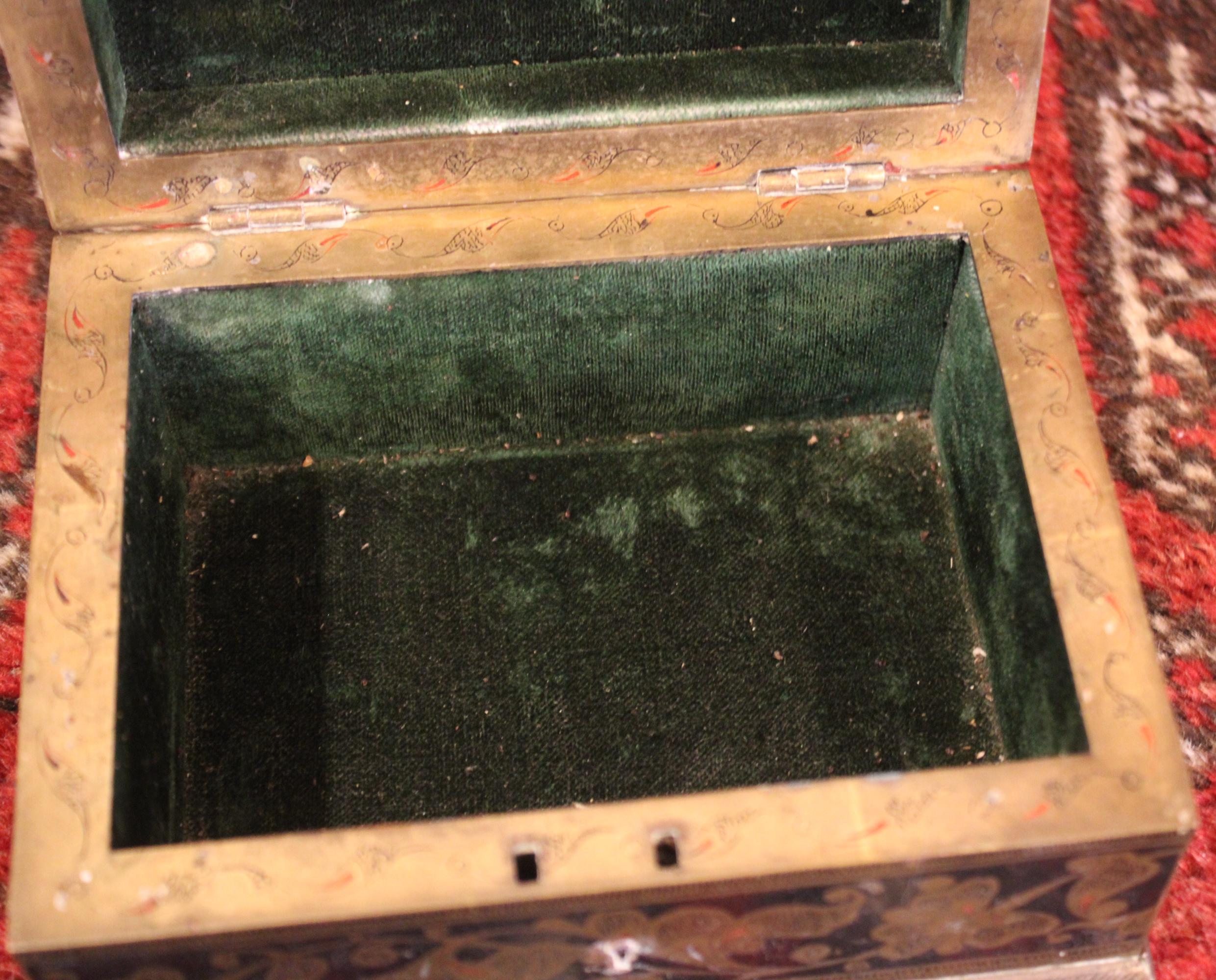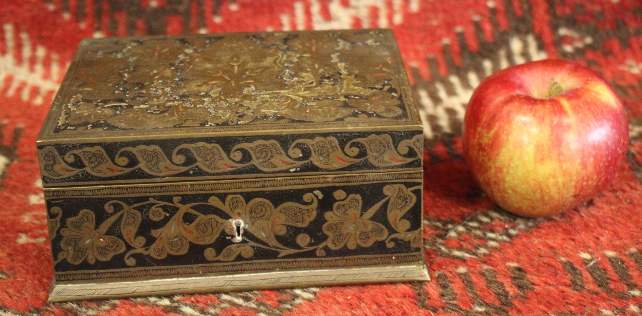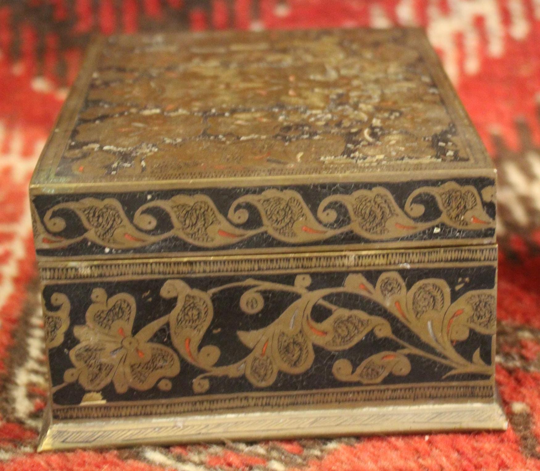 This Early 20th Century Benares Ware Cloisonne Felt Lined Trinket Jewelry Box is in such great condition for its age! Made of age darkened brass with black and red foliate enameling with a gorgeaous dark green velvet interior- it is 6" x 4.5" x 3" tall- the perfect size for gift giving this holiday season...(hint, hint...stash a ring or gift certificate in it)!! There are no dents; it closes squarey and easily- some pieces of the red cloisonne are missing (very hard to notice)- A gorgeous piece that will be admired and cherished! Please message us if you have any questions- Thanks for looking!