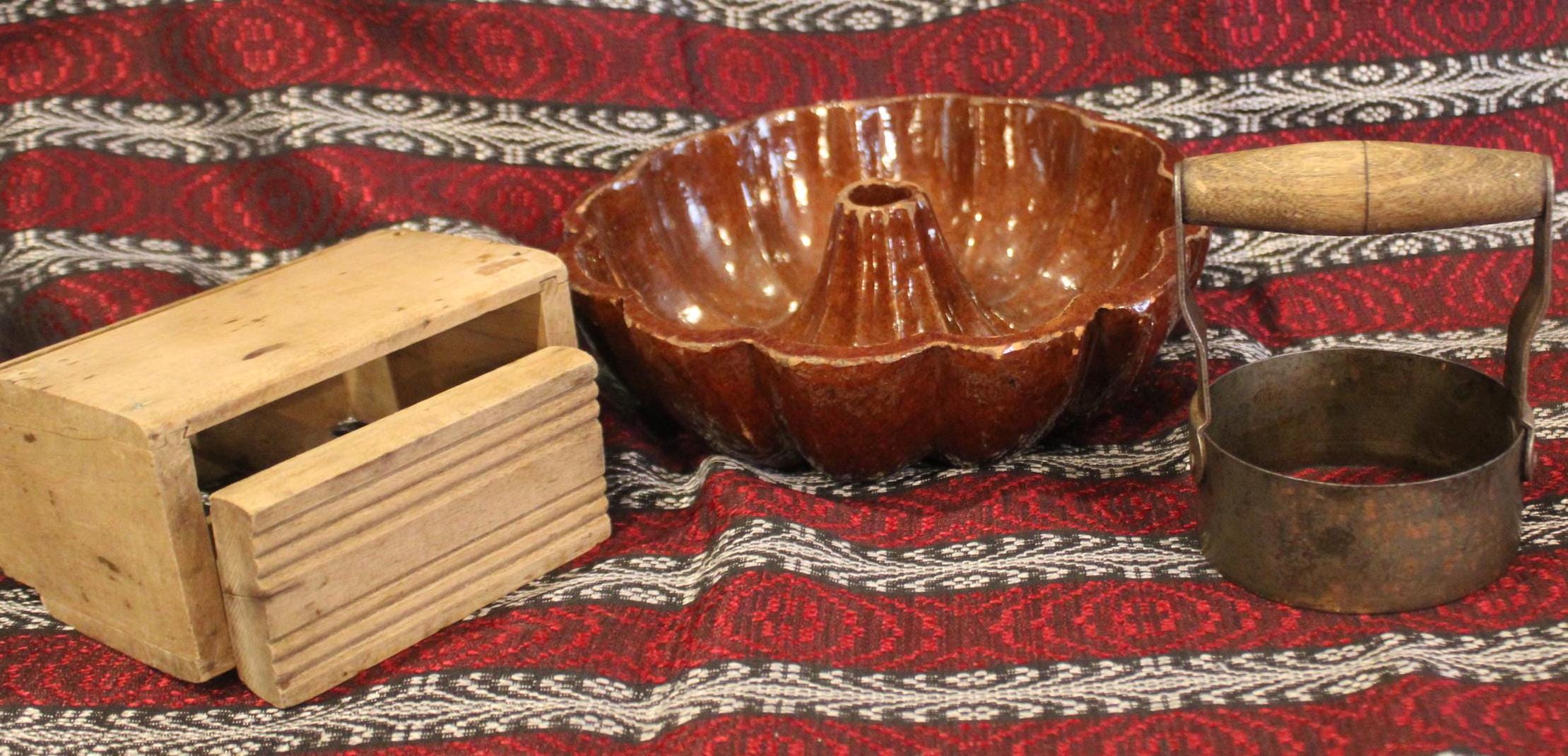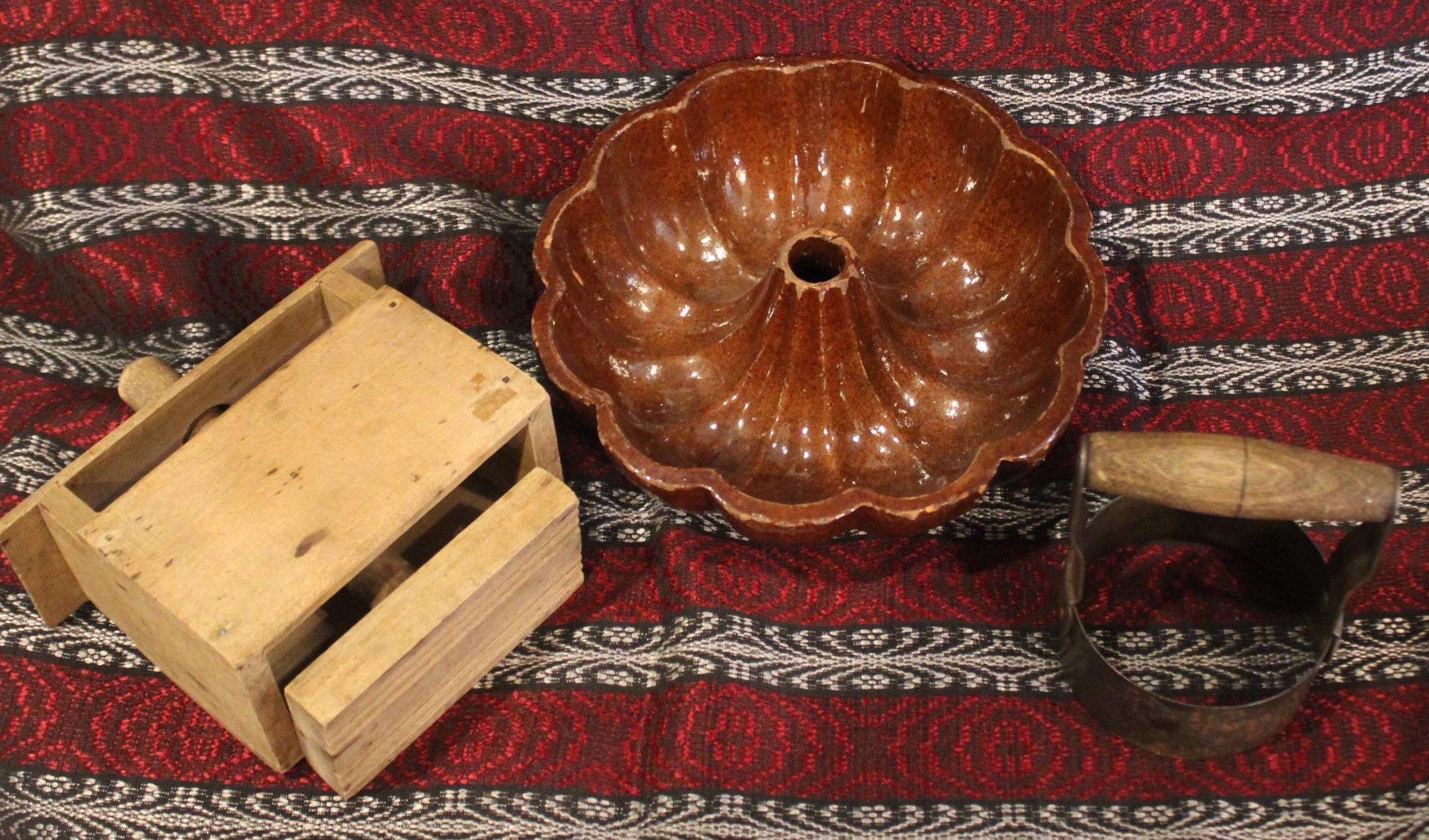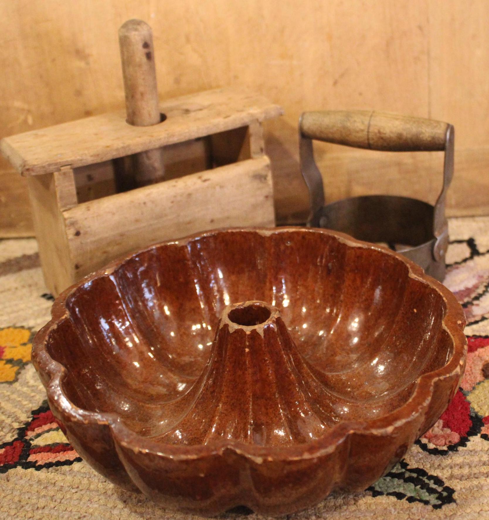 19th Century Kitchen- Maple Butter Press, Turks Head Redware Mold, Biscuit Cutter- Country/Farmhouse/Kitchen