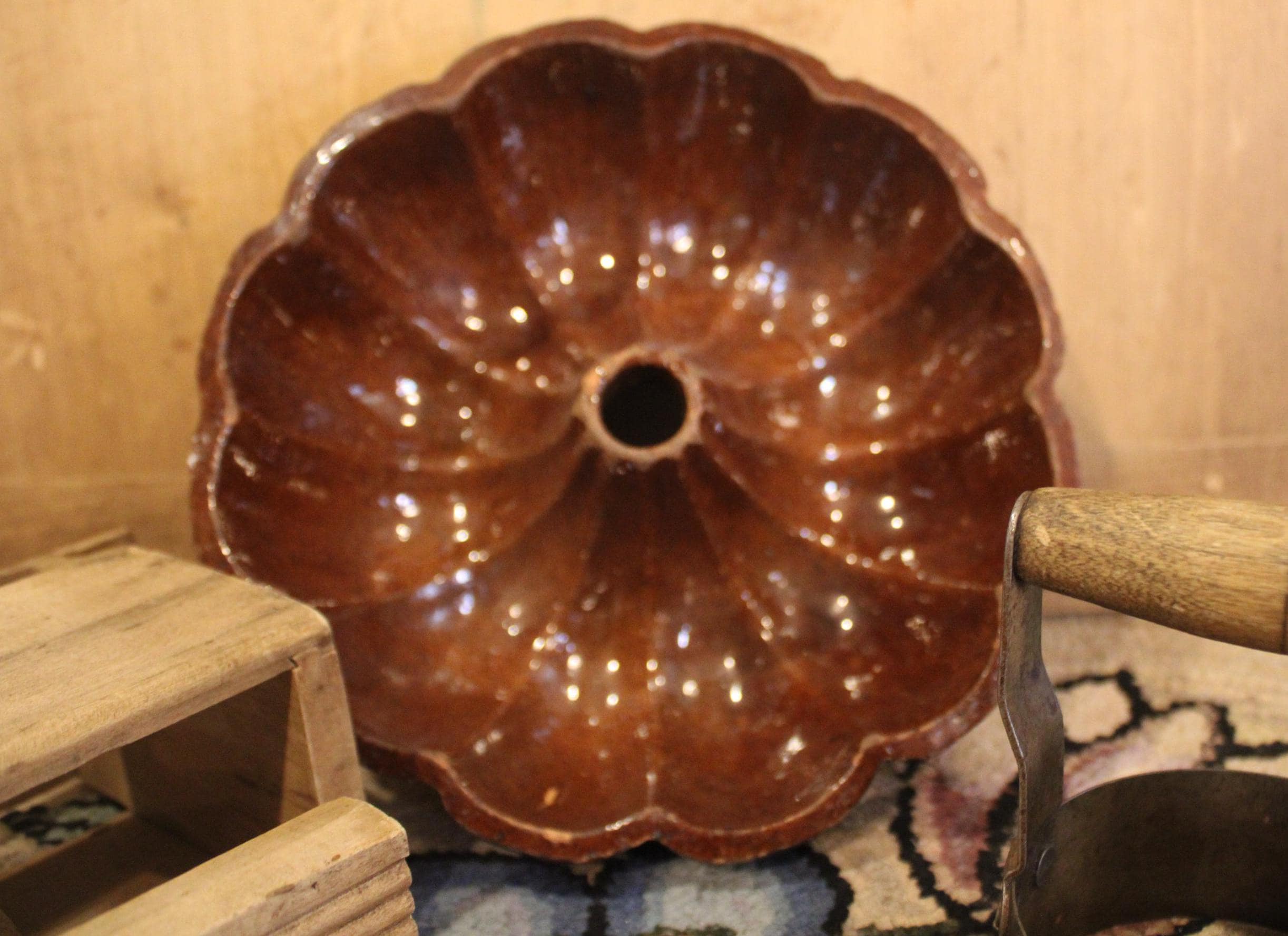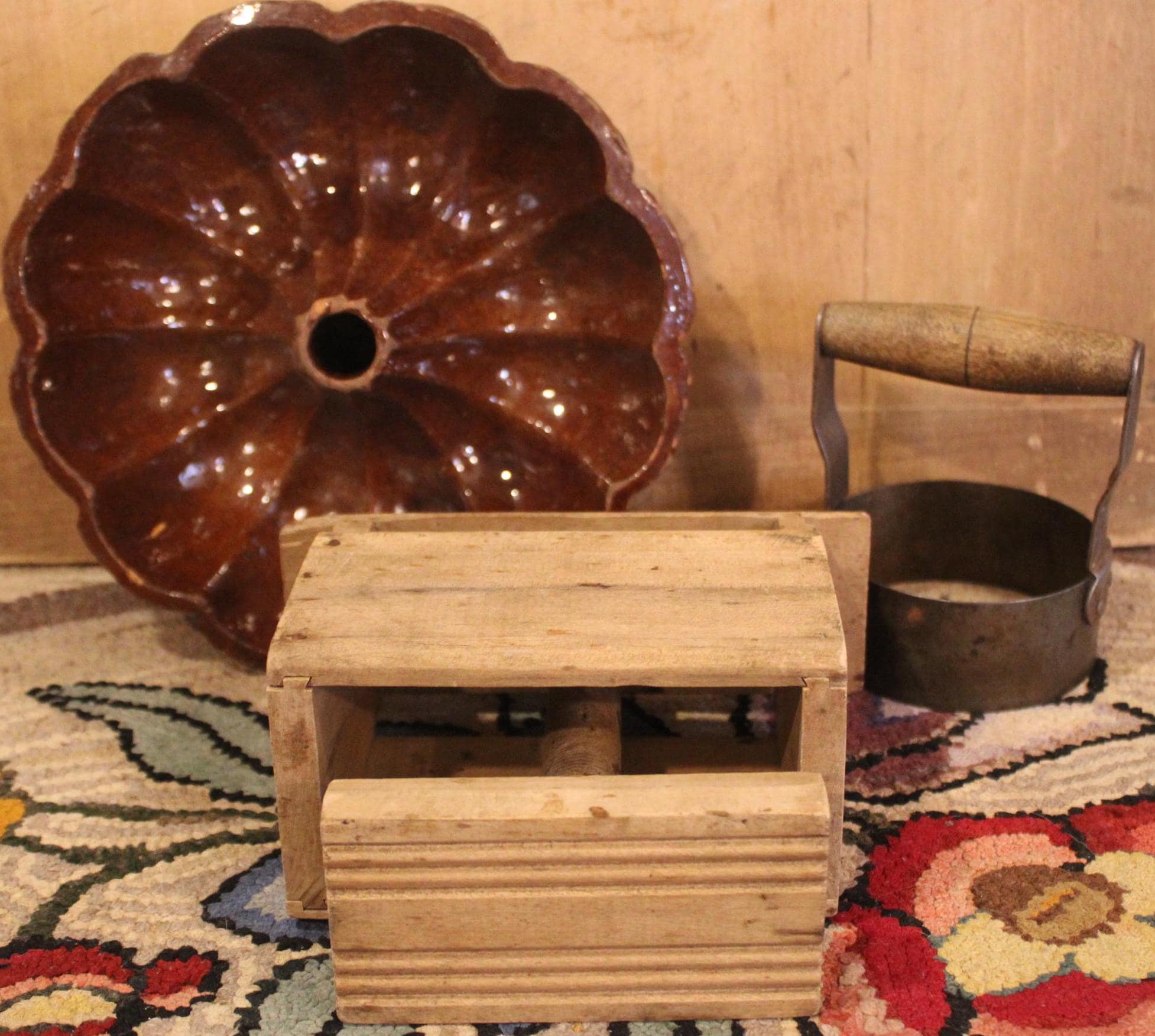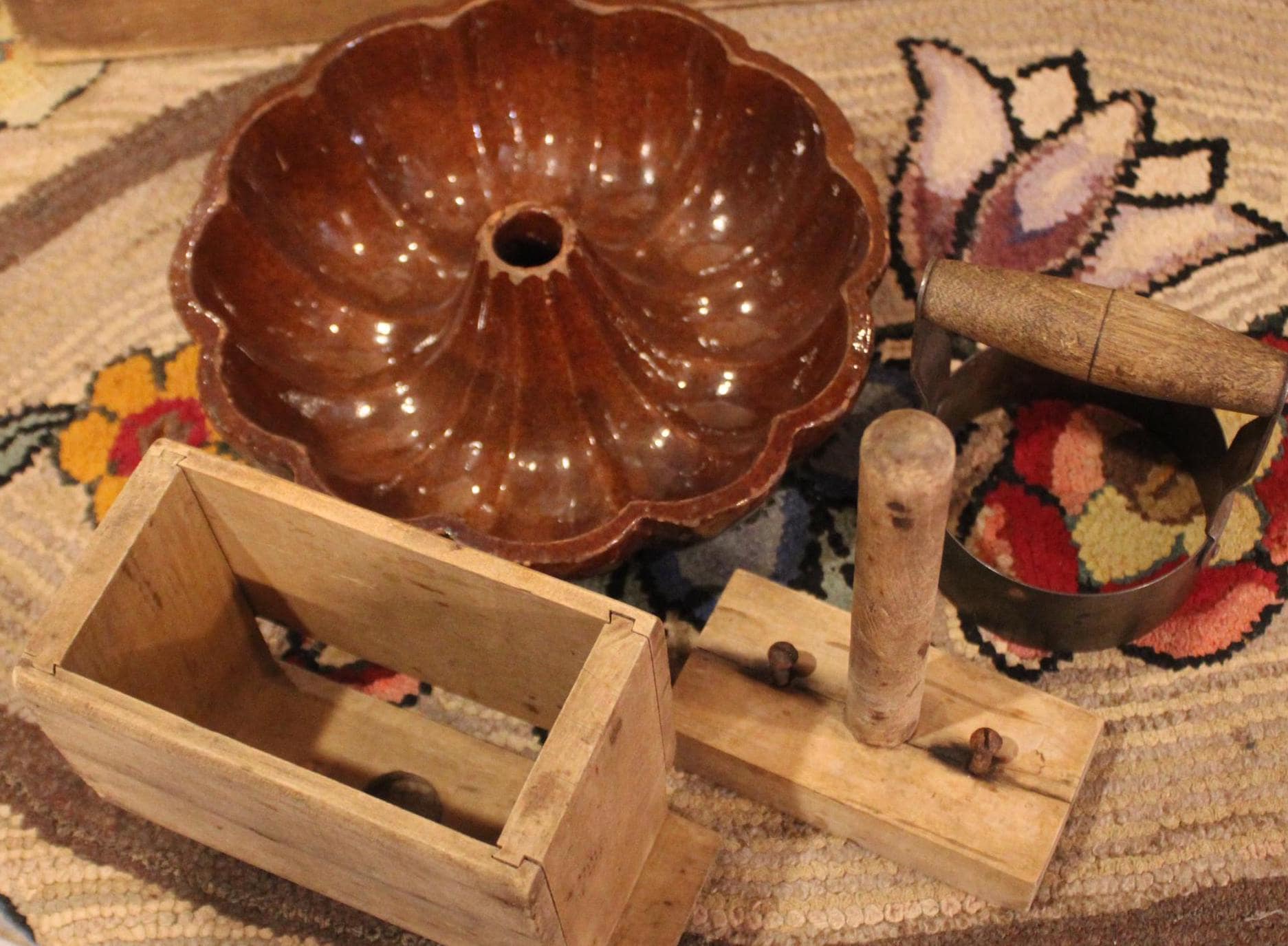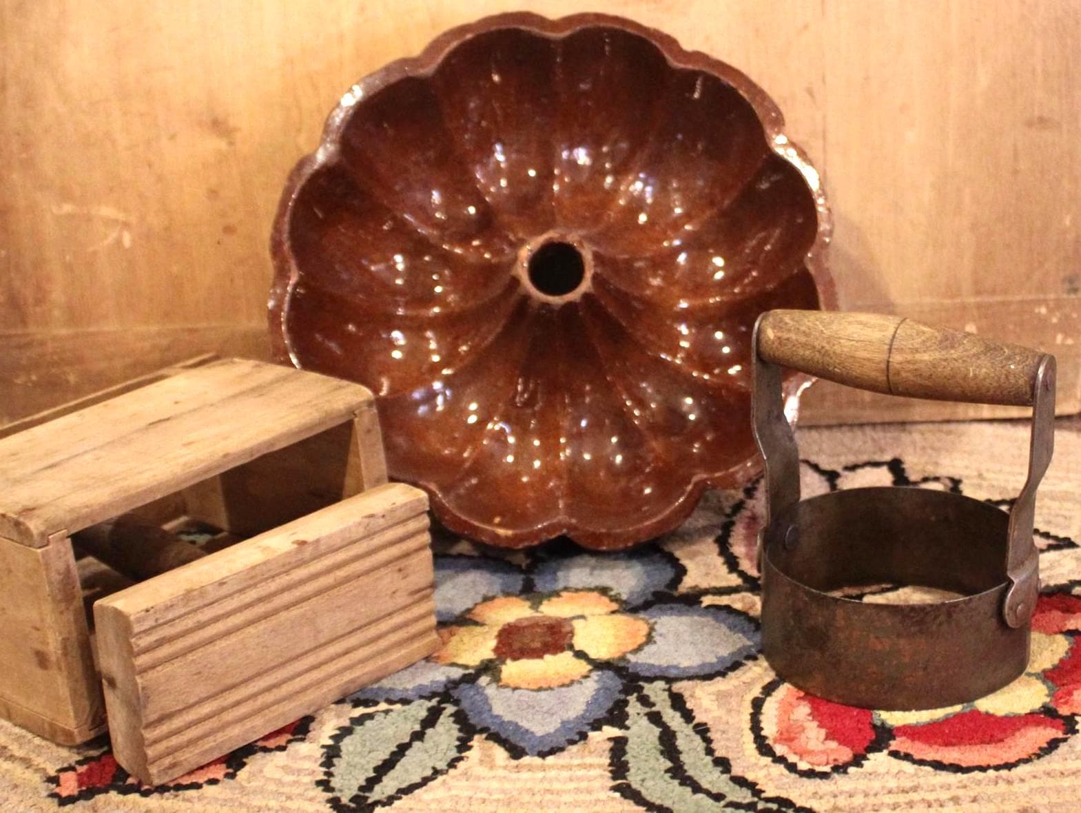 19th Century Kitchen- Maple Butter Press, Turks Head Redware Mold, Biscuit Cutter- Country/Farmhouse/Kitchen