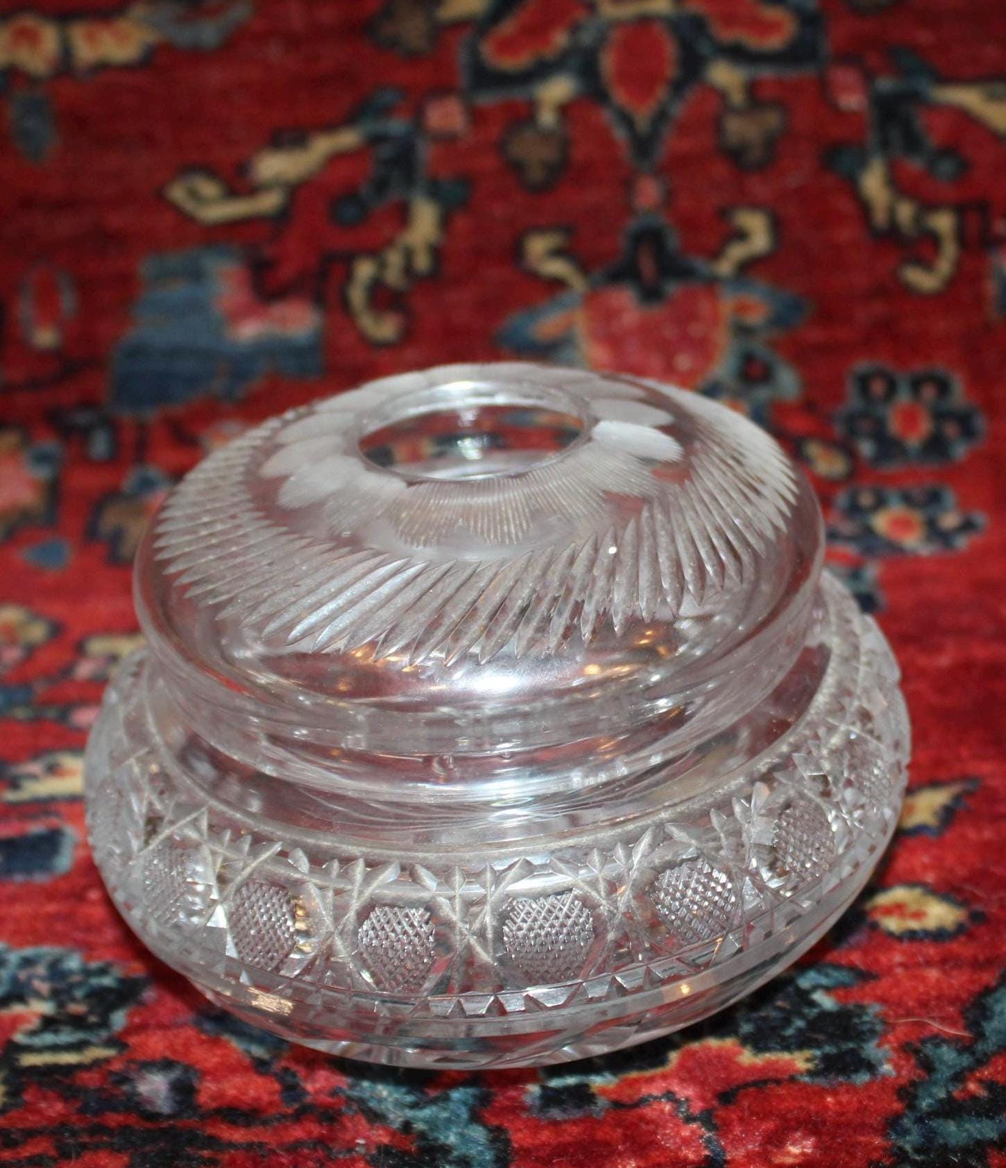 This gorgeous Victorian ABP Cut Glass Hair Receive with original matching lid with is in wonderful condition for its age! It is from the American brilliant period, (late 1800's) with beautiful cut detail. While there a few flea bites around the rim, it is in wonderful condition for its 100 plus year old age. Possibly Pairpont…it is VERY heavy with wonderful wear to the base. It measures 2.75" tall x 5.25" in diameter. Please message us if you have any questions- Thanks for looking!