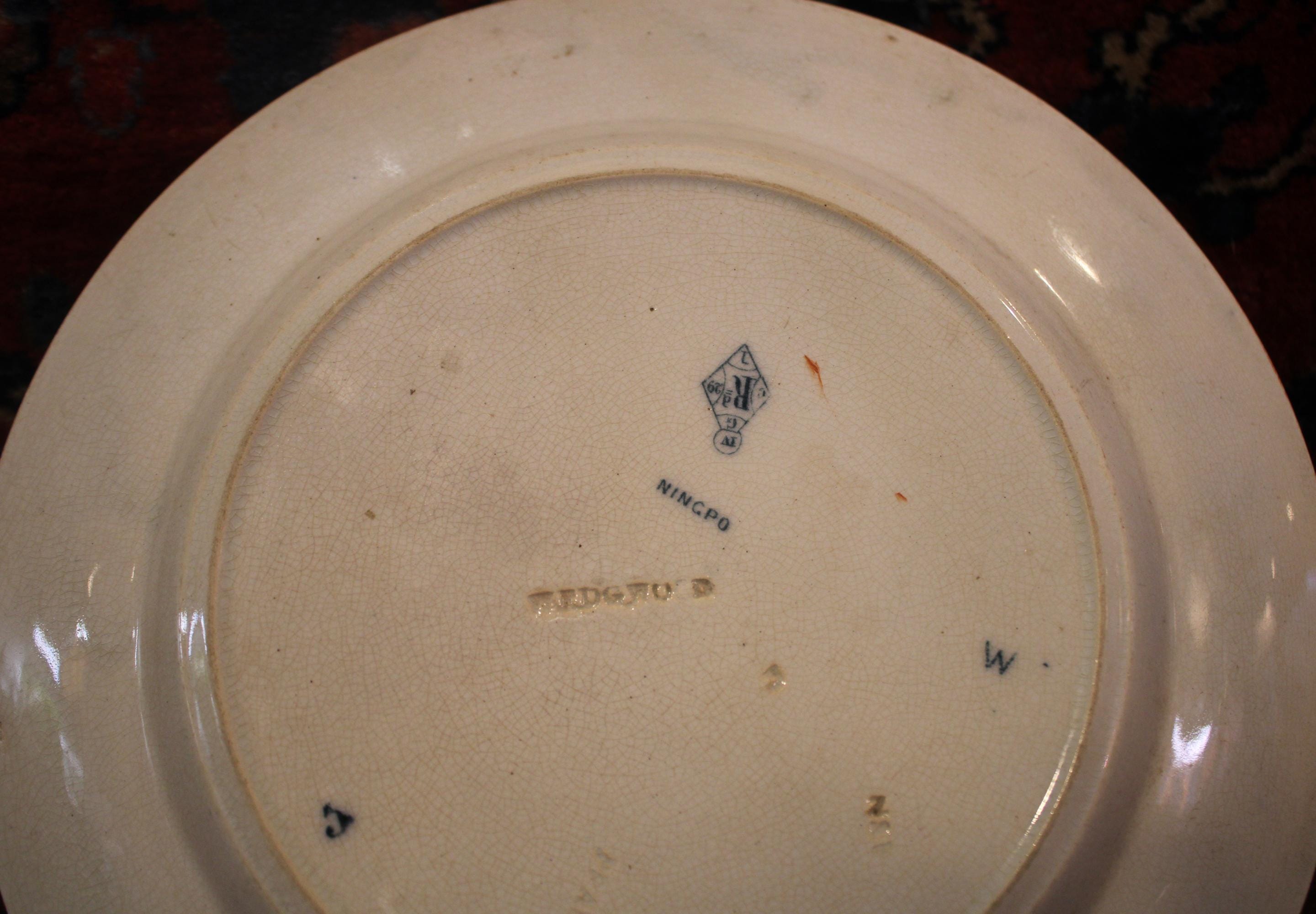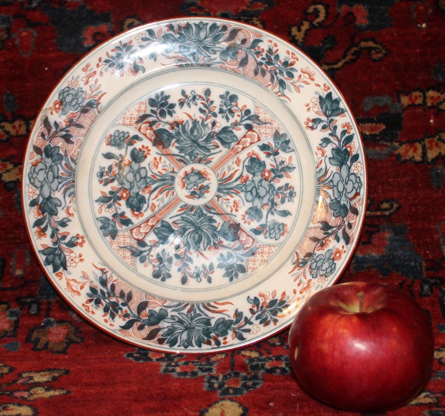 This Antique Wedgwood Ningpo Pattern Salad Plate with a Gorgeous Ironstone Platter would look wonderful decorating a farmhouse kitchen- perfect to adorn a wall- or use for dinner service- both pieces are in beautiful condition. The Ningpo plate is 8.75” in diameter with a gorgeous cobalt blue and red floral design. The Ironstone platter is marked