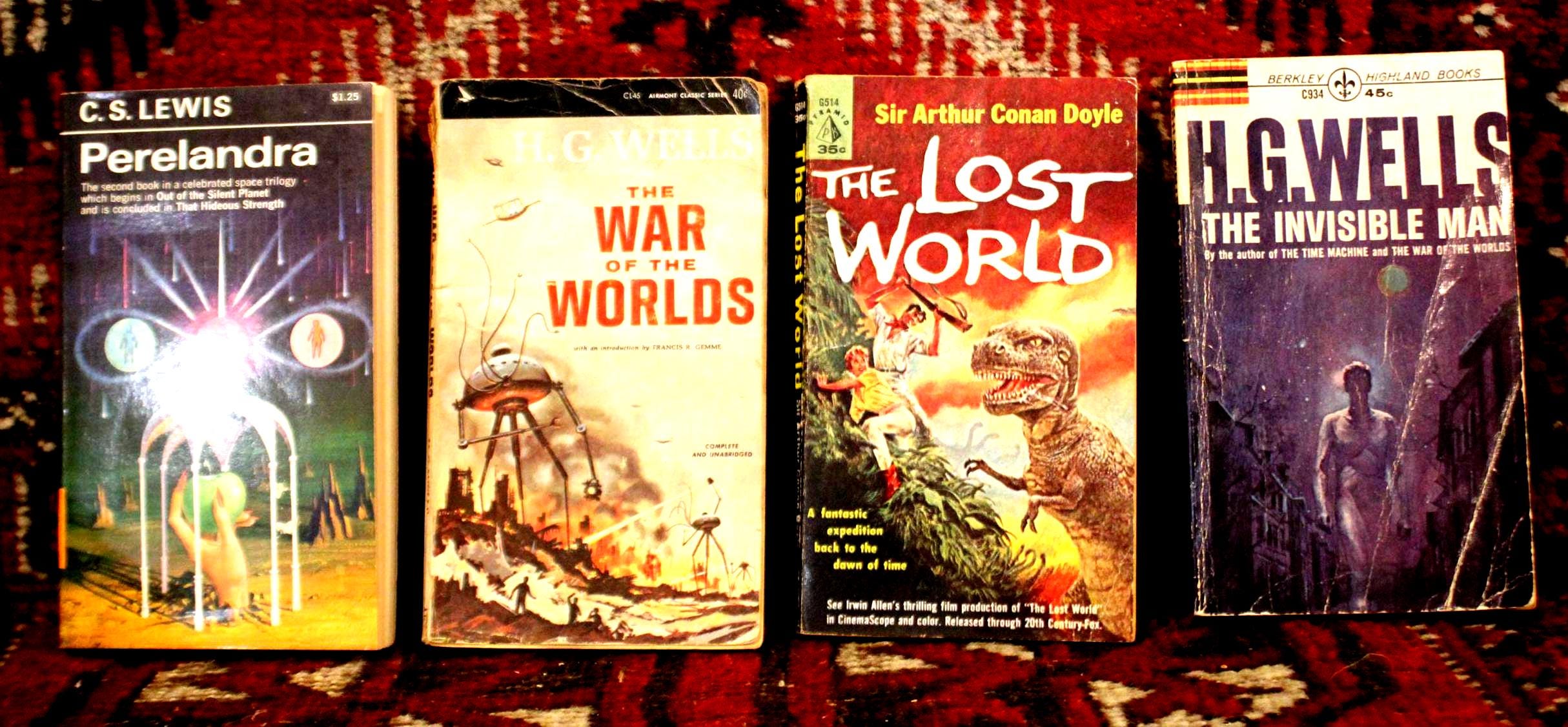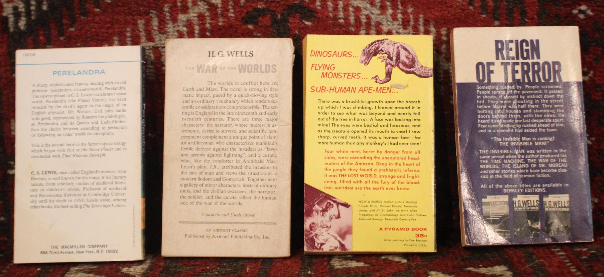 Set of Four Midcentury Sci-Fi Paperbacks: The Invisible Man, The War of the Worlds, The Lost World, Perelandra- Great Covers!