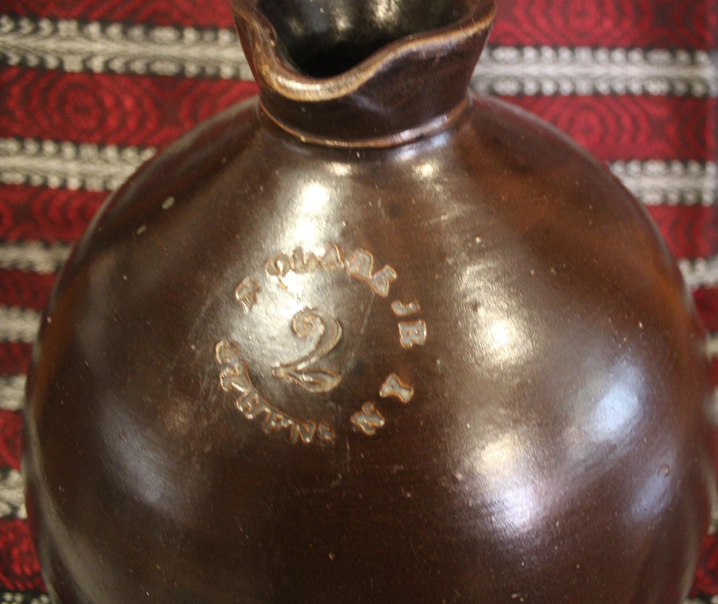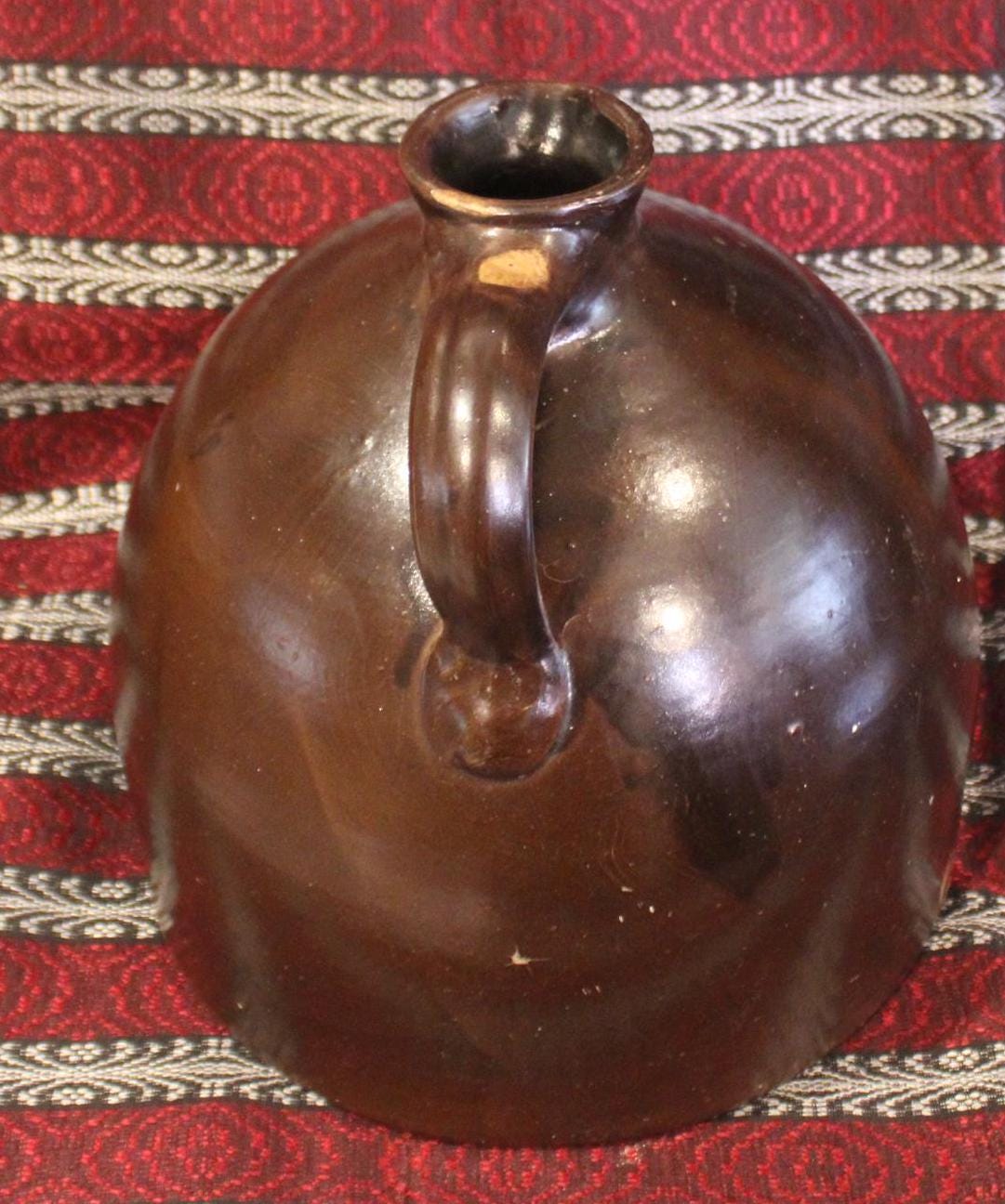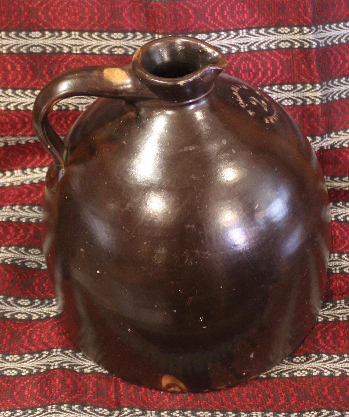This "N Clarke Jr Athens NY" Stoneware 2 Gallon Jug is such a fantastic piece of brown earthenware! It is 11" tall x 10.75" in diameter and has a beautiful rich chocolate hue with the perfect sheen. The applied strap handle, pouring spout, and base have no chips; there is a bubble pop (occured during firing) to one side which can be seen in the last photo- but no hairlines. A beautiful jug that would look gorgeous in your home! Please message us if you have any questions- Thanks for looking!