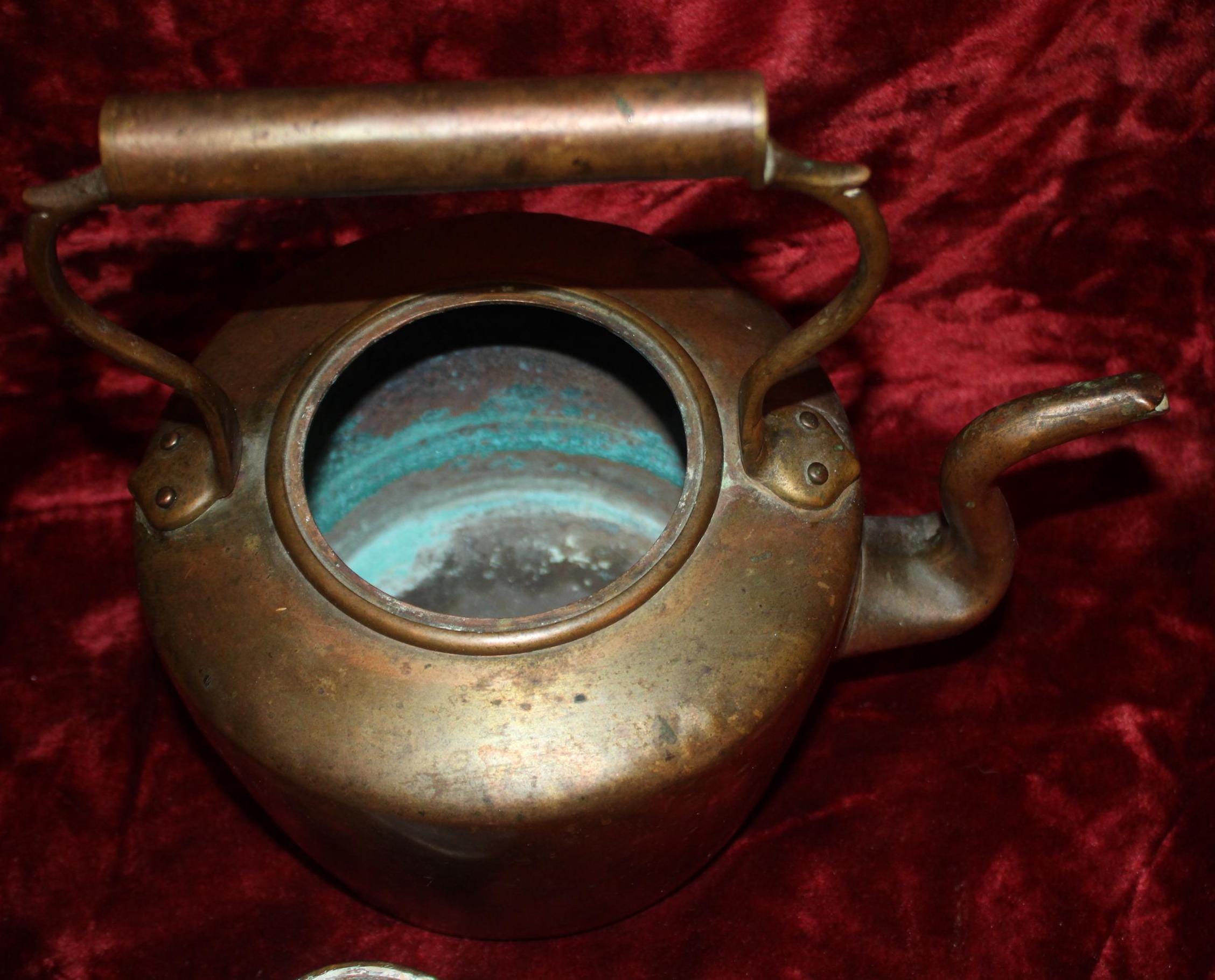 This Wonderful 19th Century Dovetailed English Copper Tea Kettle will fit perfectly in your farmhouse decor- the rolled handle, goose neck spout, dovetailing, and acorn finial are the details that signify a quality copper kettle. The round handle on top is composed of copper (which measures 5" long x 1" in diameter) with brass that extends to the copper body. The pot measures 11.5" long x 11.5" tall (with the handle) x 8" wide. The copper is in original condition and has not been polished; there are a few small age old dents which can be seen in the photos. The base is dovetailed and marked with an incised "7"; the interior of the pot has oxidation which also can be seen in the photos. Please message us if you have any questions- Thanks for looking!