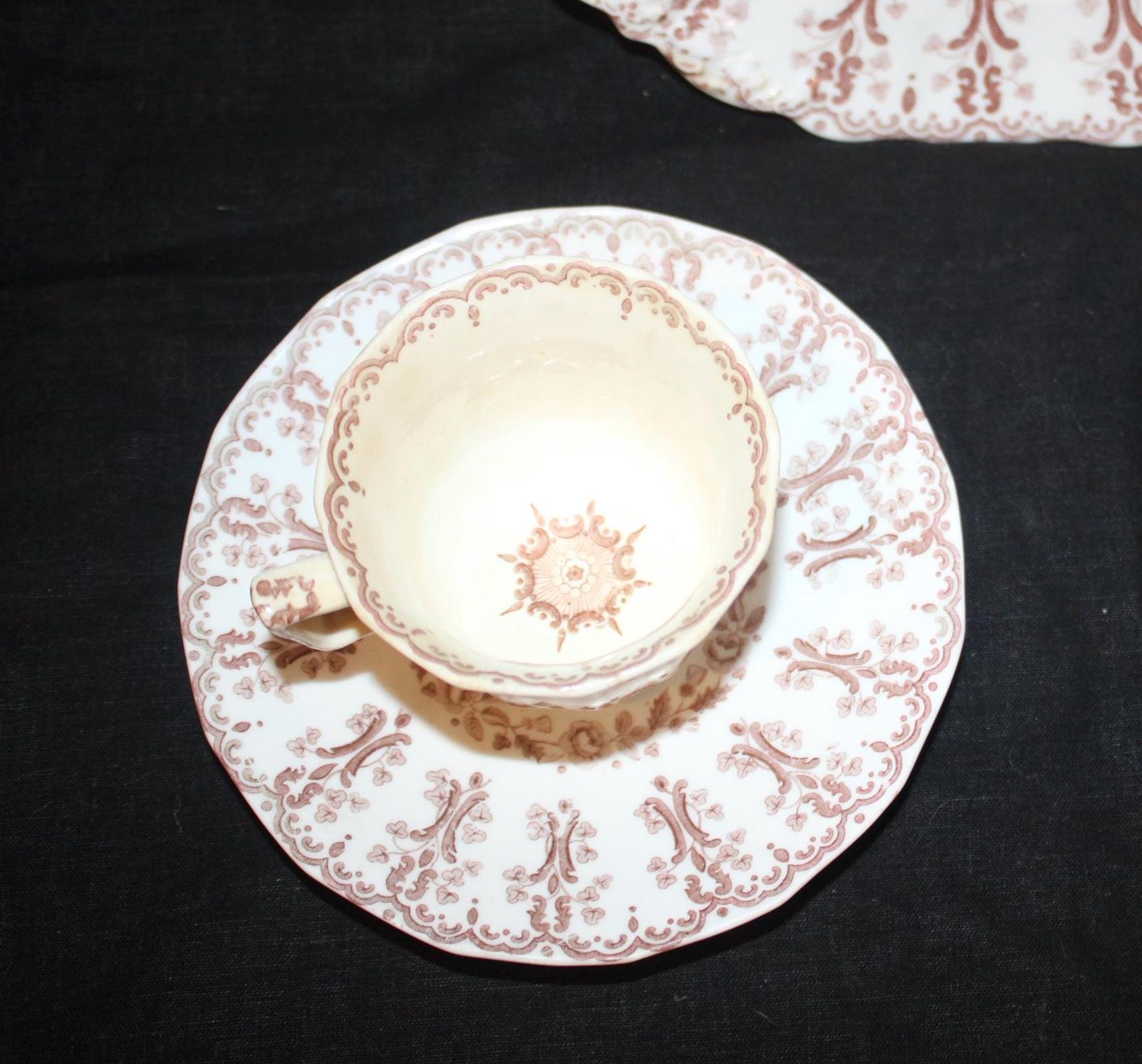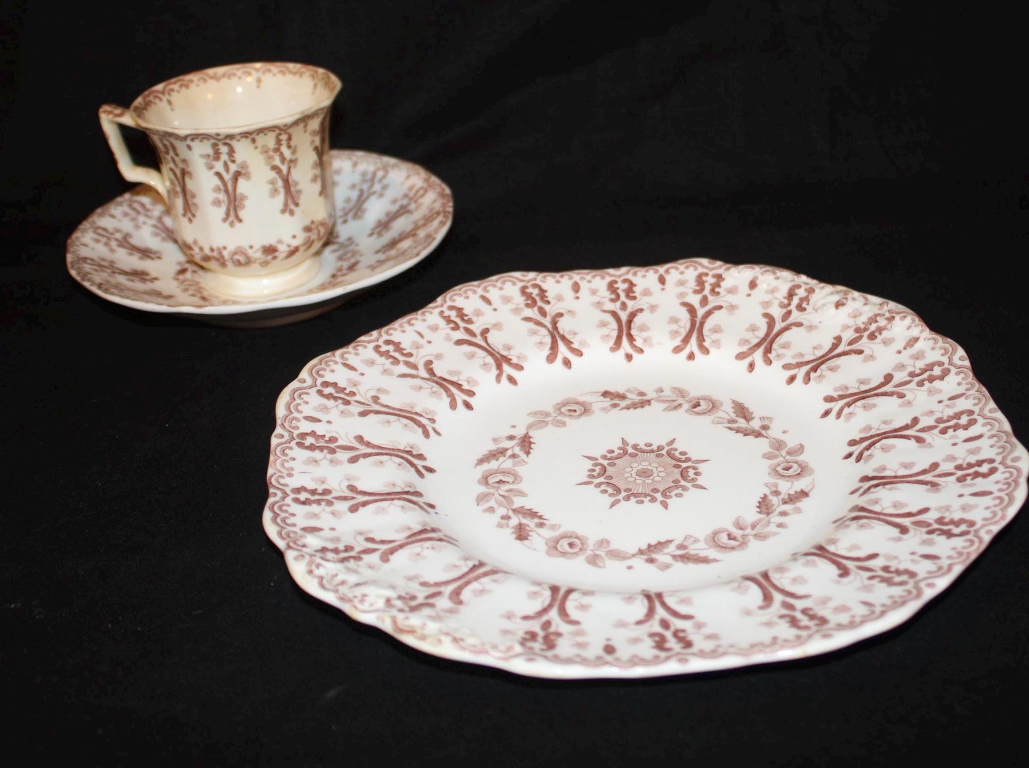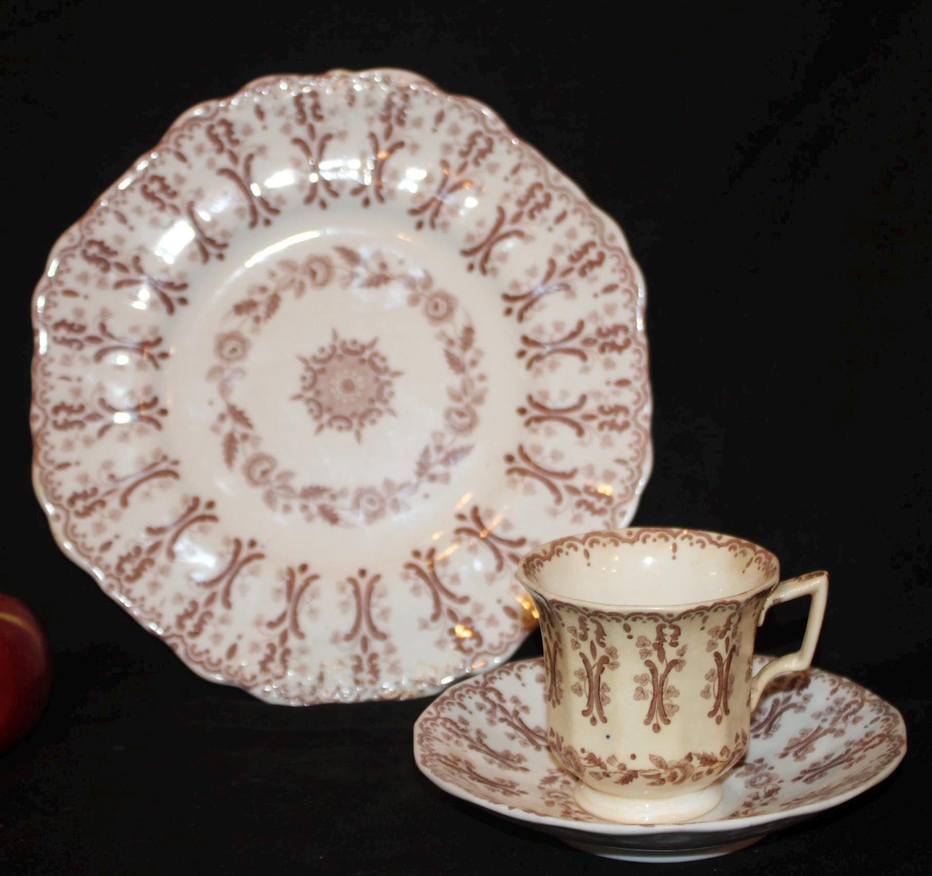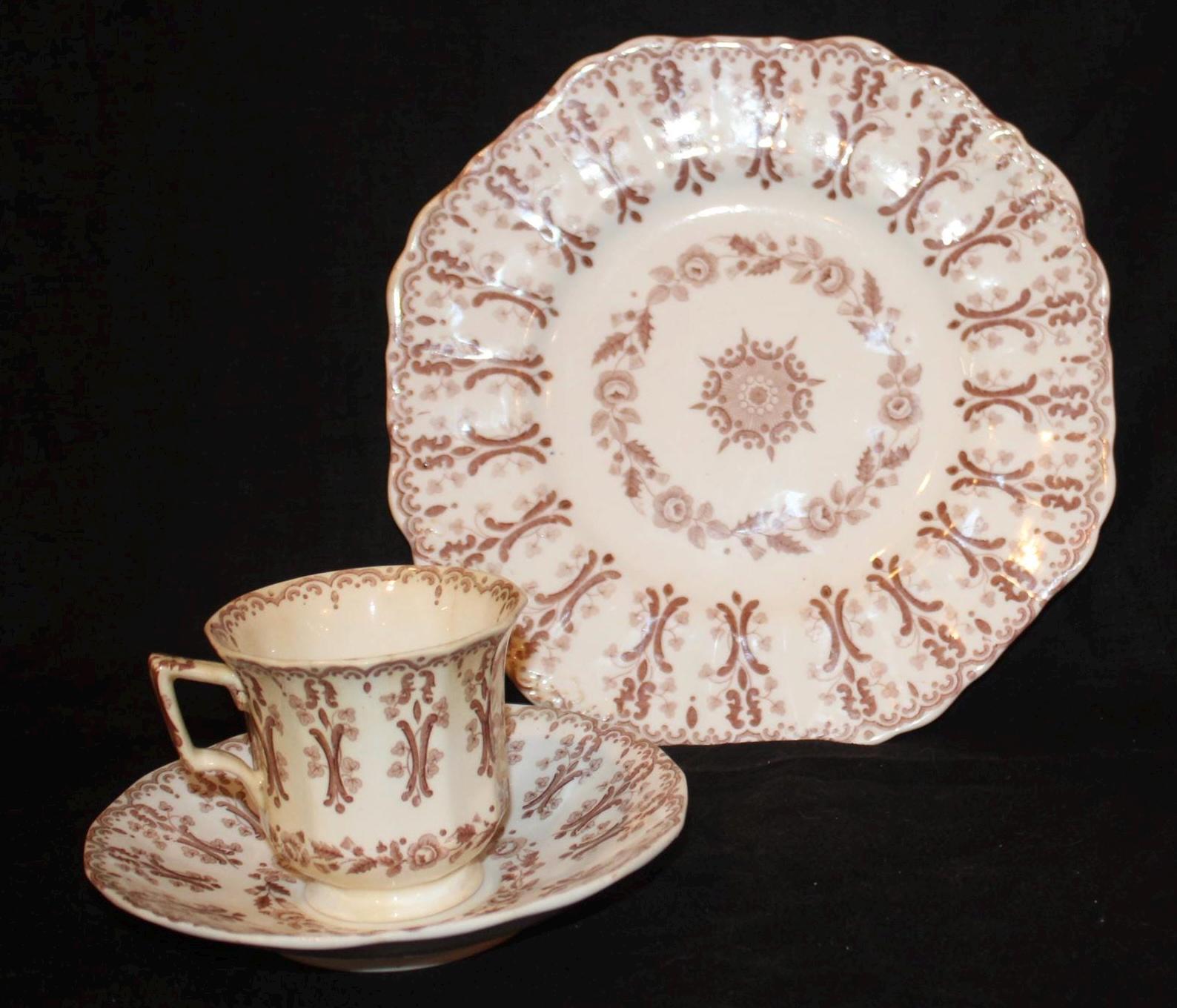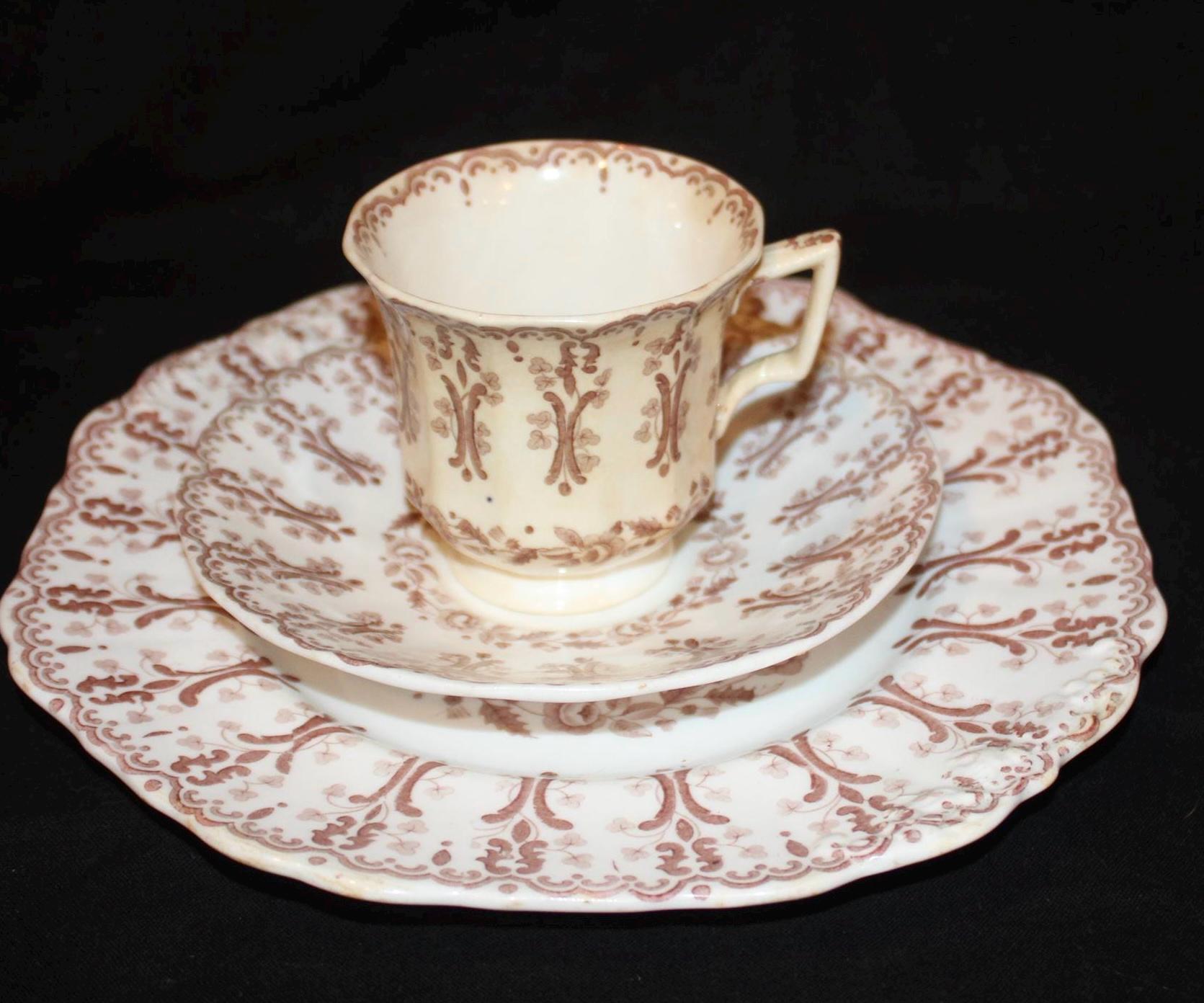 This Antique Copeland and Garrett Late Spode Felspar Porcelain Set is so beautiful and would be perfect to use at your next tea party! The luncheon plate is 8.5" in diameter; the saucer is 6" in diameter; the teacup is 3 tall. This beautiful brown and white transferware fleur de lis pattern set would look stunning displayed in a farm house. There are no chips or cracks but the teacup is darkened/yellowed (please see our photos). Please message us if you have any questions- Thanks for looking!