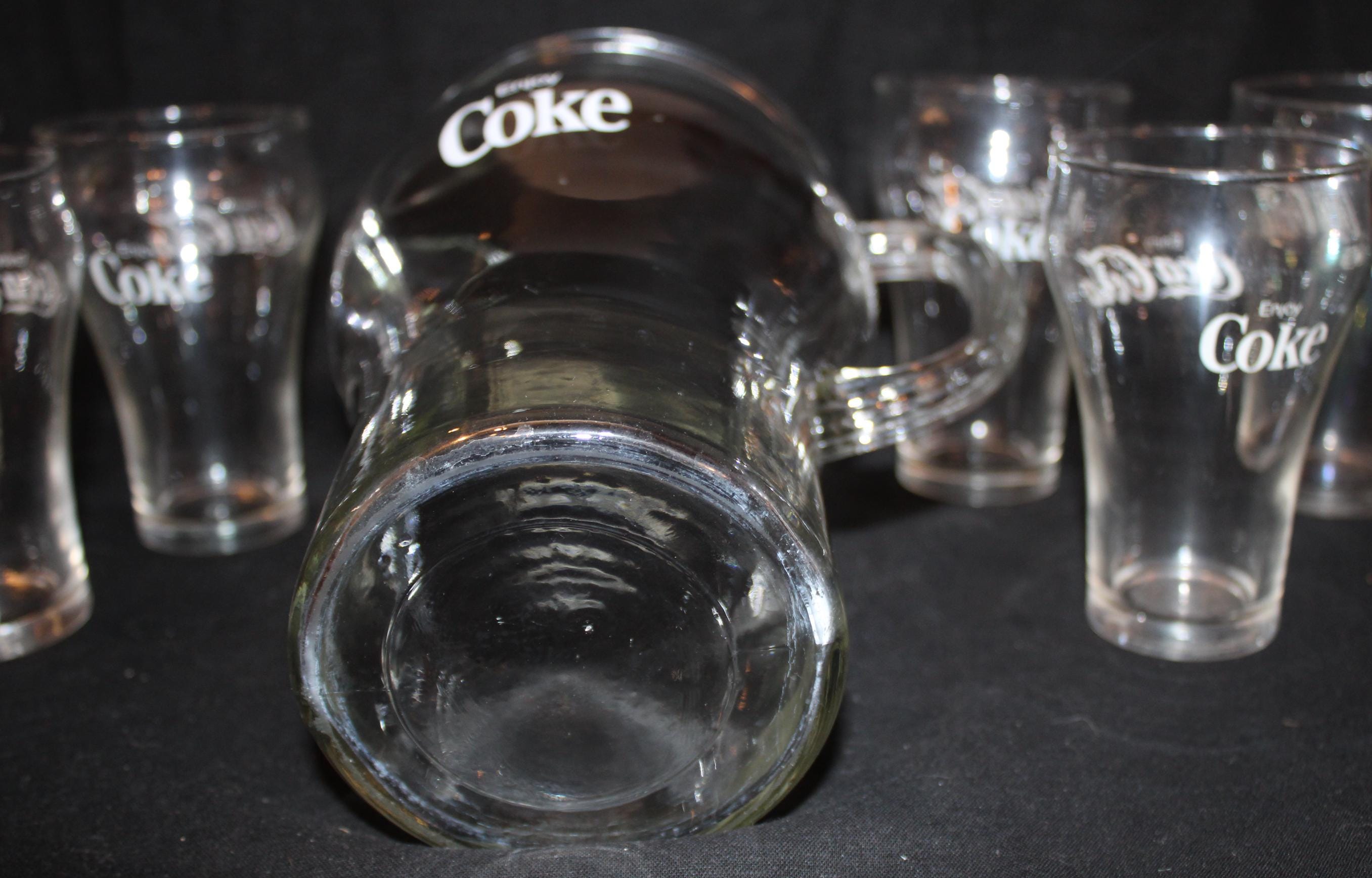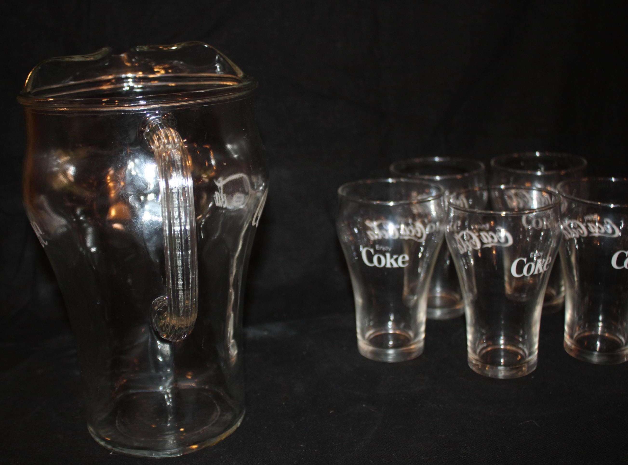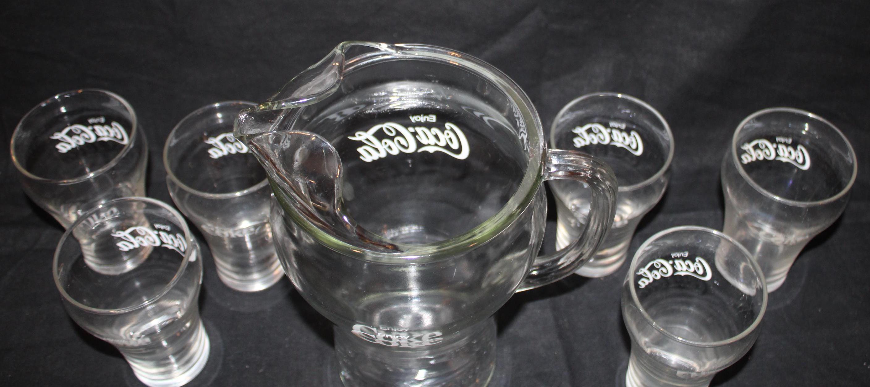 This Set of Six Vintage Bell Shaped Coca Cola Glasses/Tumblers from the 80's, made by Libby, would be such a great addition to your bar ware! Each glass is 5" tall x 3" in diameter and hold 16 oz. ; the pitcher is 10" tall with a 5.5" diameter (8" wide with the handle) and holds 72 oz. They are in wonderful condition with no chips or cracks. Please message us if you have any questions- Thanks for looking!