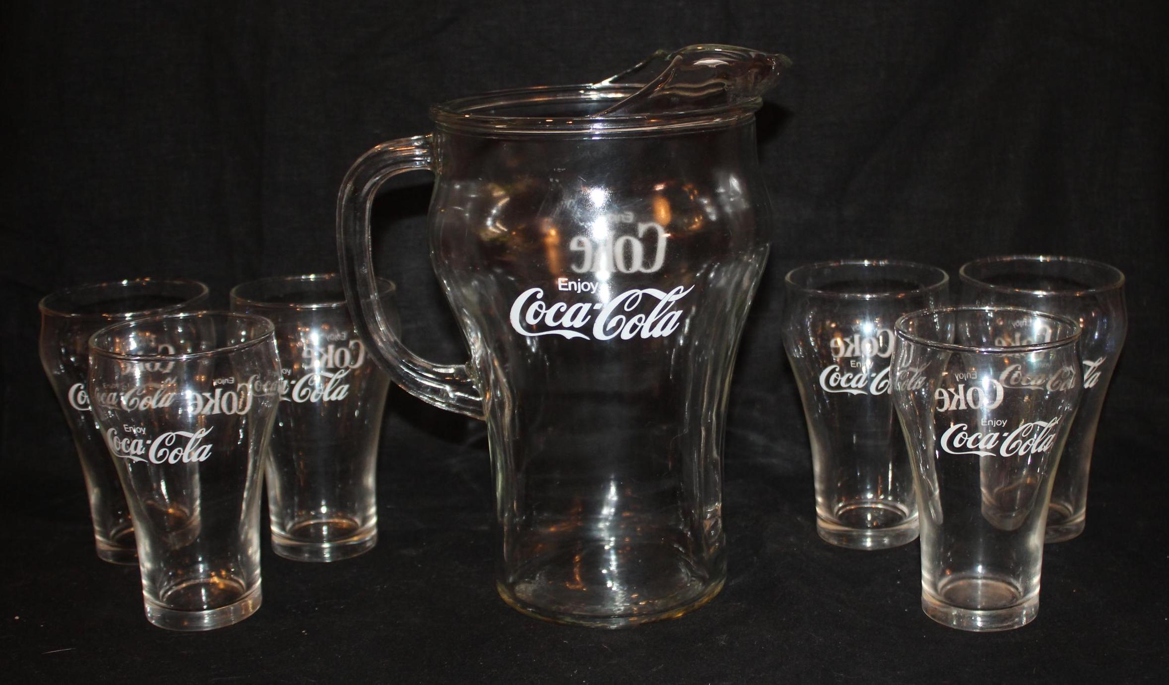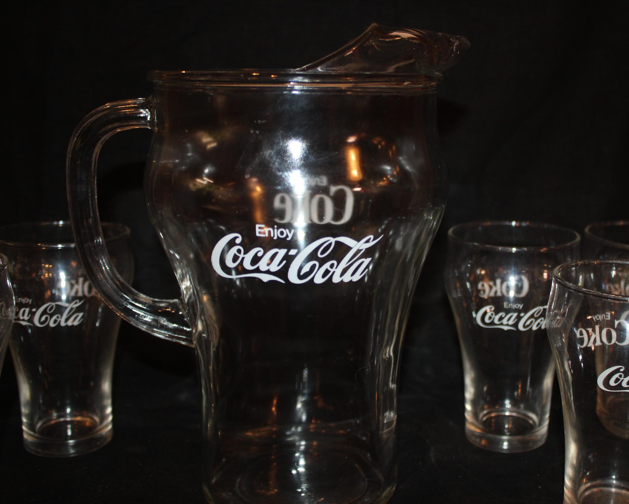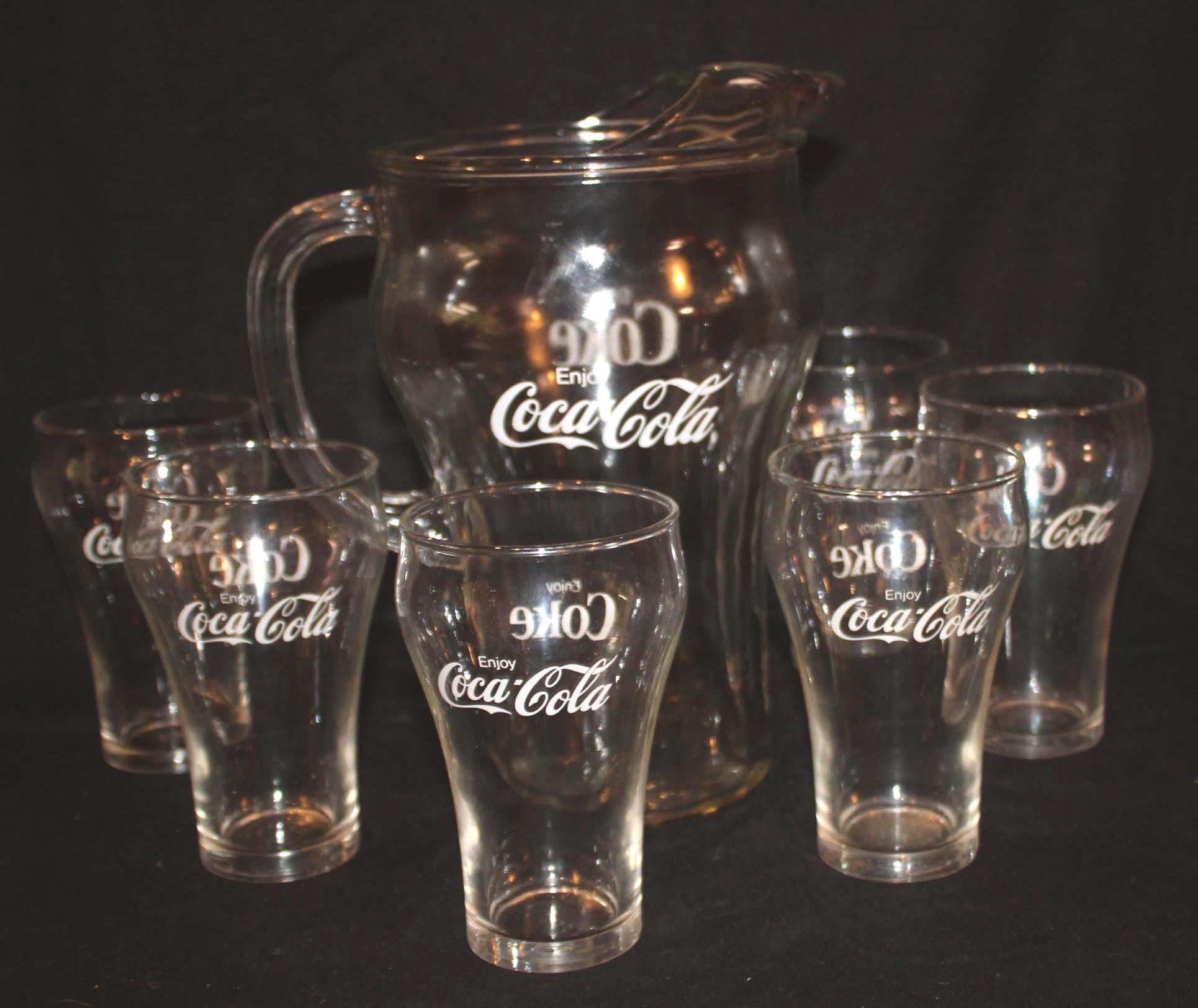 This Set of Six Vintage Bell Shaped Coca Cola Glasses/Tumblers from the 80's, made by Libby, would be such a great addition to your bar ware! Each glass is 5" tall x 3" in diameter and hold 16 oz. ; the pitcher is 10" tall with a 5.5" diameter (8" wide with the handle) and holds 72 oz. They are in wonderful condition with no chips or cracks. Please message us if you have any questions- Thanks for looking!