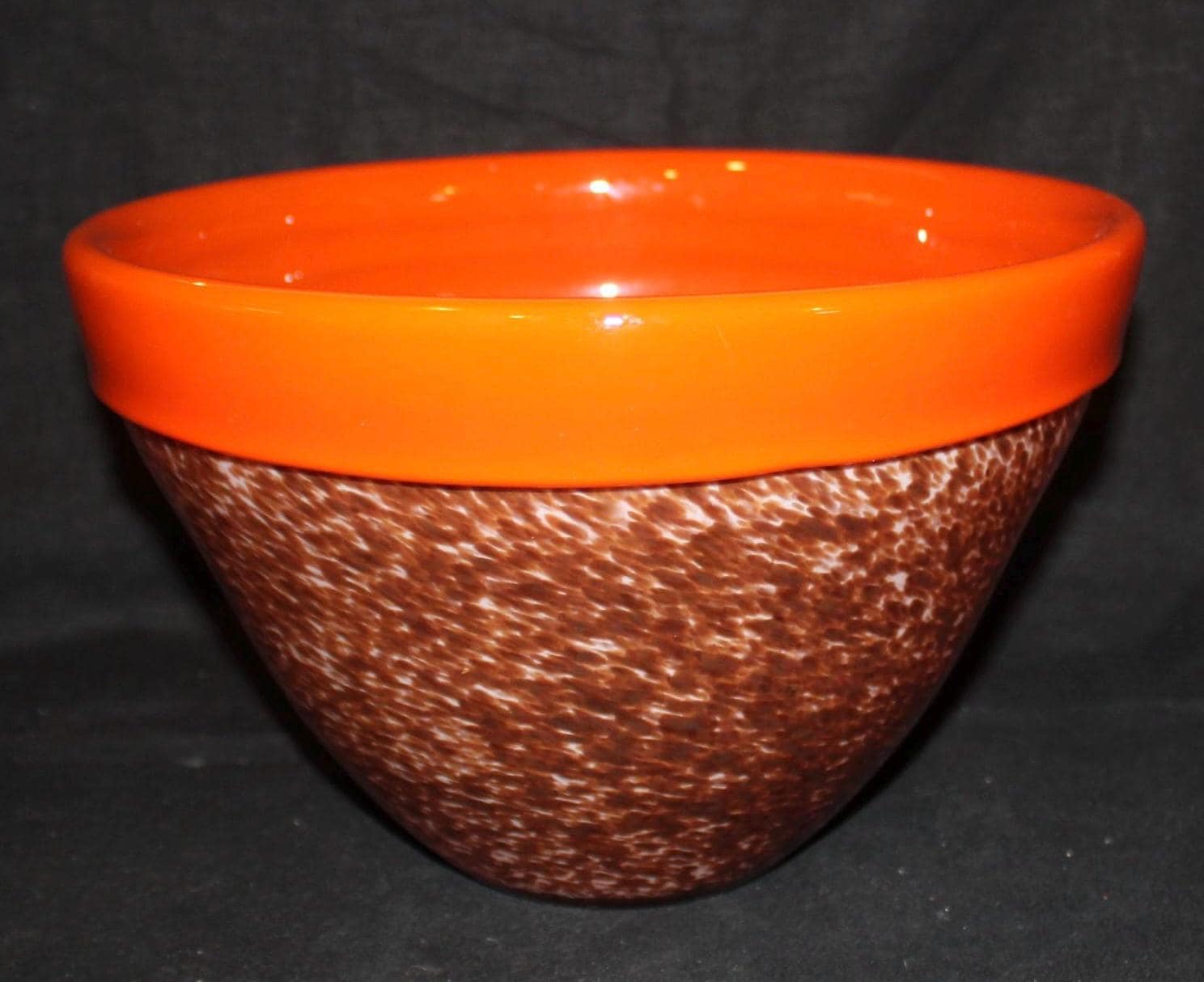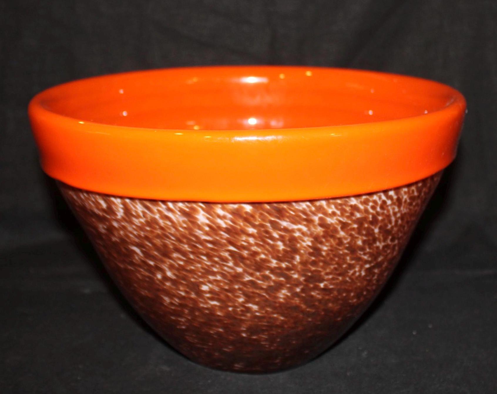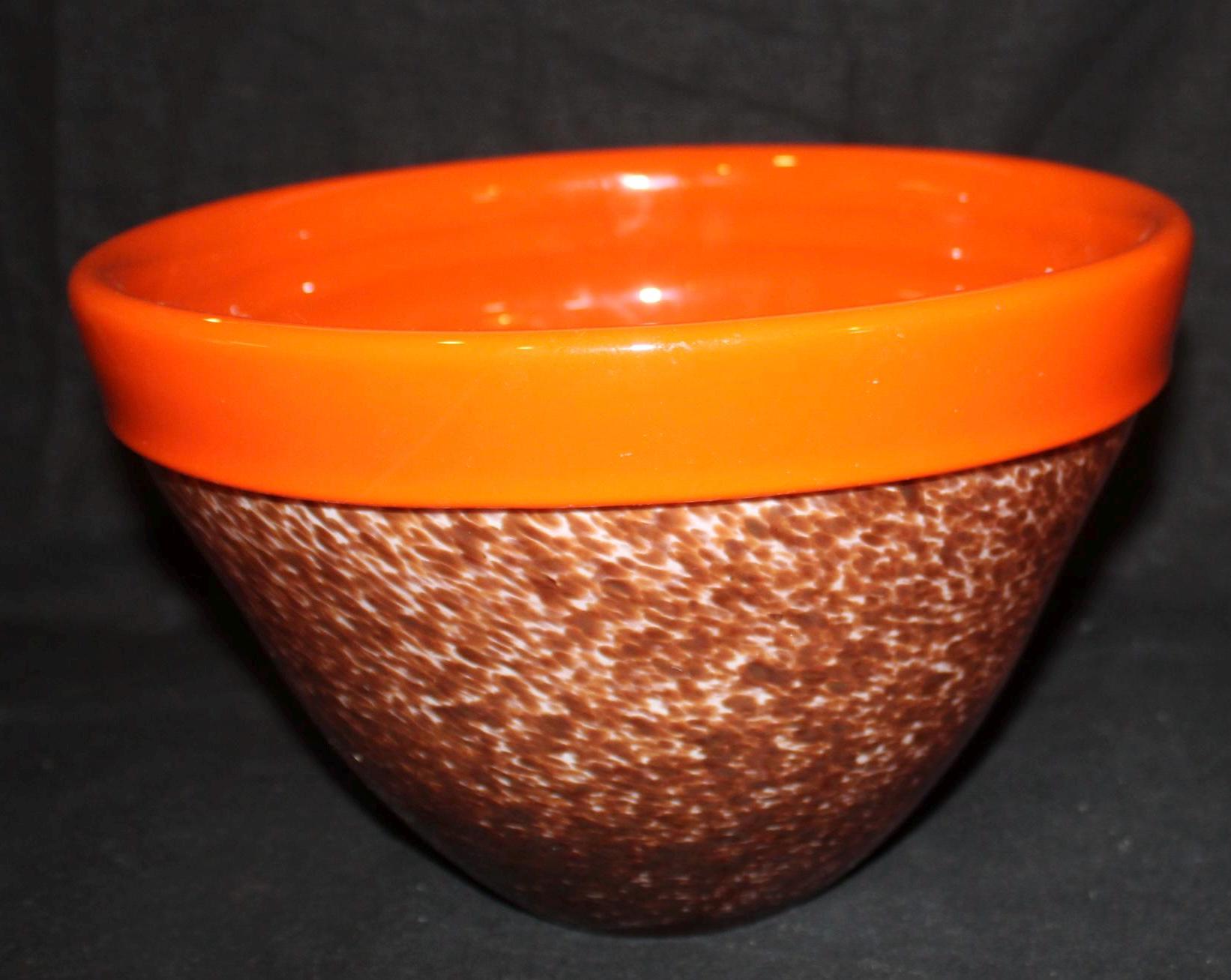 This Hand Blown Orange Glass Mixing Bowl is stunningly beautiful and a true work of art! The glossy orange hue is gorgeous above the brown woven designed base. The bowl is 10.5” in diameter x 6.5” tall and holds 12 cups. There are no chips or cracks. Please message us if you have any questions- Thanks for looking!