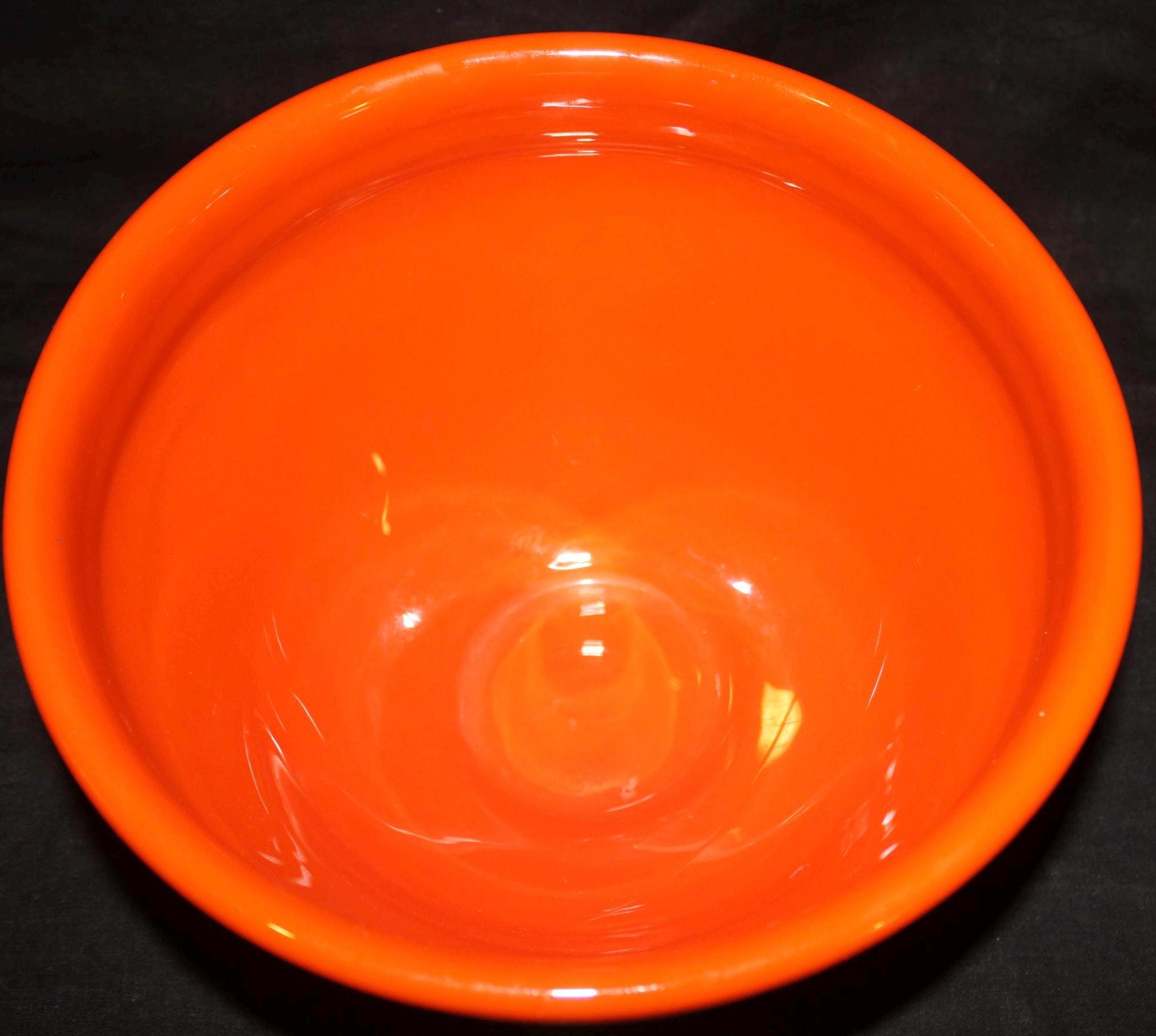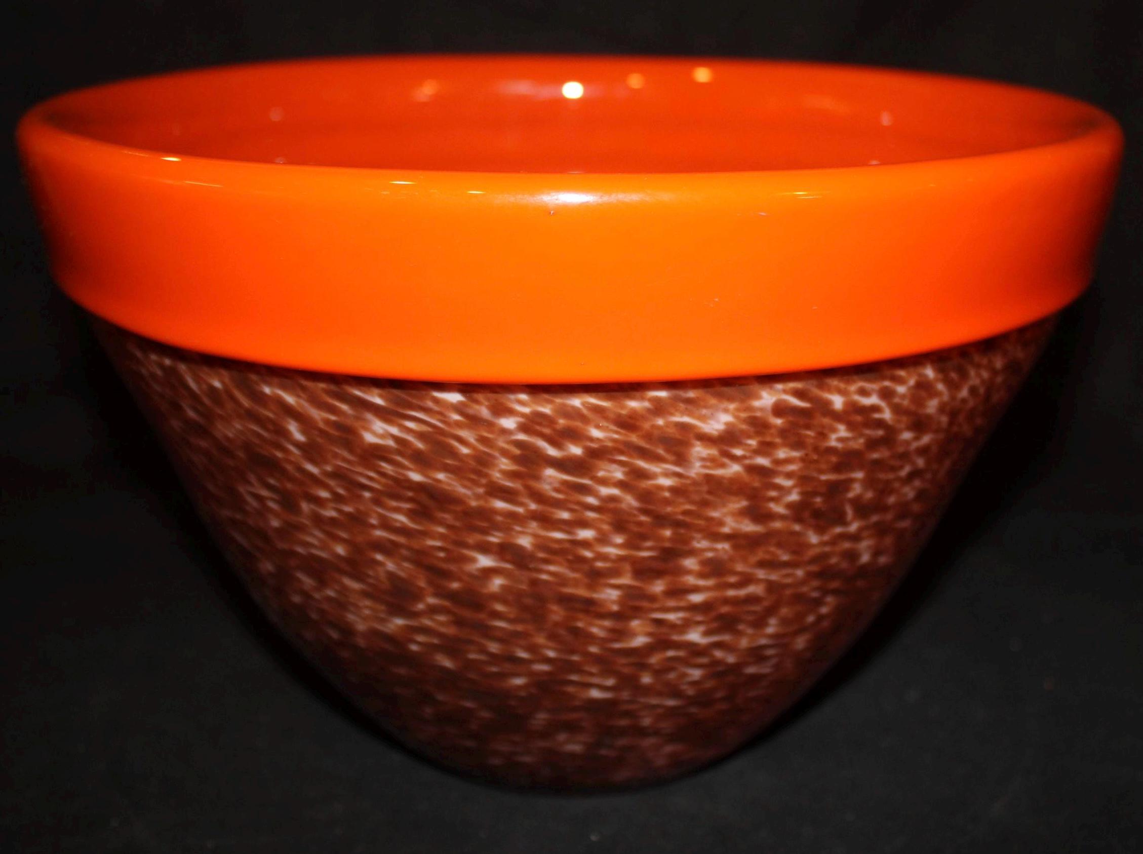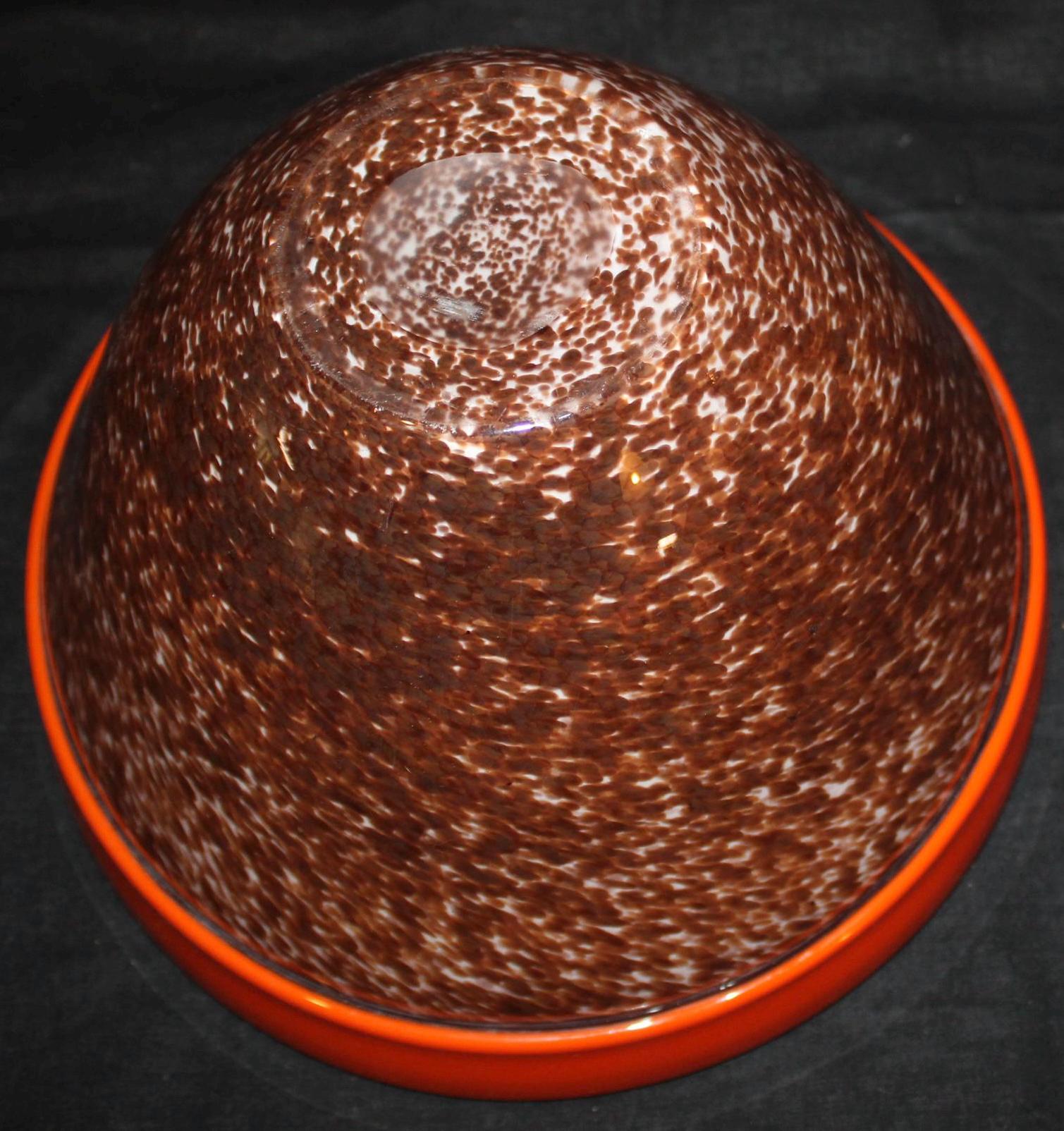 This Hand Blown Orange Glass Mixing Bowl is stunningly beautiful and a true work of art! The glossy orange hue is gorgeous above the brown woven designed base. The bowl is 10.5” in diameter x 6.5” tall and holds 12 cups. There are no chips or cracks. Please message us if you have any questions- Thanks for looking!