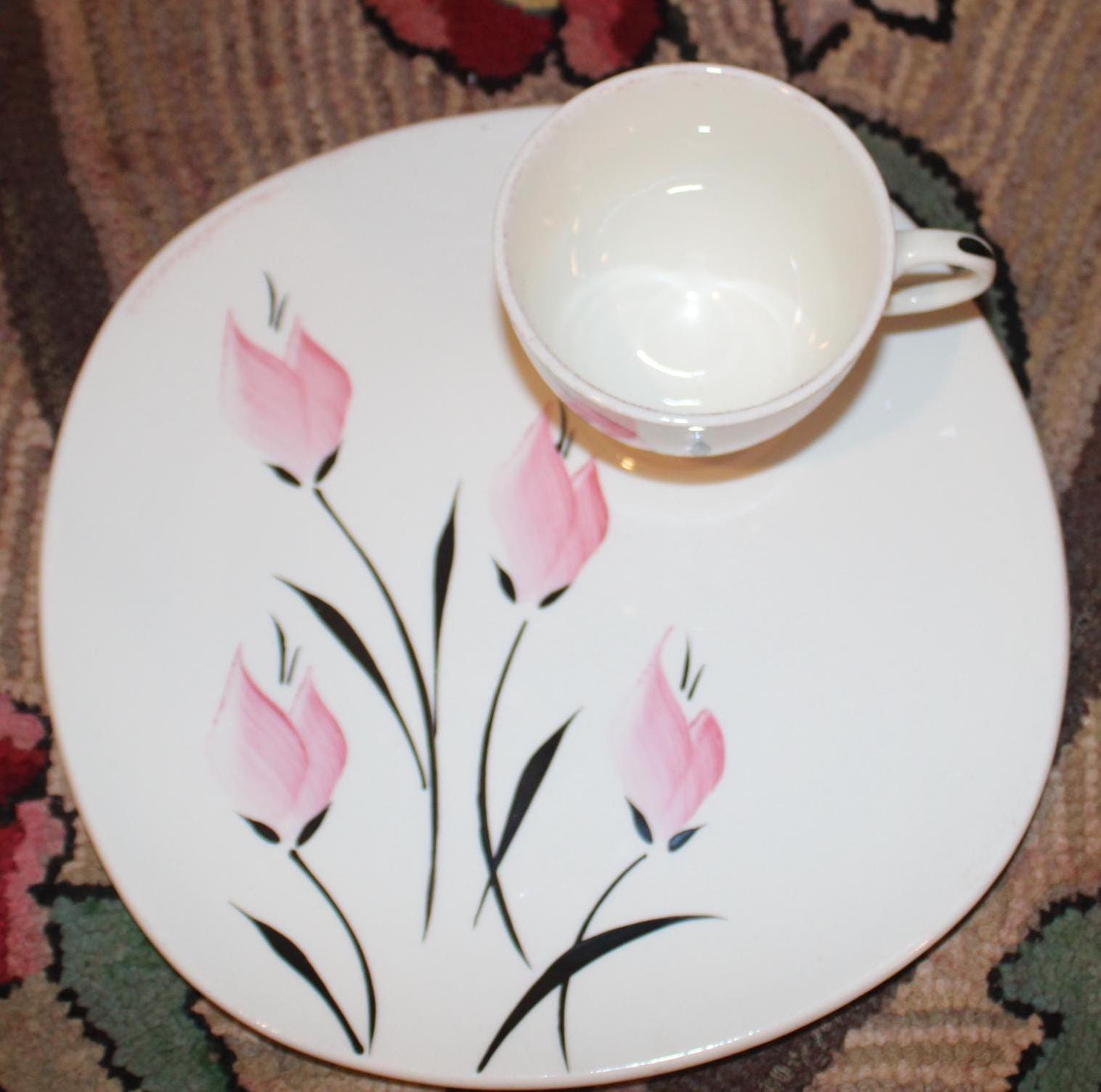 This Midcentury Eastern China Pale Pink Tulip Dish with Coffee Cup would be such a great addition to your modern table! Each plate measures 9.5" x 9.5"; the cup is 3.5'" in diameter. There are no chips or cracks- we have 3 in stock. Please message us if you have any questions- Thanks for looking!