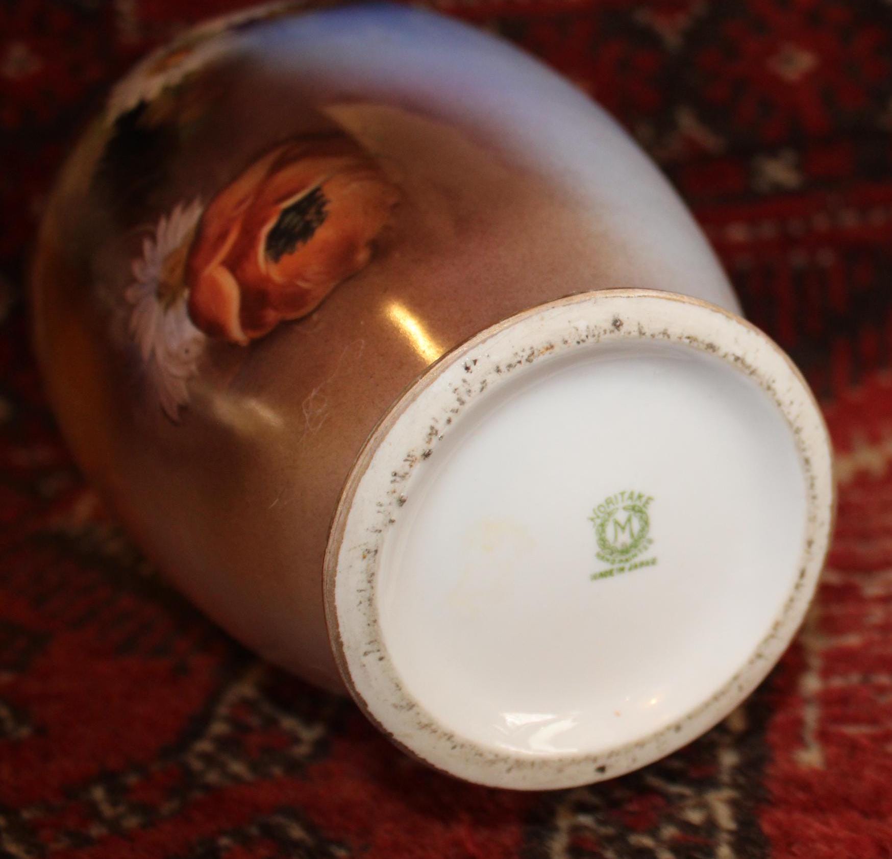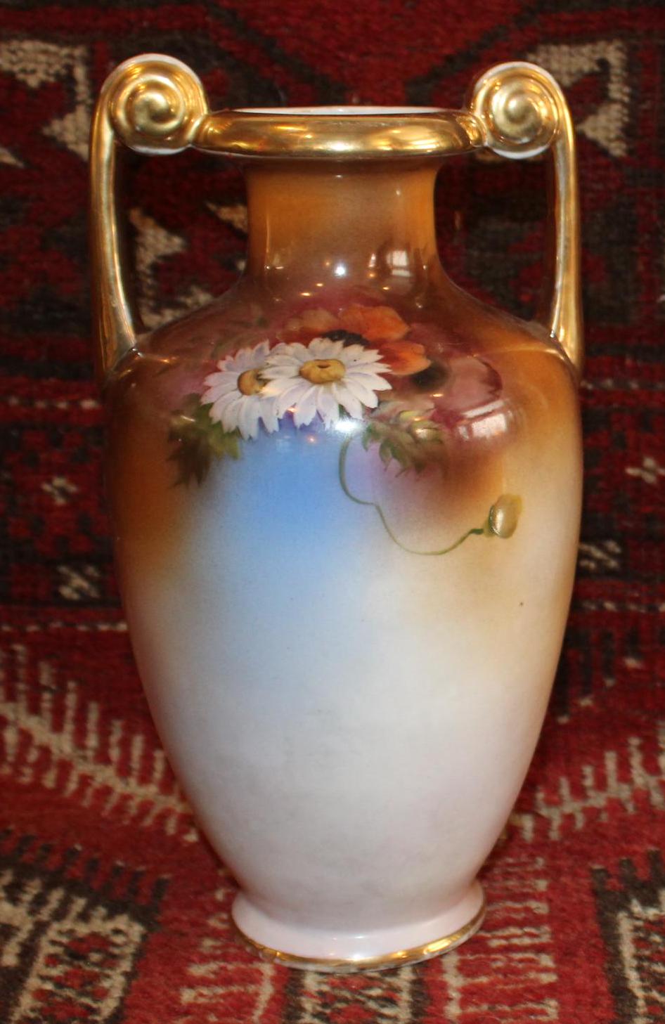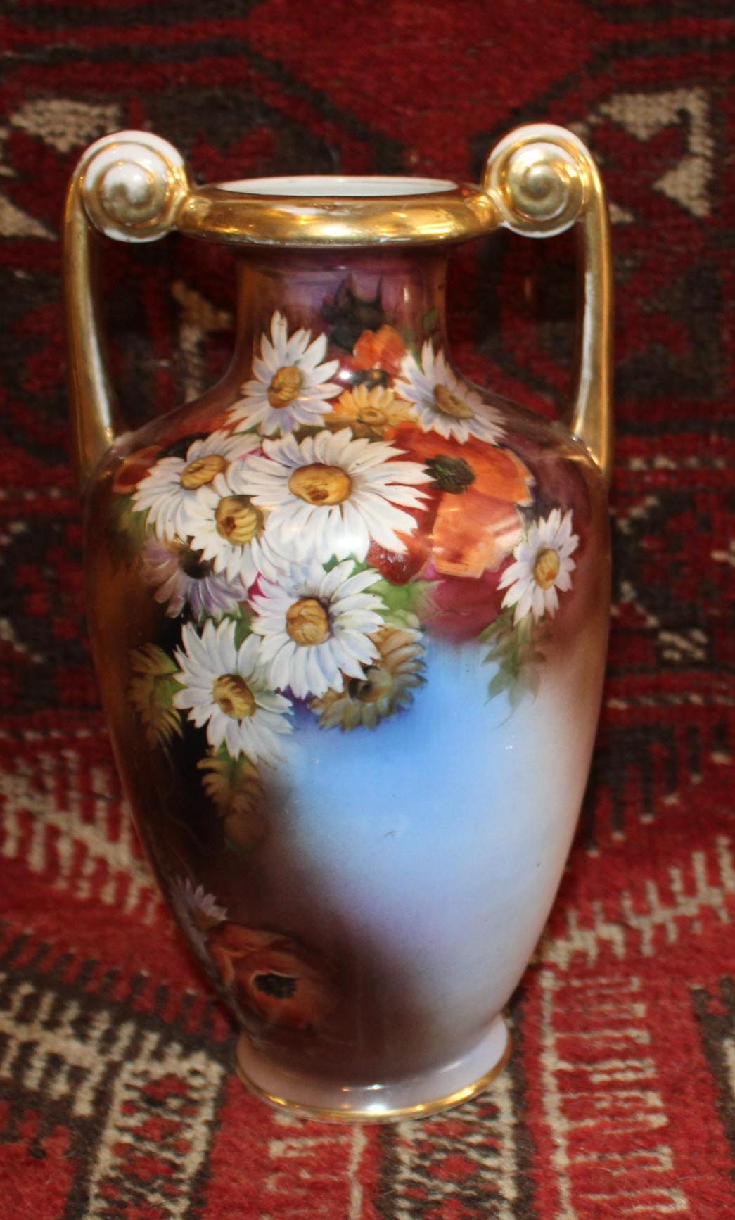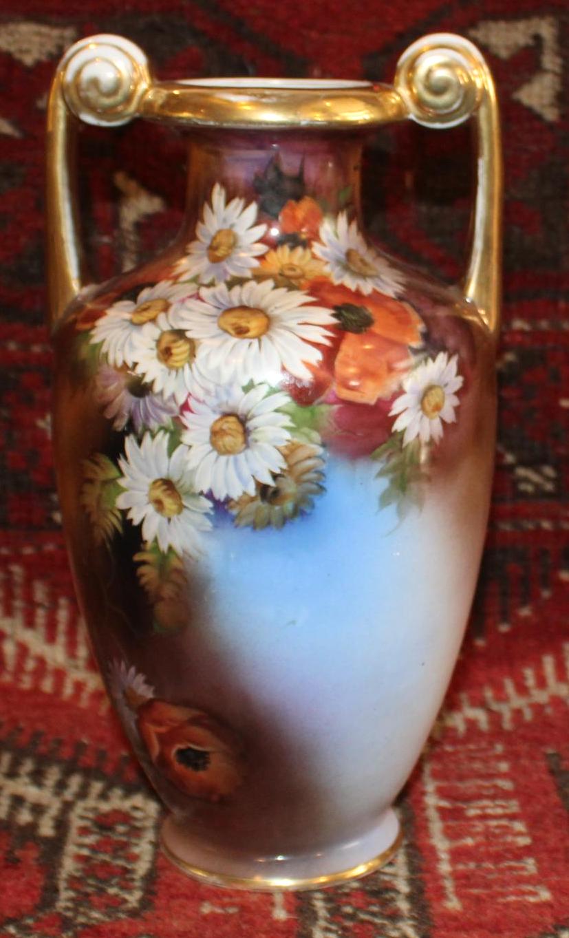This Vintage Noritake Handpainted Vase with Gorgeous Daisies framed by a Blue Background is stunning! The handpainted daisies and poppies are wonderfully painted by a skilled artist; the base, rim, and handles are finished with gold gilt which has been worn by time and use- charm galore! It measures 10.75" tall x 6" wide with a 2.5" wide mouth- perfect for a floral bouquet. There are no chips or cracks. Please message us if you have any questions- Thanks for stopping by!