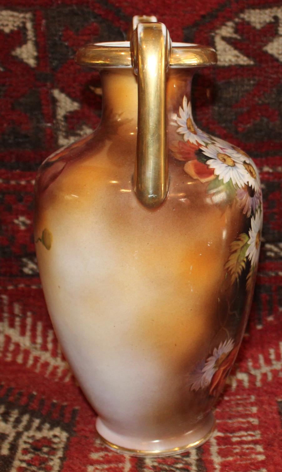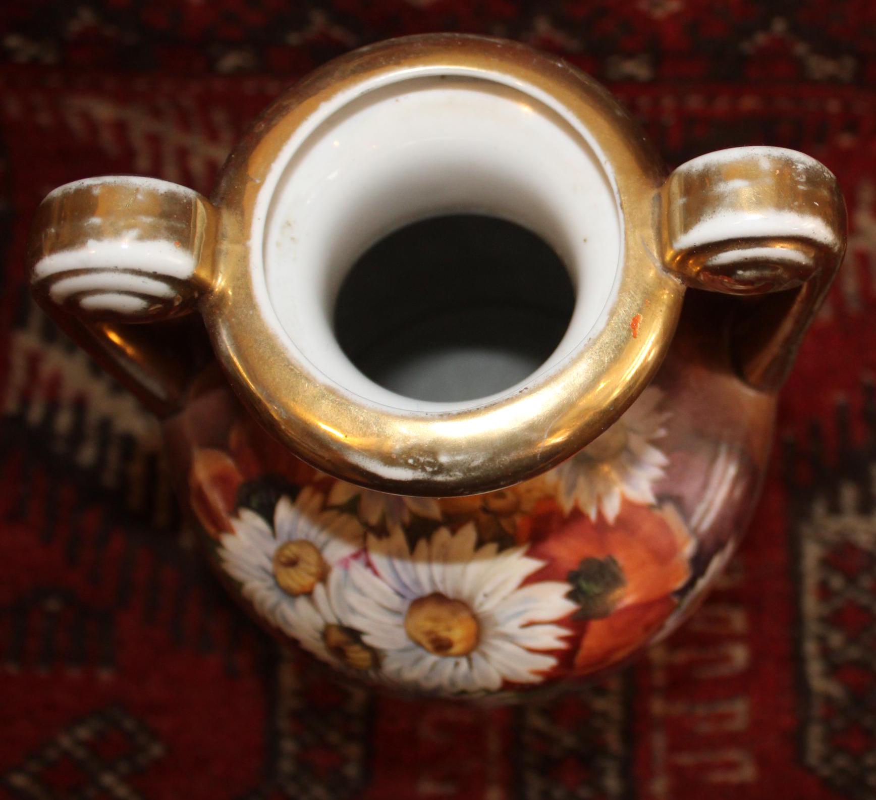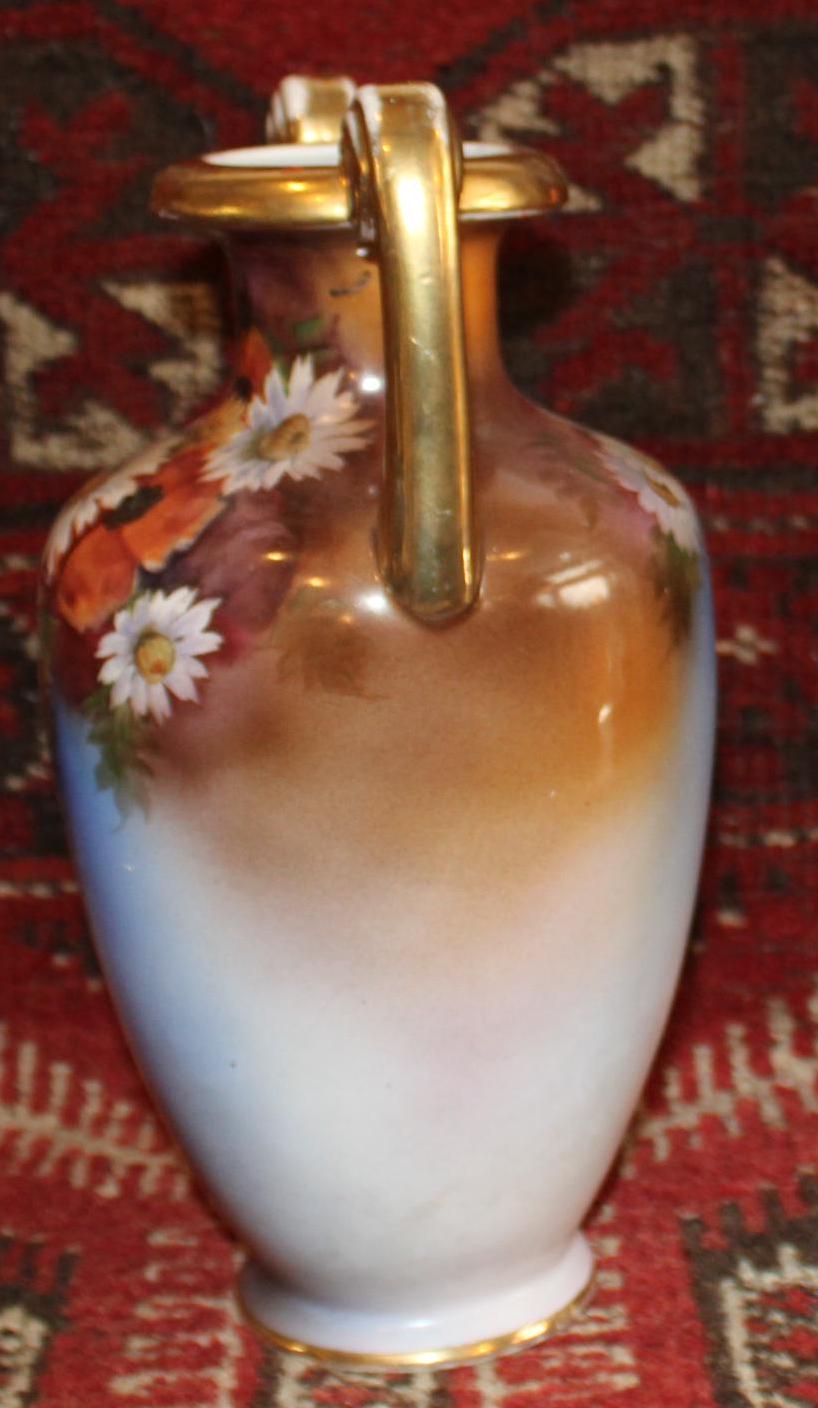 This Vintage Noritake Handpainted Vase with Gorgeous Daisies framed by a Blue Background is stunning! The handpainted daisies and poppies are wonderfully painted by a skilled artist; the base, rim, and handles are finished with gold gilt which has been worn by time and use- charm galore! It measures 10.75" tall x 6" wide with a 2.5" wide mouth- perfect for a floral bouquet. There are no chips or cracks. Please message us if you have any questions- Thanks for stopping by!