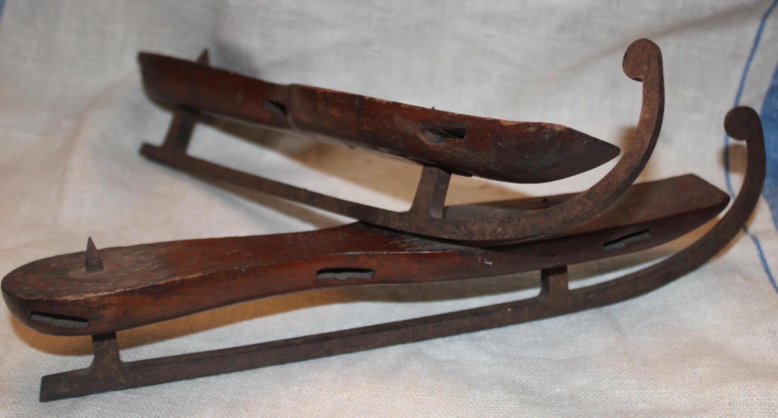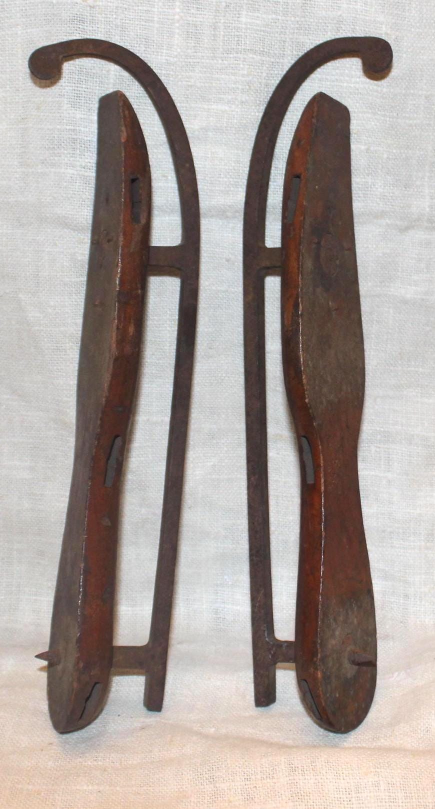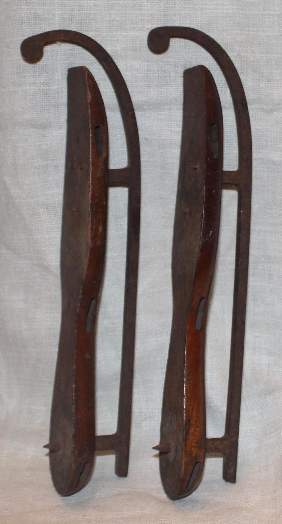 Wonderful 19th Century Curly Tip Primitive Wood and Steel Blade Ice Skates- Great Patina!