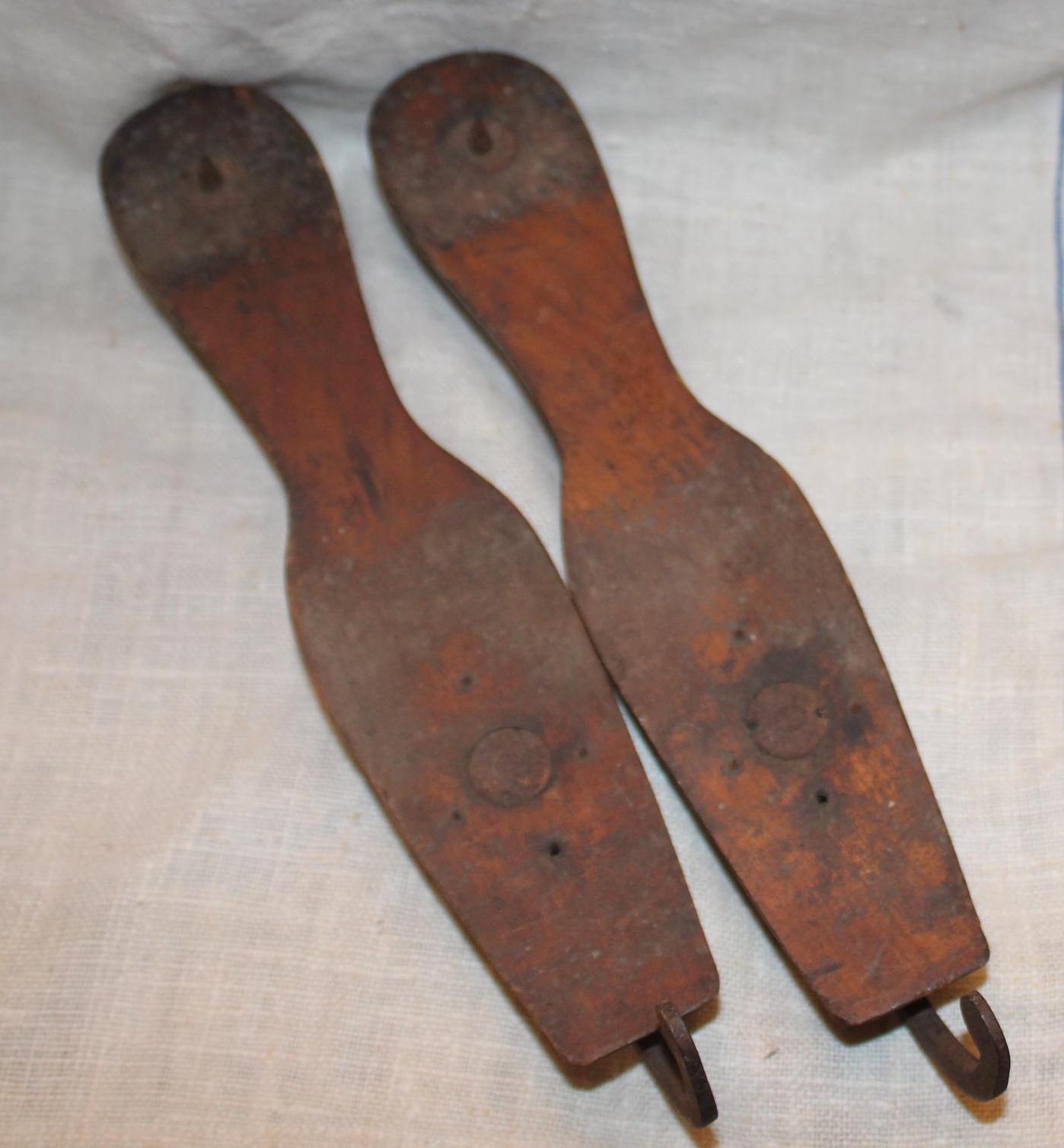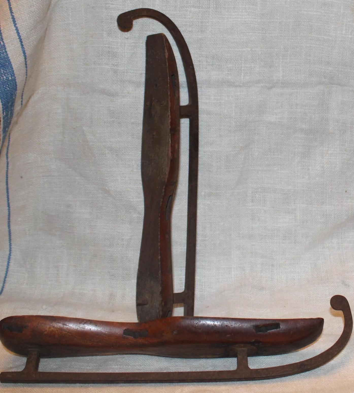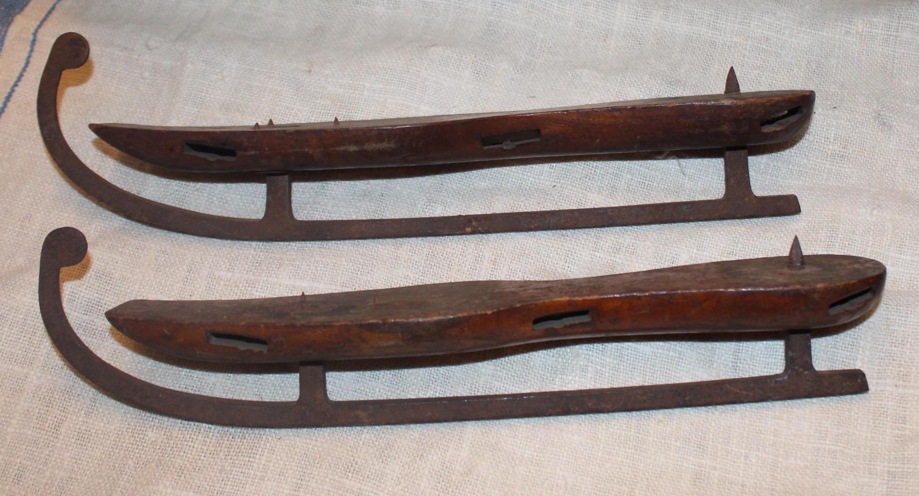 Wonderful 19th Century Curly Tip Primitive Wood and Steel Blade Ice Skates- Great Patina!