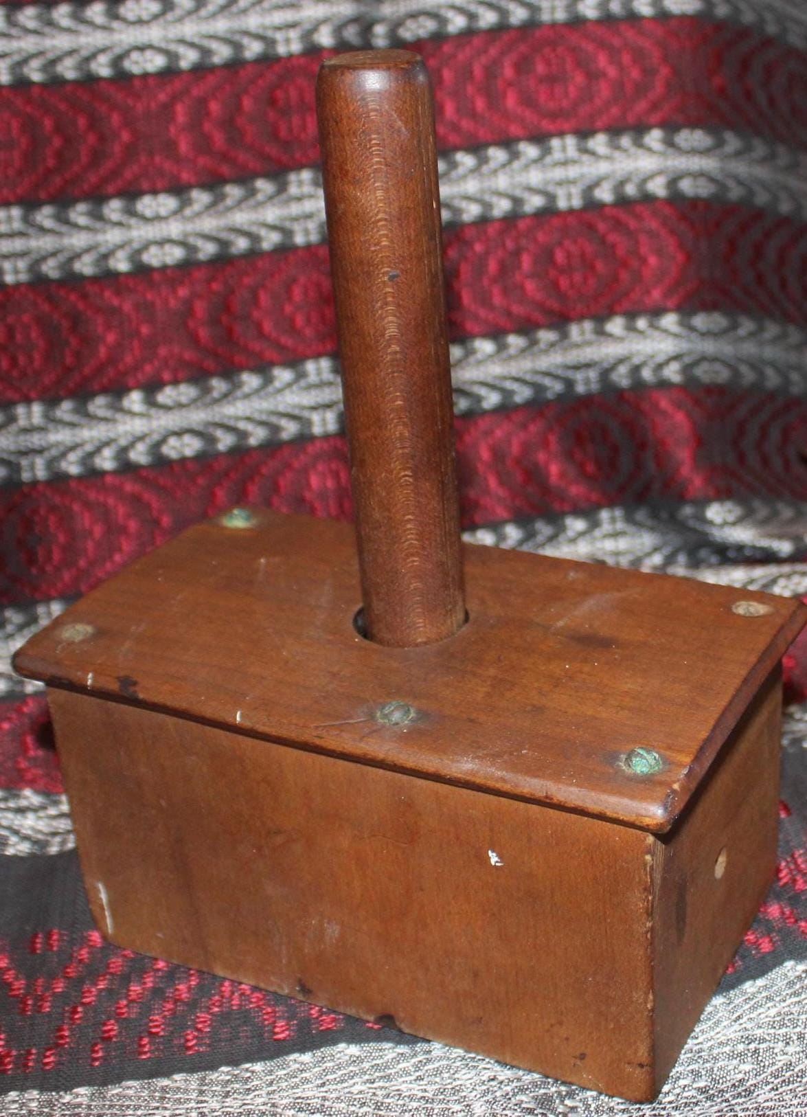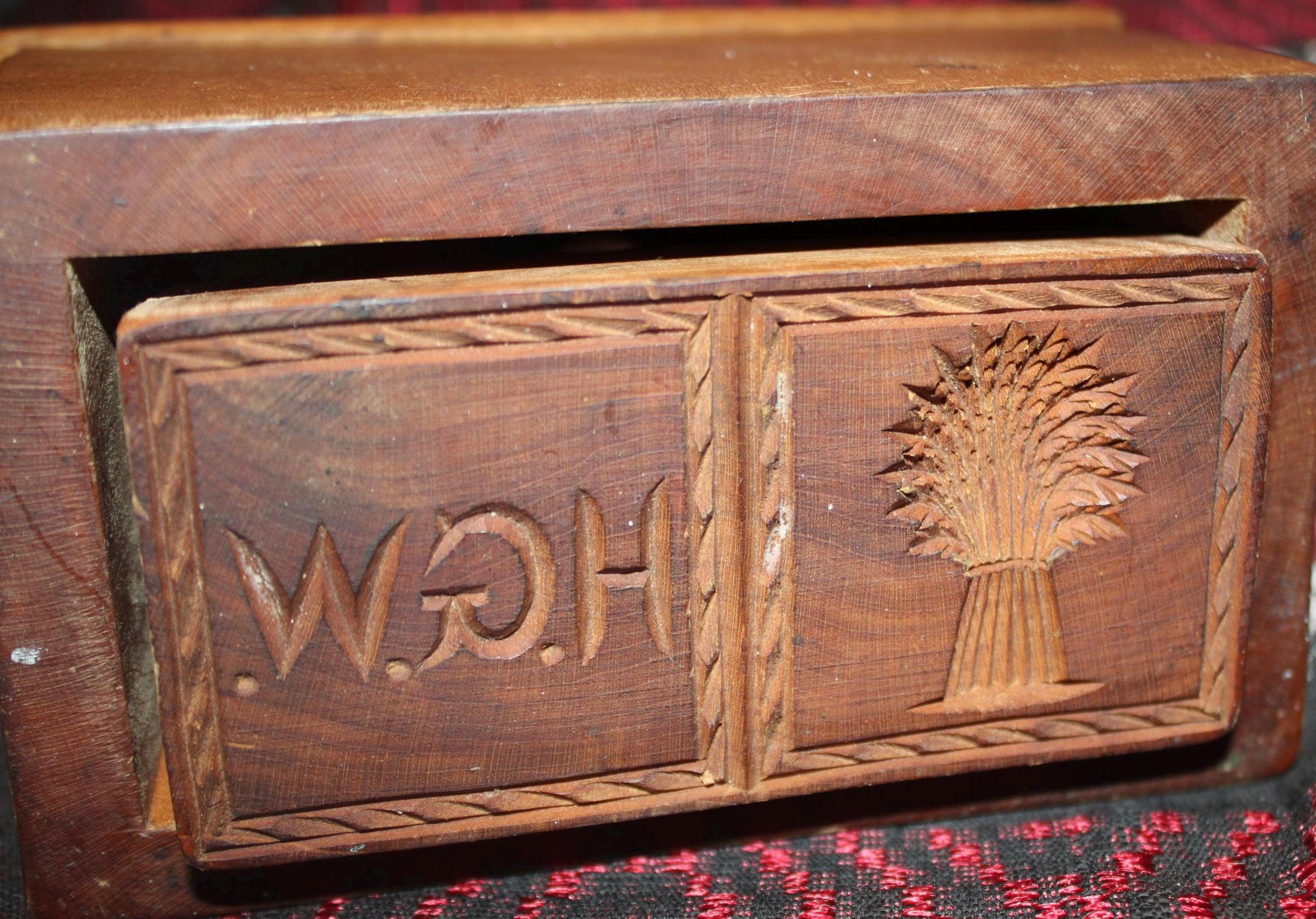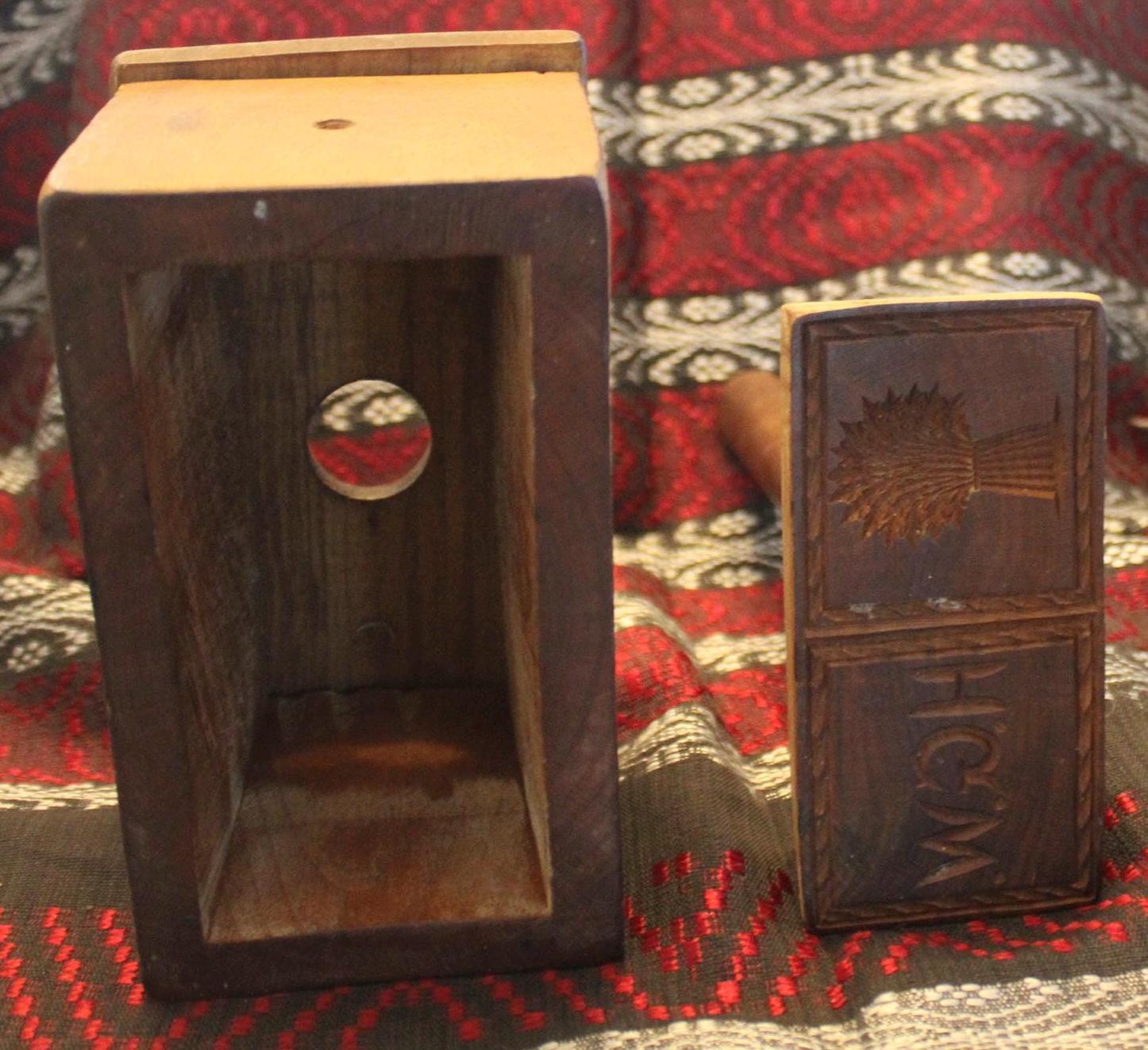 This Fantastic Antique HGW and Wheat Rectangular Butter Stamp/Press would be a great addition to your antique butter press collection! It is very well carved and detailed- the bundle of wheat as well as the “HGW” monogram are surrounded by a gorgeous carved border. The most interesting aspect of this mold is that the wooden square that houses the stamp is carved from a single piece of maple; the square’s cap is slightly warped and is fastened with tiny screws (two are missing- please see our photos). It is 6”x 3.25” with a plunger handle that is 8.5” long. The dry attic surface and rich brown patina are wonderful. Please message us if you have any questions- Thanks for looking!