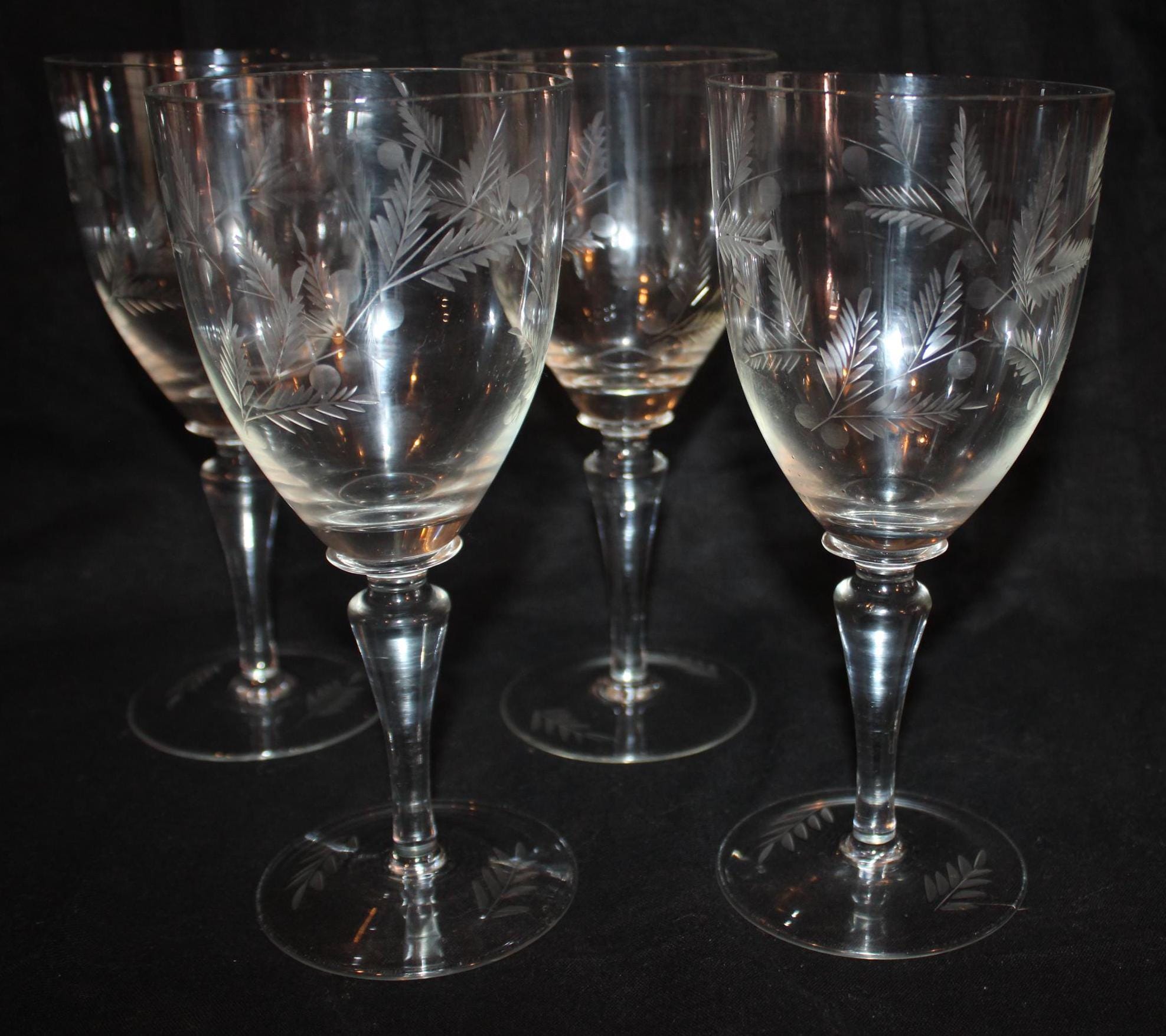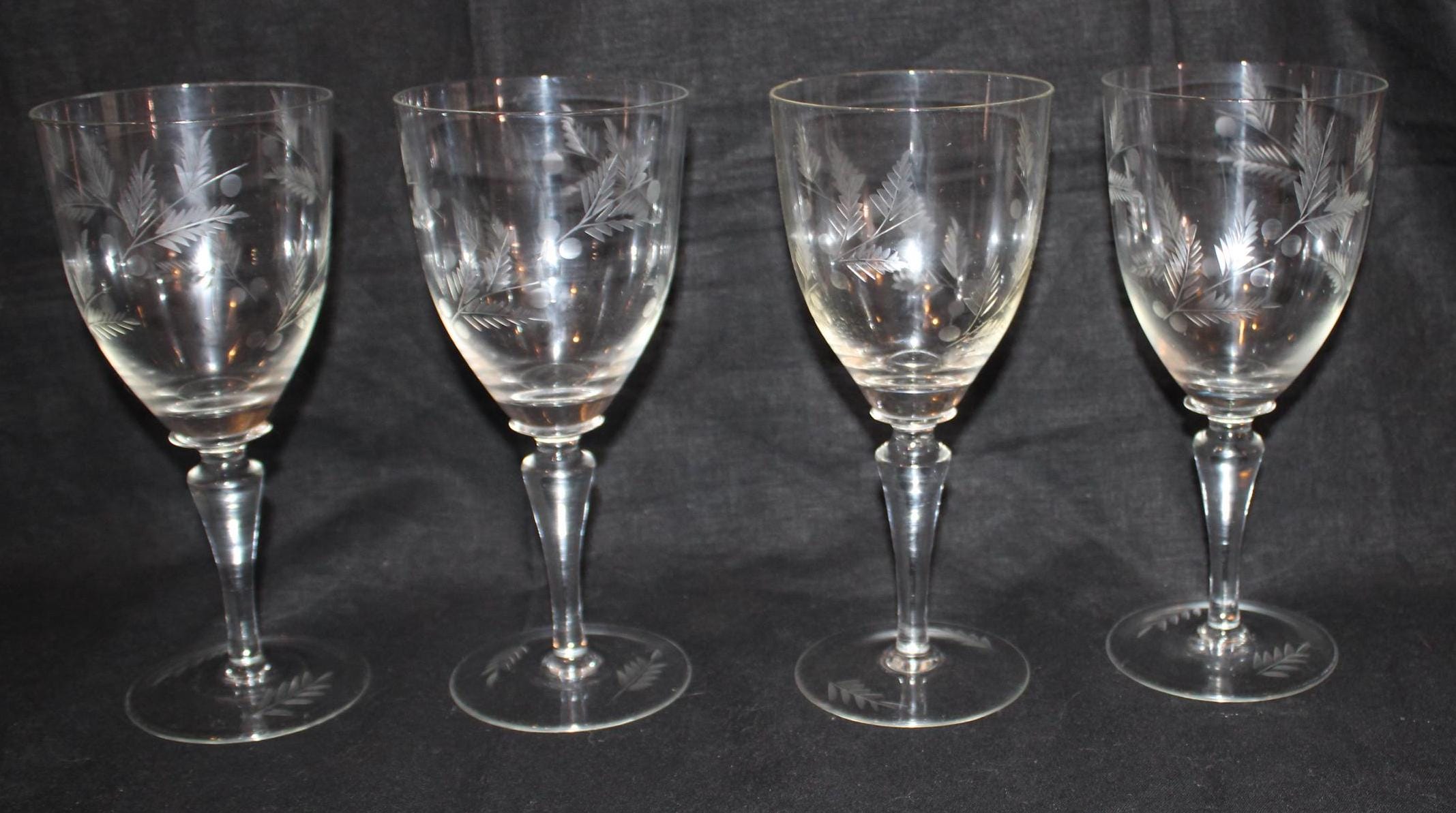This Gorgeous Set of 4 Etched Wine Glasses would look fabulous with any place setting! Each glass is 7.75" tall x 3.5" in diameter and each holds 8 oz. Each is beautifully etched with leaves and berries. There are no chips or cracks. Please message us if you have any questions- Thanks for looking!