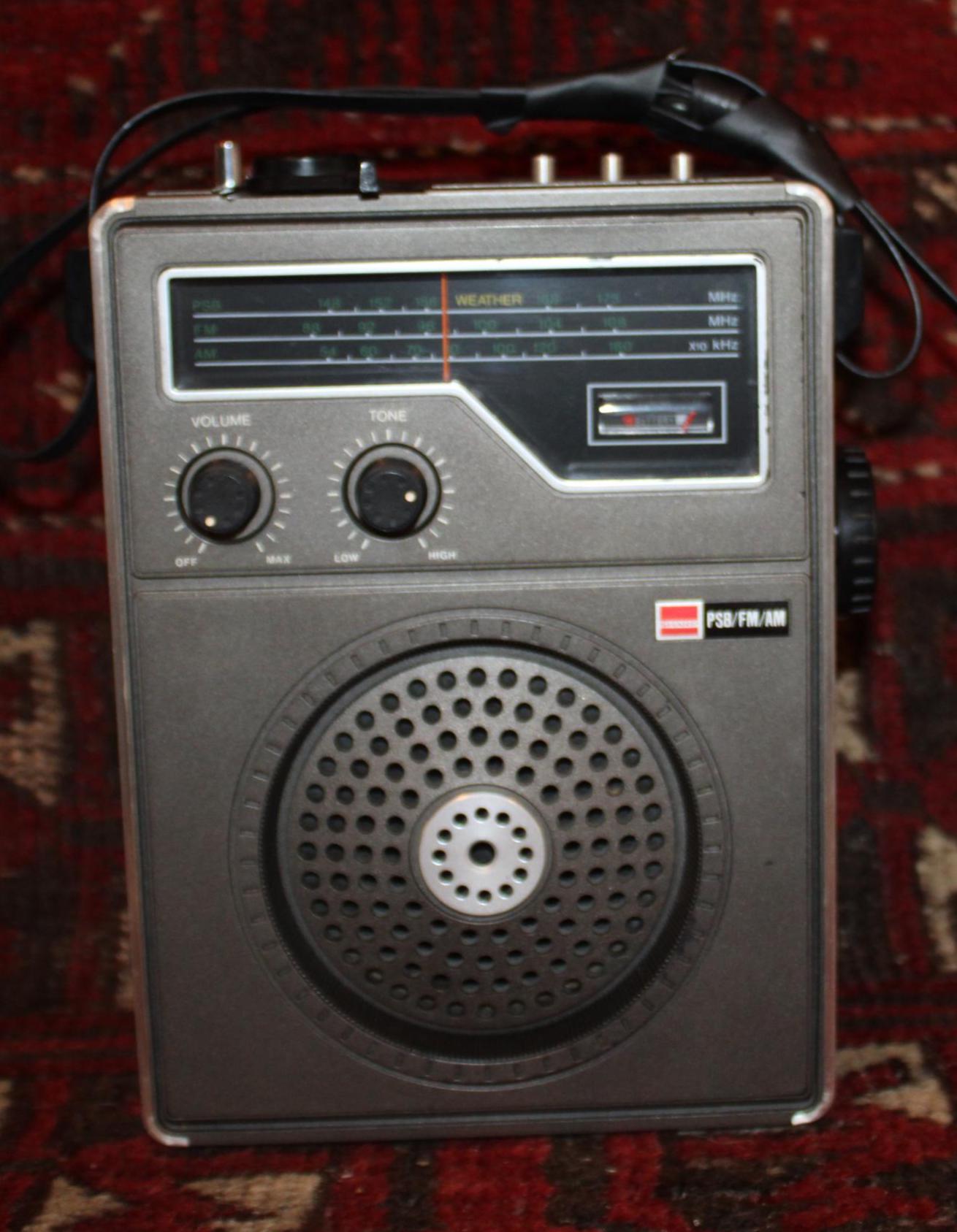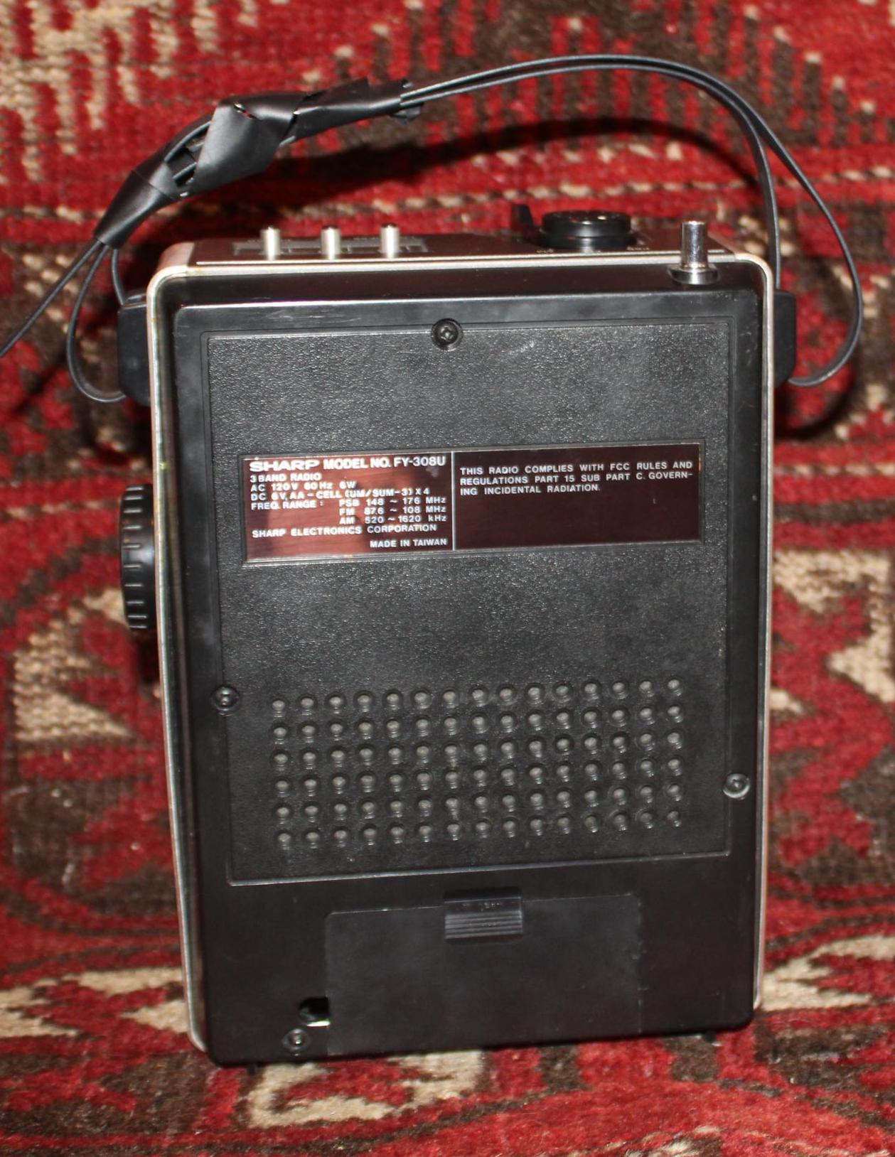 This Very Cool Sharp Portable 3 Band Transistor Radio- Model FY-308U- would be such a great addition to your radio collection! It sounds great and tunes easily; it has a telescopic tantenna that extends 25 inches. It can be powered by electricity or batteries (not included). It retains its original shoulder strap which has been broken and taped (please see our photos). Please message us if you have any questions- Thanks for looking!