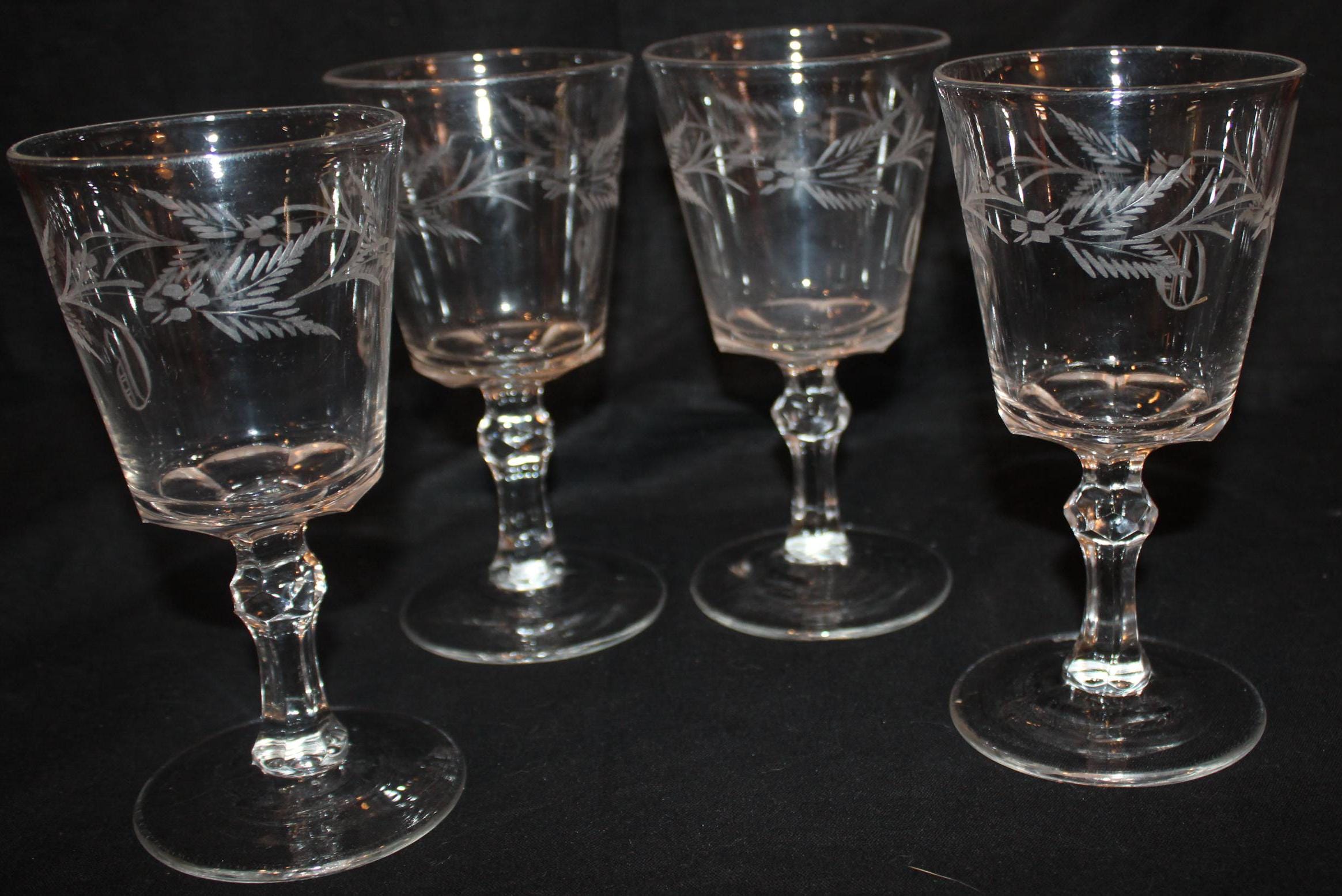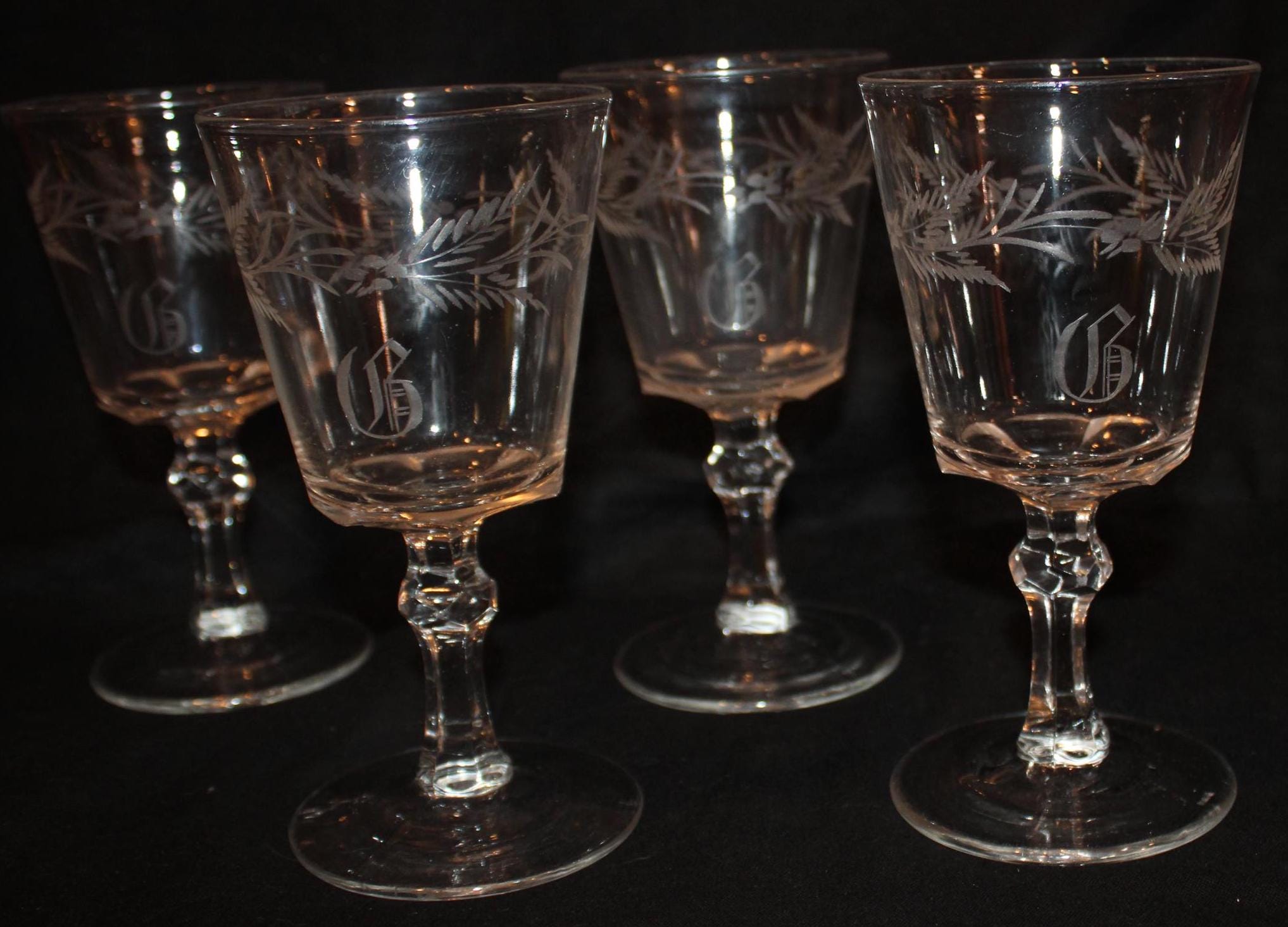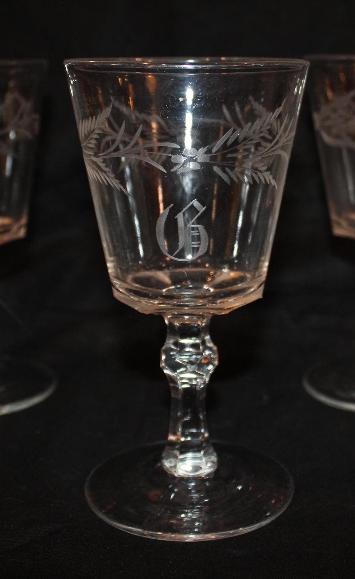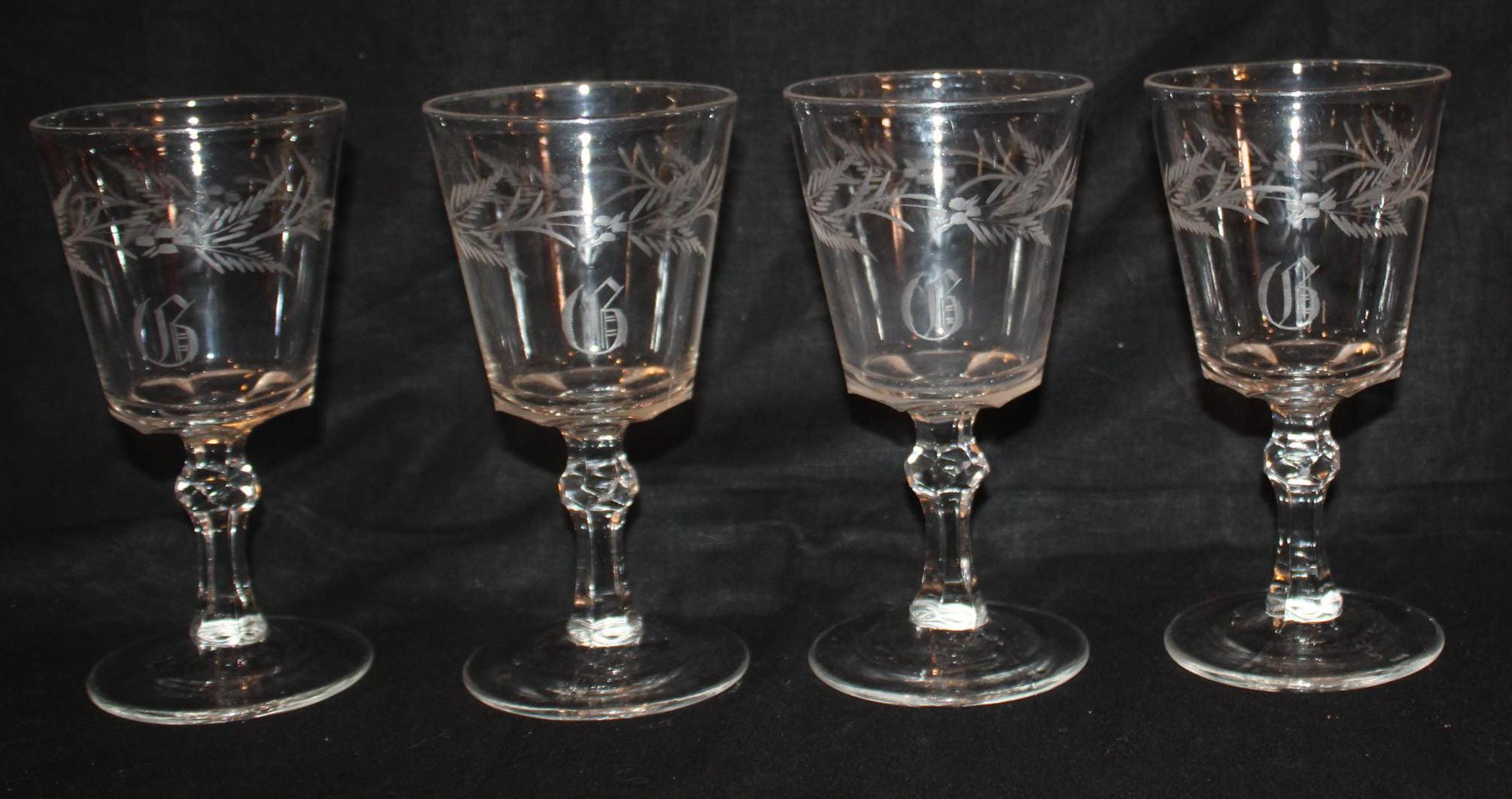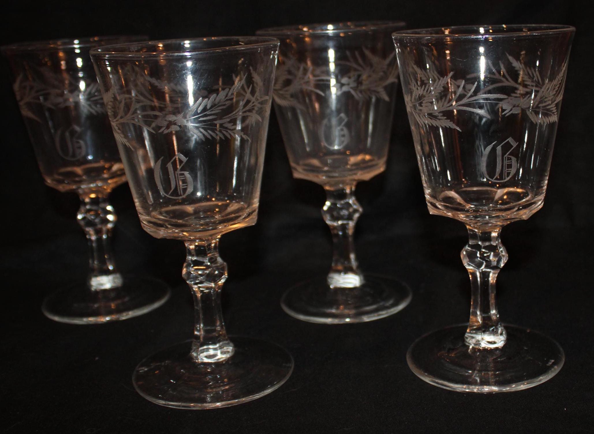 Four Gorgeous Floral Etched Old English Style "G" Monogrammed Pedestal Cocktail/Wine Glasses- Bar/Wedding/Party/Anniversary