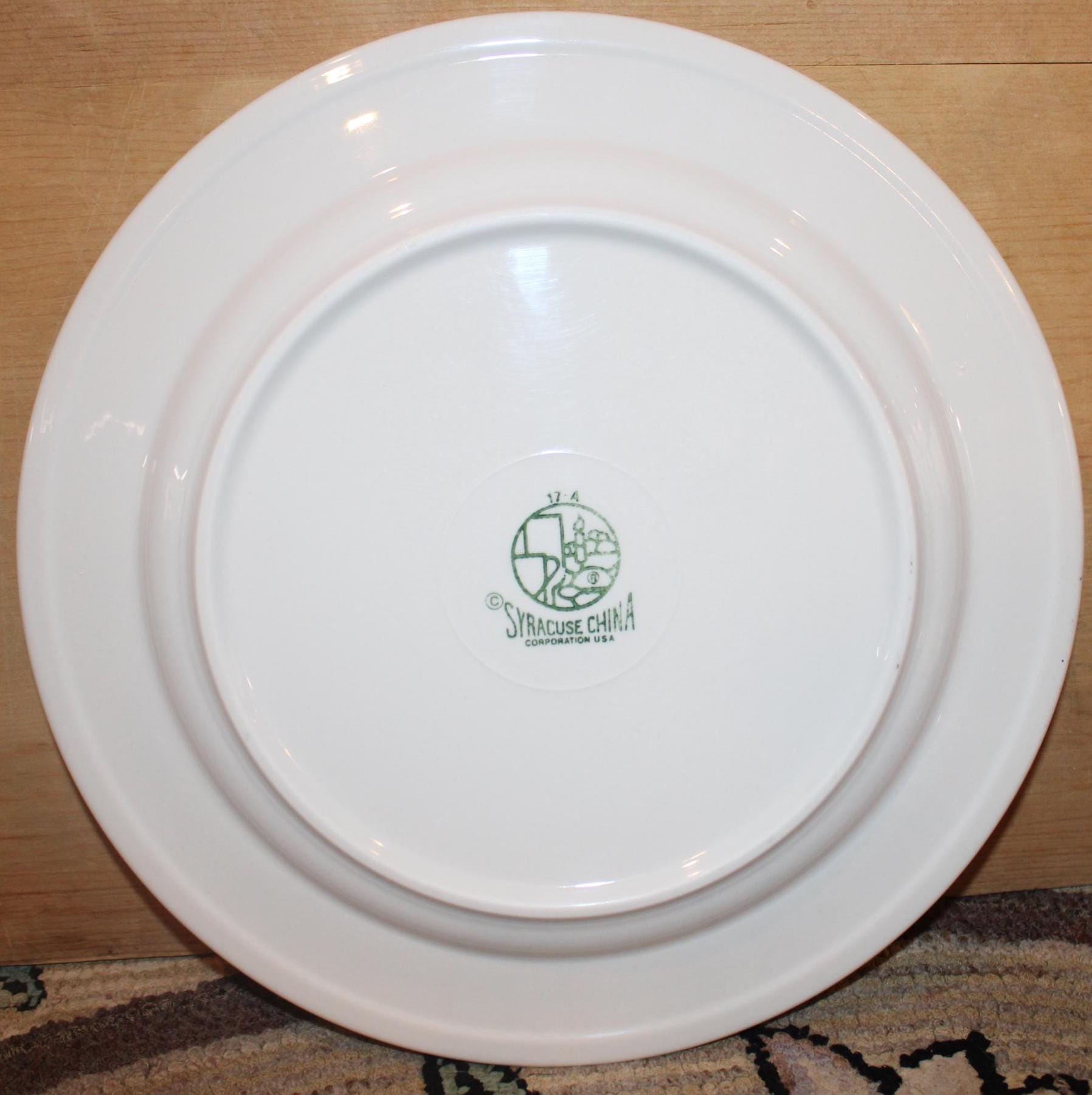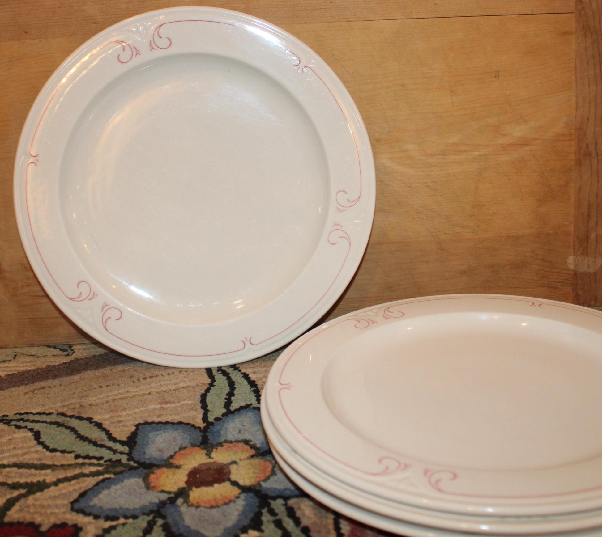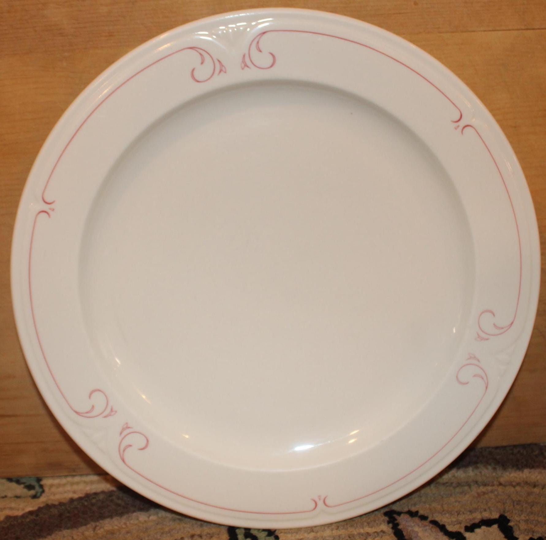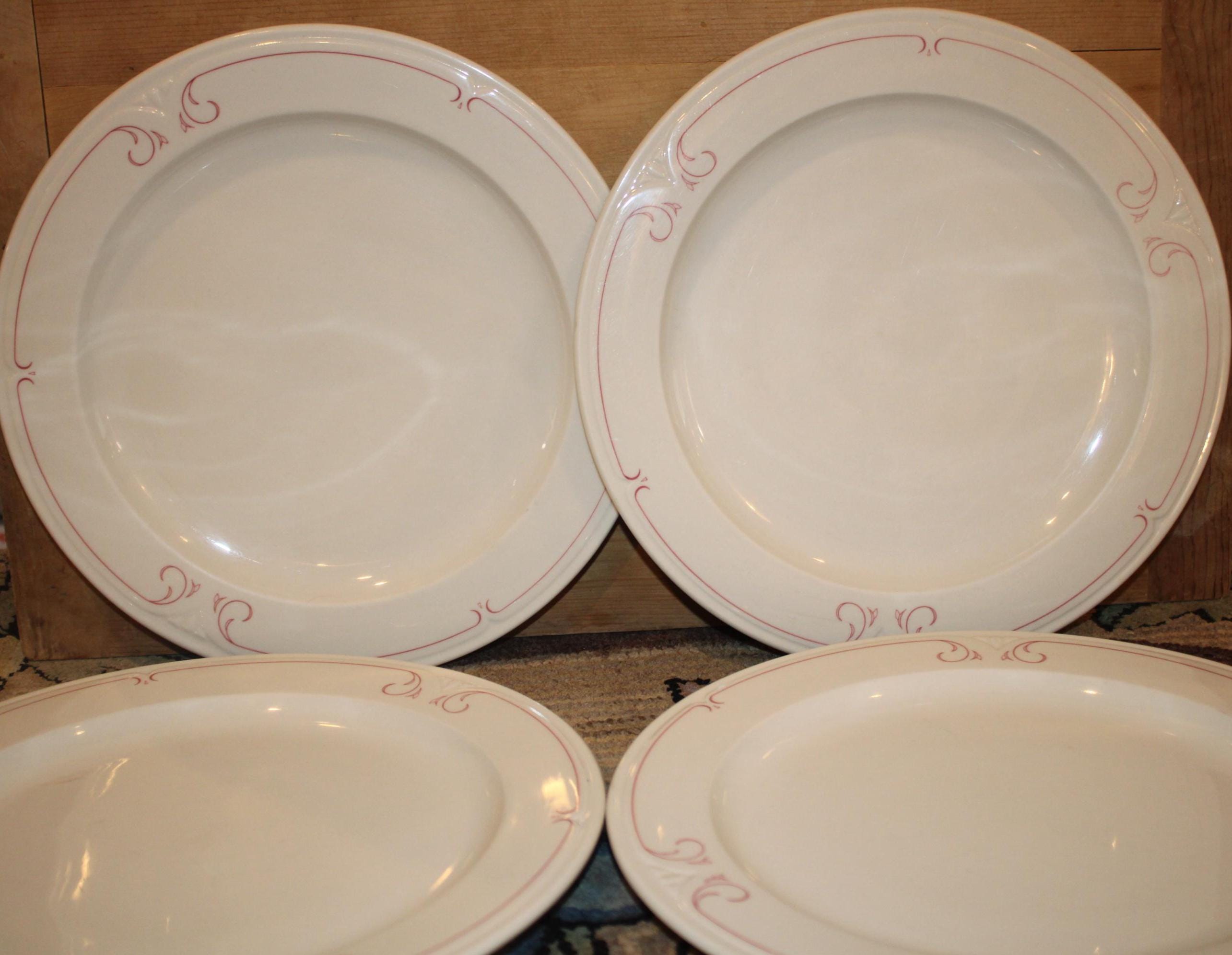 This Set of Four Vintage Syracuse Dinner Plates in the Melrose Pattern is so pretty! Each plate is 10.75" in diameter- substantial and resilient- perfect for a 4th of July barbecue with family and friends! The design is elegant with red scrolling along the rim. There are no chips or cracks- Please message us if you have any questions- Thanks for looking!