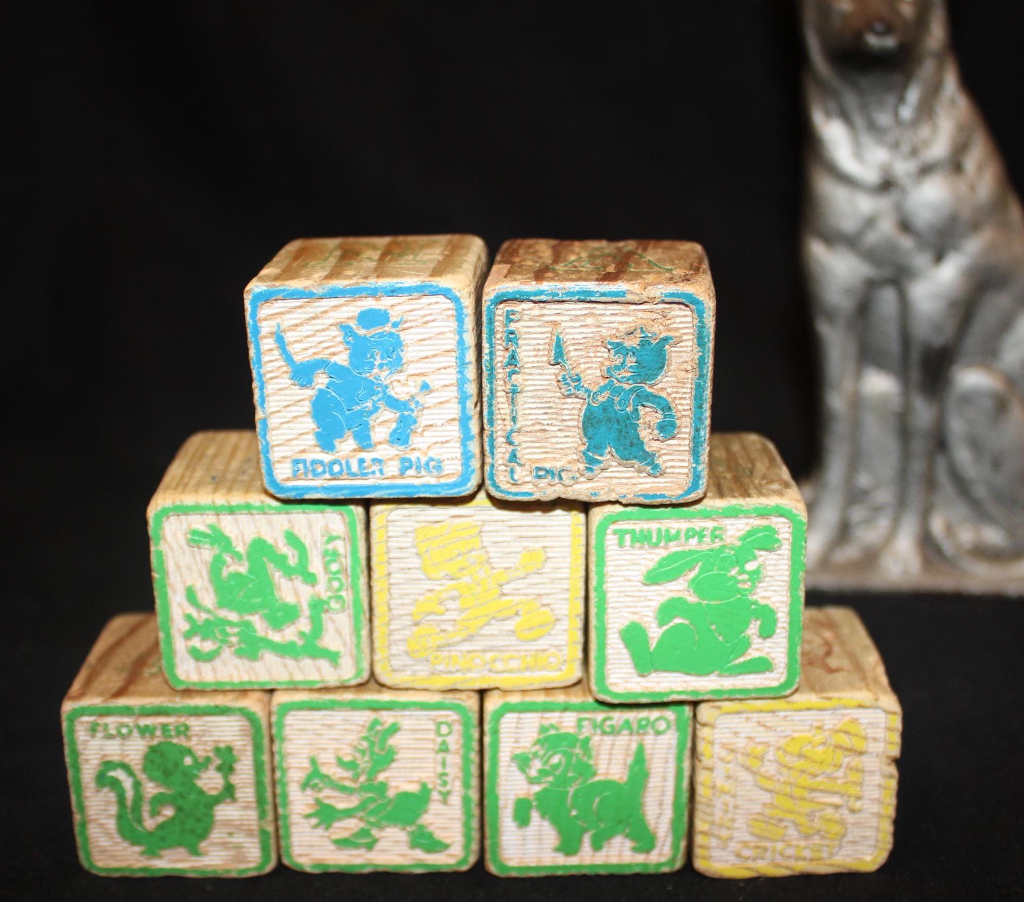 This Set of 59 Wonderful Vintage Primary Color Wooden Alphabet Blocks would be a lovely addition to your farmhouse decor or a great gift to that person in your life who loves to spell! Each block measures 1.25" square. Each is brightly painted with red, blue, yellow, or green with wear that is reflective of age and use. There are Disney blocks included in this set. Please message us if you have any questions- Thank you for looking!