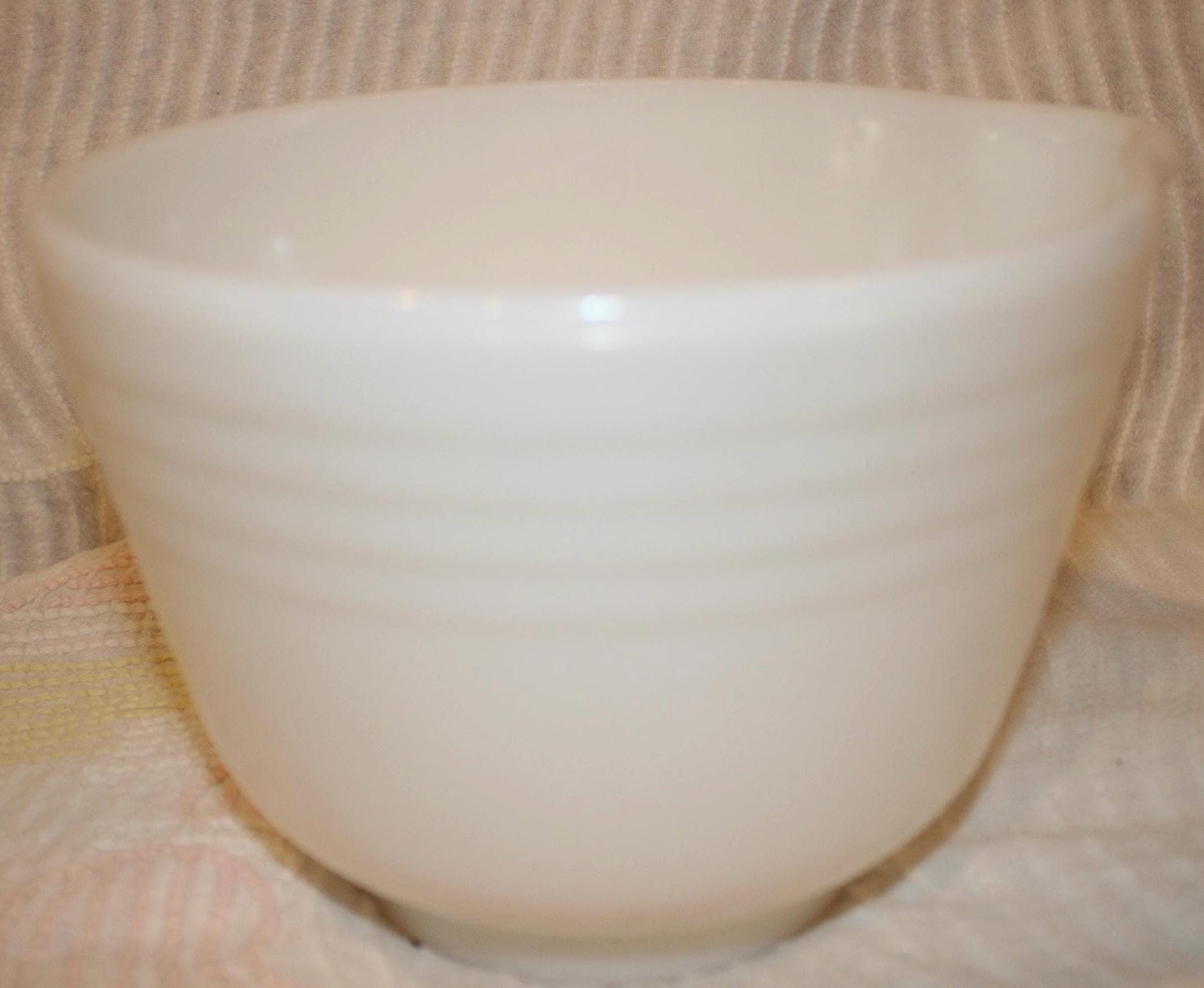 This Pyrex Hamilton Beach Mixing Bowl is in wonderful condition with no chips or cracks. It has a ribbed rim and a wonderful pouring lip. It measures 6.75” in diameter x 4.5” tall and holds 1 quart. Please message us if you have any questions- Thanks for looking!
