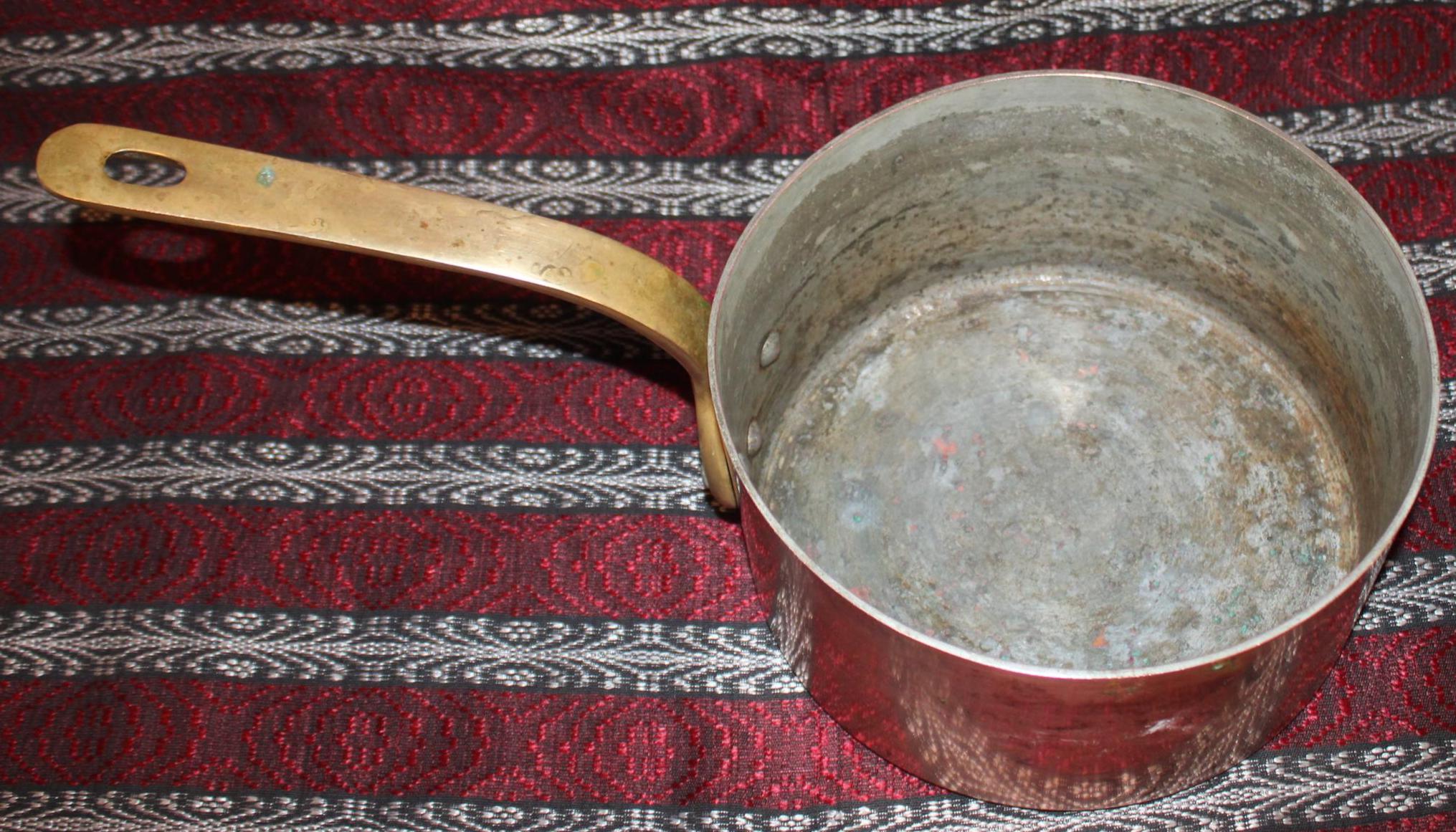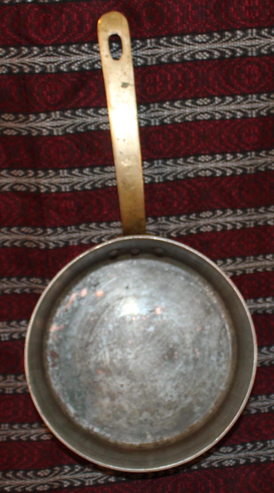 Did we say this pan is HEAVY?1? It has a magnificent handle that is solidly attached by 3 rivets. It measures 8" in diameter x 4.5" tall; the handle extends 8". It holds 8 cups and weighs 5 lbs. 9 oz. There are no dents, but there is wear and oxidation to the interior tin whicg can be seen in our photos.