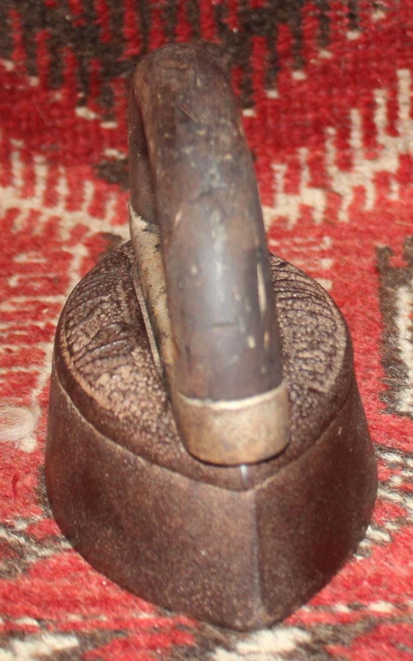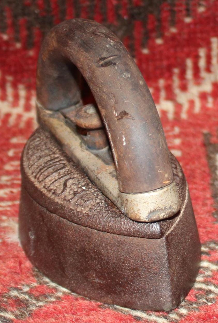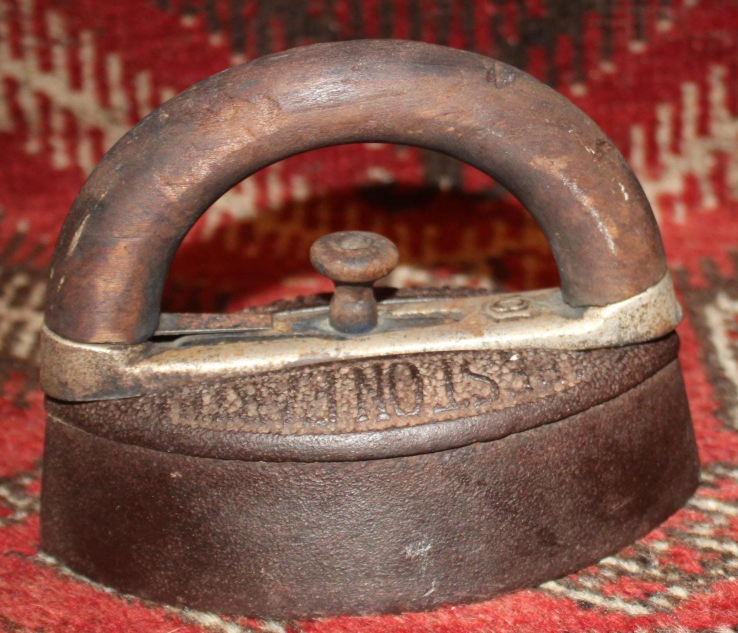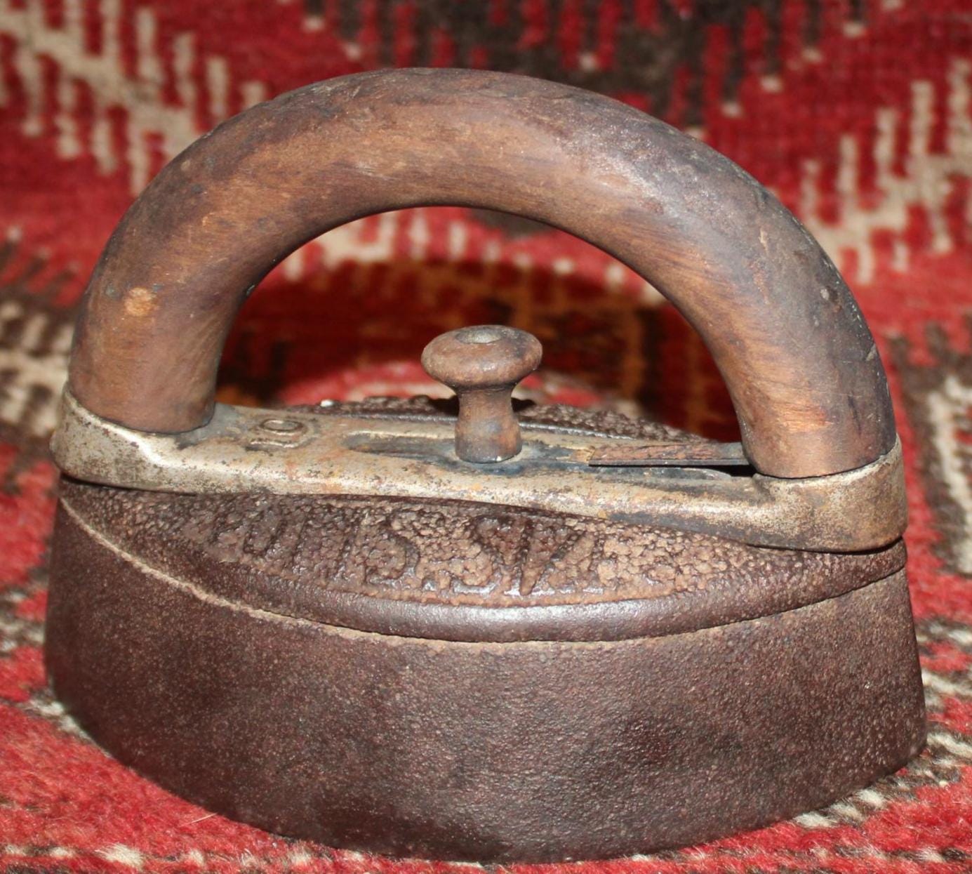 Some history: "Mary Florence Potts of Ottumwa, Iowa revolutionized the ironing process when she patented her detachable handled sad iron in 1871. Her iron was originally sold as a set of three hollow bases with one handle and a stand. The extra bases were left on the stove to heat while the clothes presser ironed, and when the present iron cooled the handle was switched to an already heated base. The body of the Potts iron was cast hollow (rather than solid) and the bottom had a thicker layer of iron than the sides. It was filled with material that was a non-conductor of heat, such as plaster of paris, cement, or clay. Consequently, not as much heat would radiate up. Mrs. Potts claimed in her patent that this material held the heat longer so that more garments could be ironed without reheating the iron. Another advantage to her iron was that it was double-pointed so one could iron in either direction.
