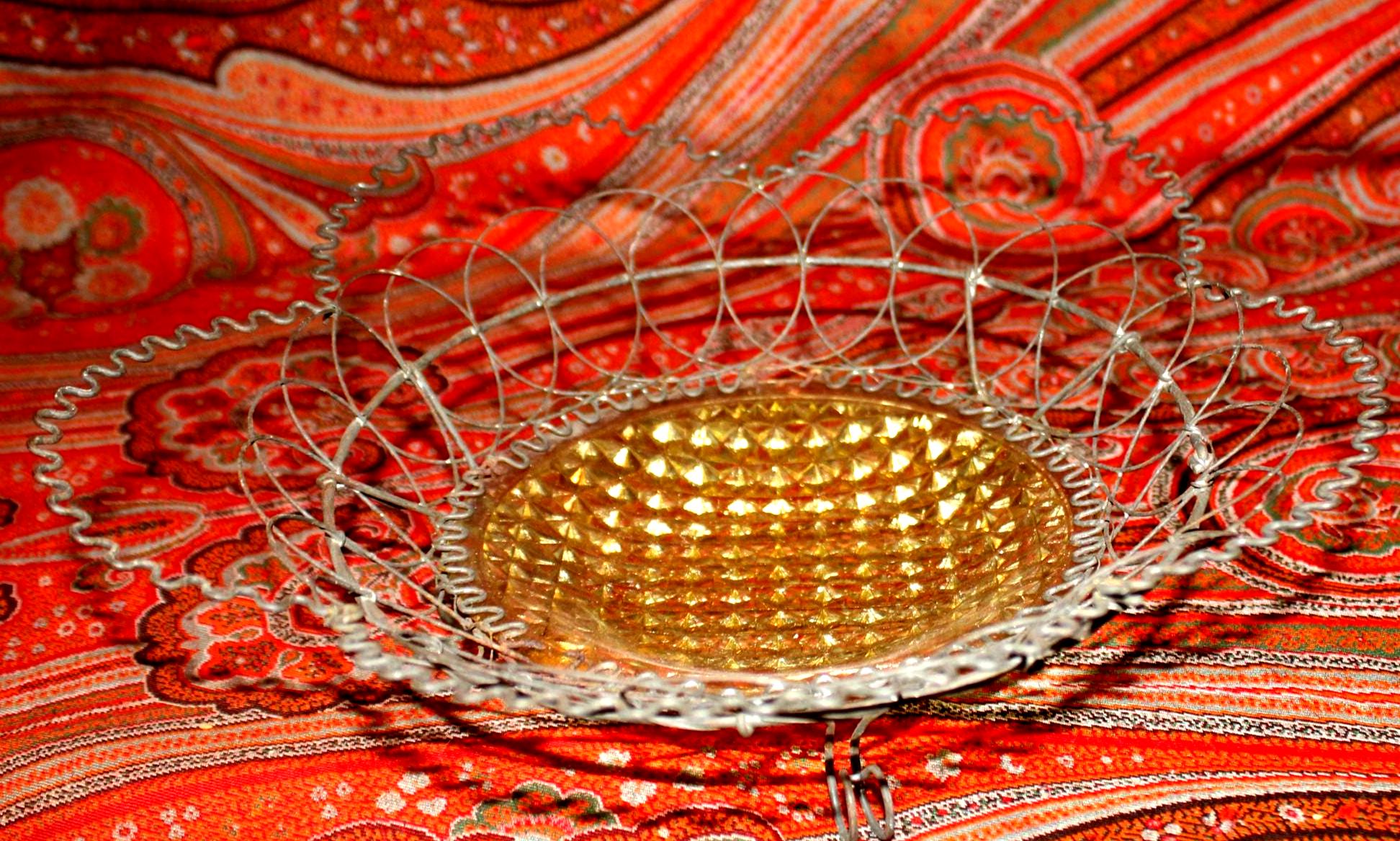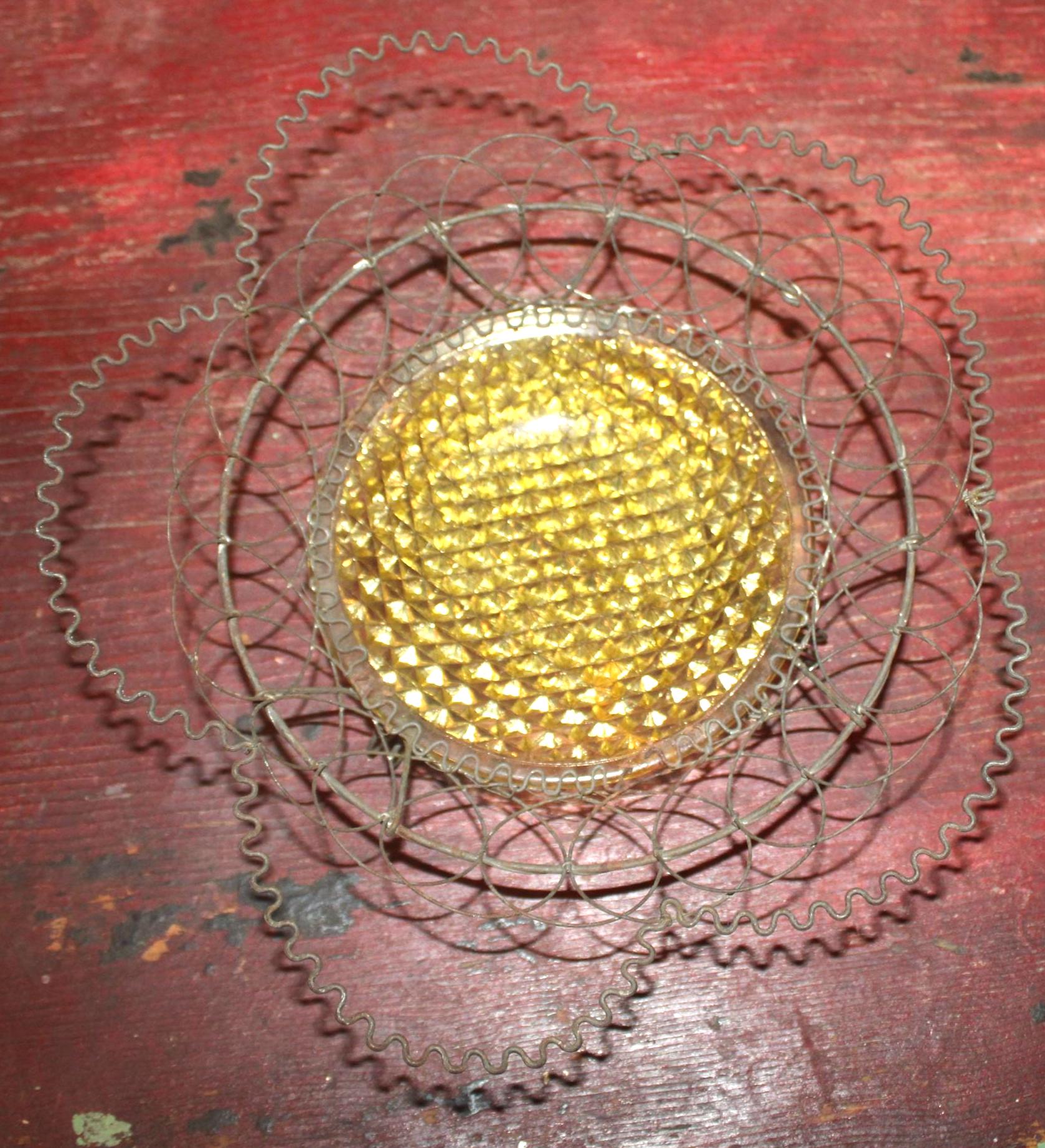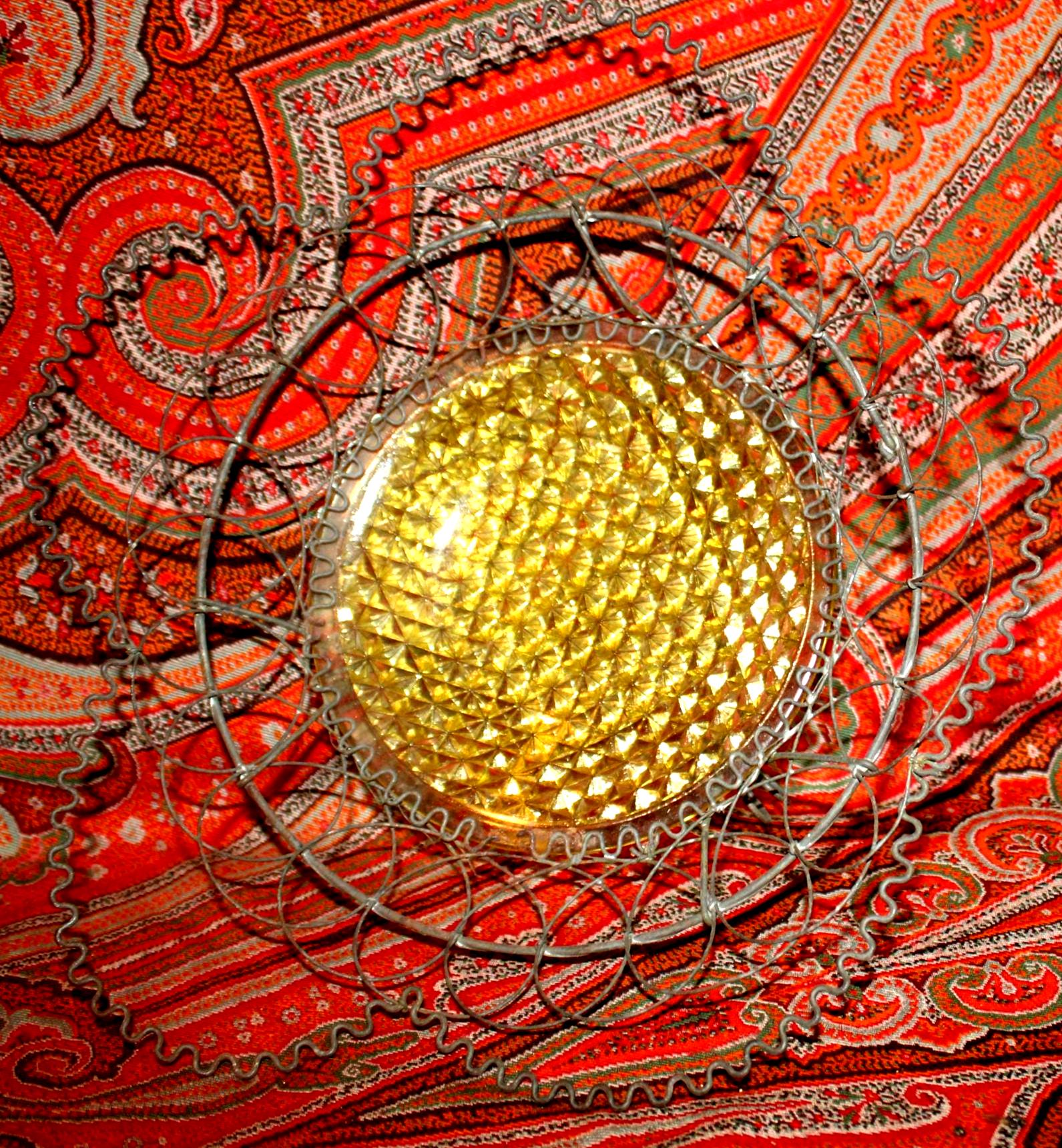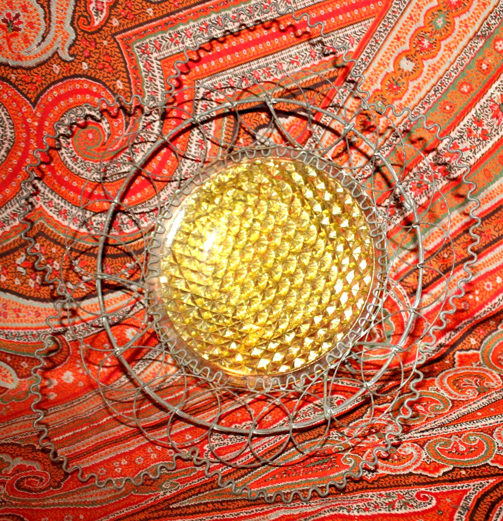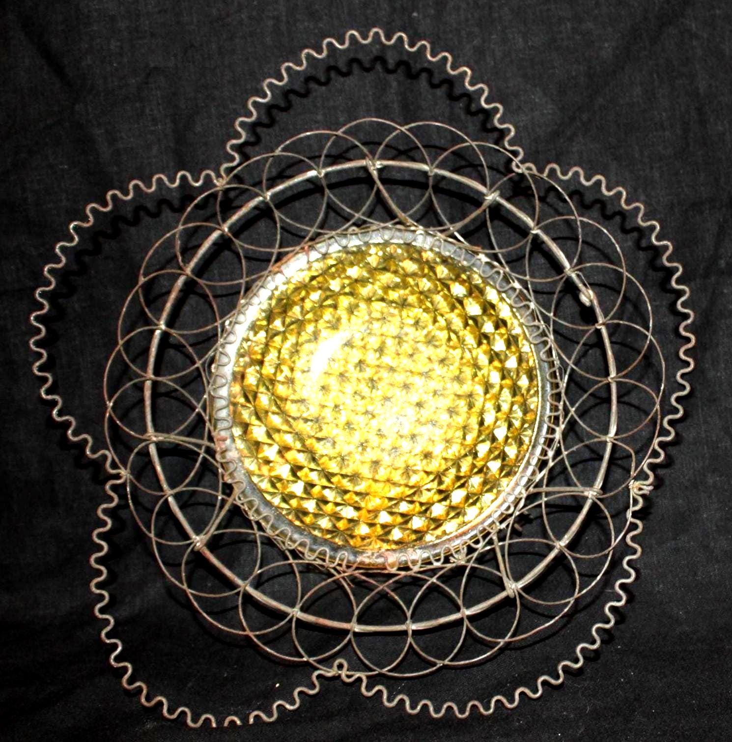 Gorgeous 19th Century Victorian French Wire Basket with Yellow Geometric Pressed Glass Bowl- Artwork/Wall Art/French Farmhouse