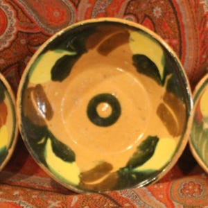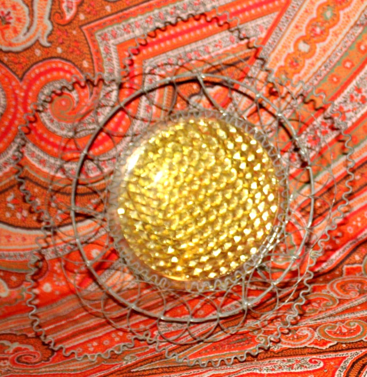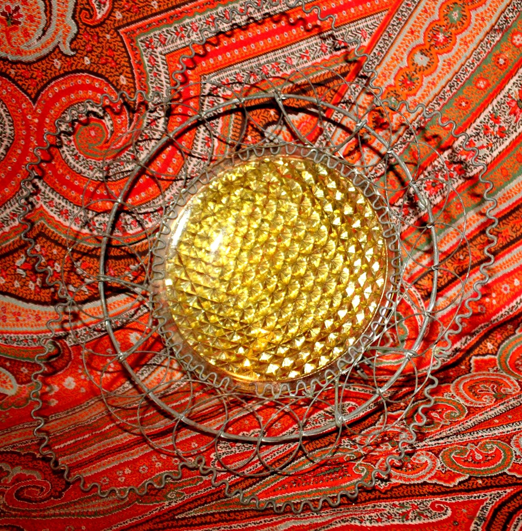 This Gorgeous 19th Century Victorian French Wire Basket with a Yellow Geometric Pressed Glass Bowl would display nicely in your French Farmhouse- A perfect example of Victorian wire ware (it would look fabulous hung on a wall with other pieces of wire ware!!)! The hand wired basket extends 10.25" in diameter; the amber glass plate is 5.25" in diameter. There are no chips or cracks to the plate and no damage or distortions to the wire. Please message us if you have any questions- Thanks for looking!