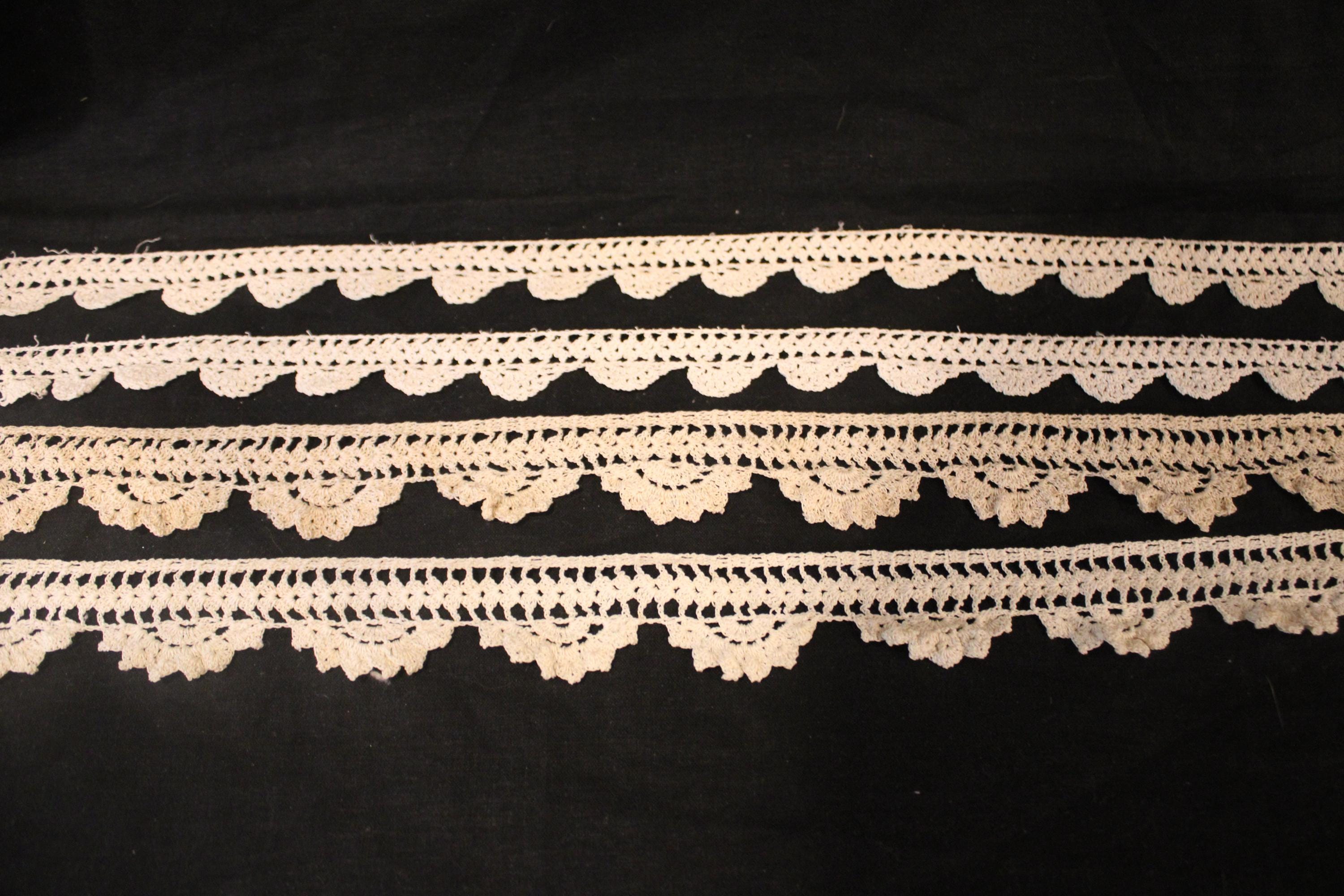 This gorgeous set of 19th c. Hand crocheted Lace would be the perfect trim to your favorite linen or pillow case. Each of the four pieces is intricately tatted with small cotton thread- they are in beautiful condition with no stains or damage. The four pieces are being sold together- Two pieces measure 1.75" wide and are 42" and 36" long; the other two pieces are 1" wide and 32" long. Please message us if you have any questions- Thanks for looking!