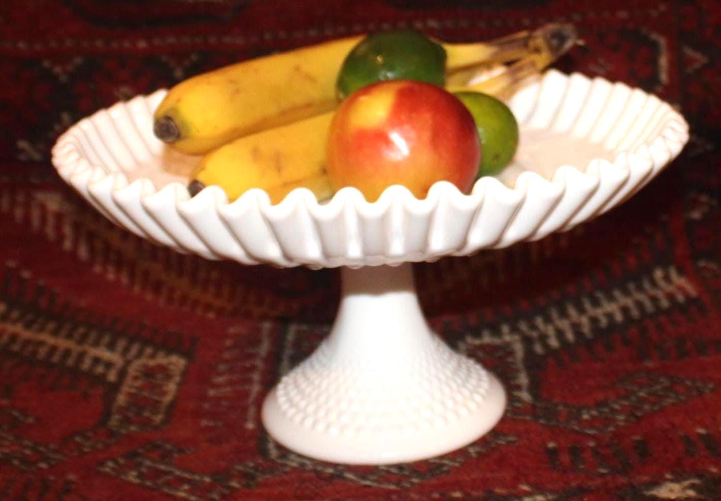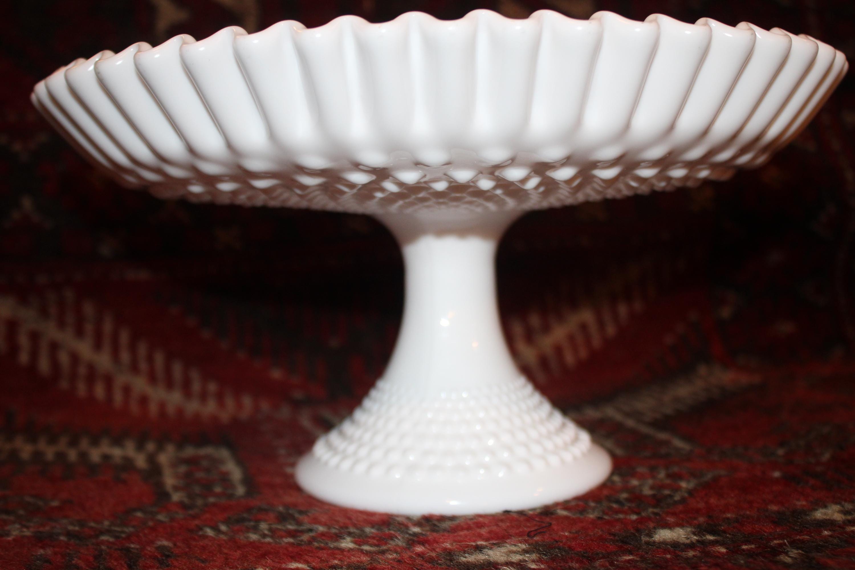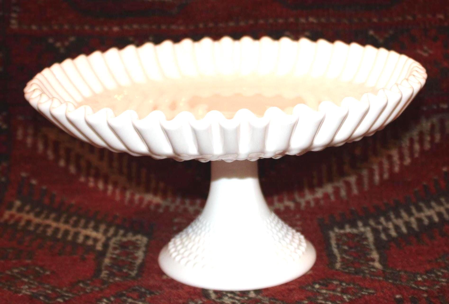 This Gorgeous Mid Century Fenton 12" Ruffled Hobnail White Milk Glass Pedestal Cake/Fruit Platter would be such a great addition to your summer table- perfect to present a birthday cake or wedding cake upon! It measures 12" in diameter x 6.25" tall with no chips or cracks. Please message us if you have any questions- Thanks for looking!