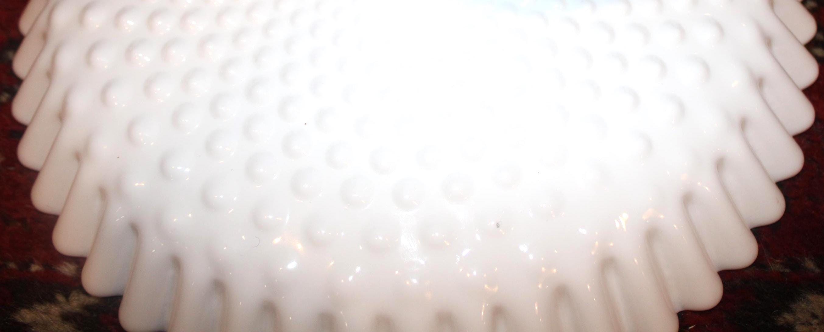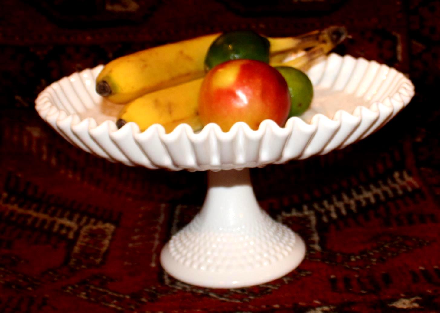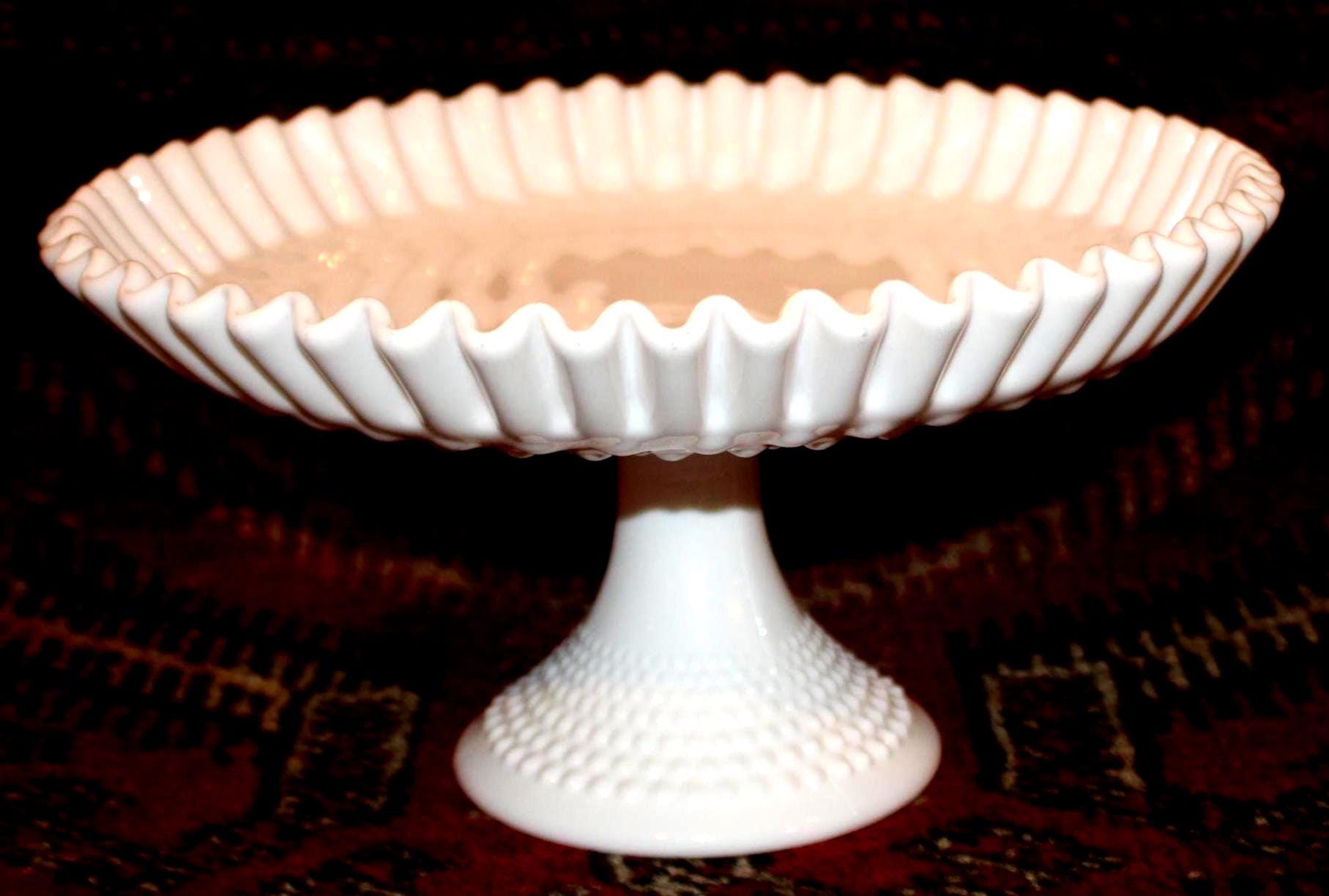 This Gorgeous Mid Century Fenton 12" Ruffled Hobnail White Milk Glass Pedestal Cake/Fruit Platter would be such a great addition to your summer table- perfect to present a birthday cake or wedding cake upon! It measures 12" in diameter x 6.25" tall with no chips or cracks. Please message us if you have any questions- Thanks for looking!