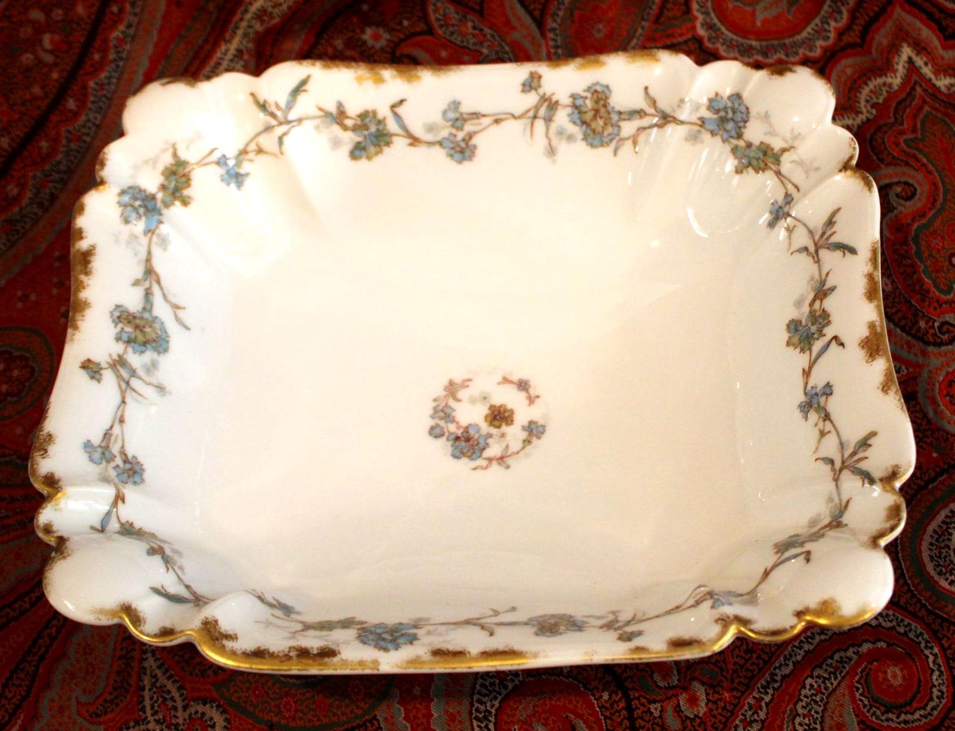 Set with golden trim and decorated with beautiful delicate pale blue flowers- it is sure to be a stunning addition to your collection!