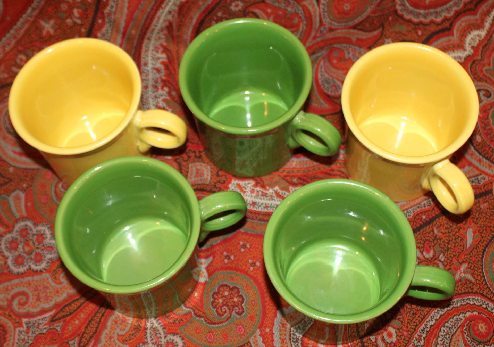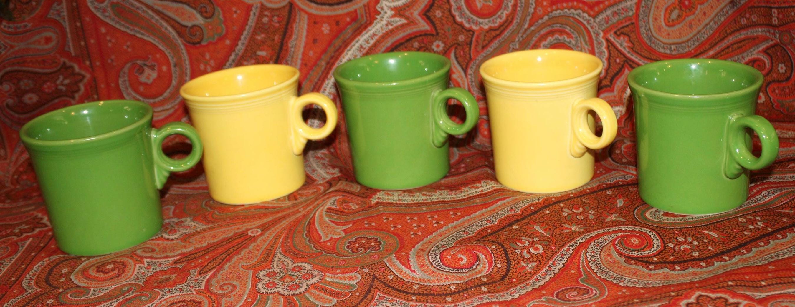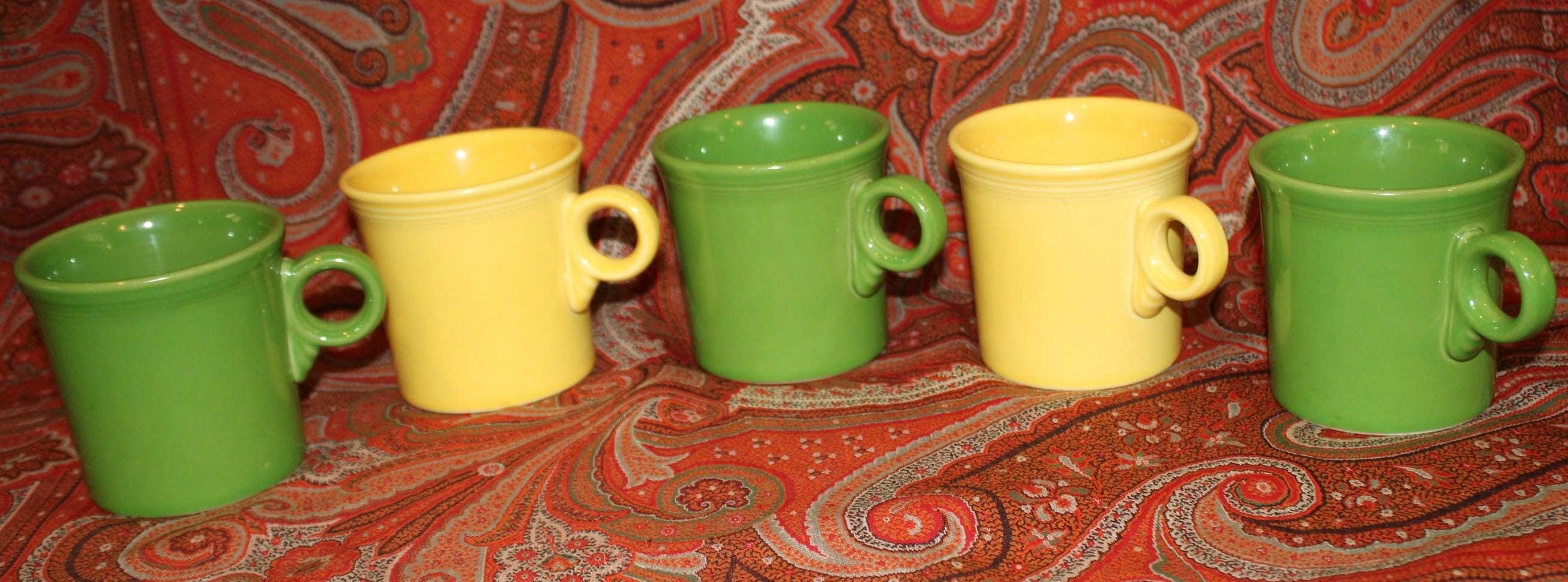 Set of Five Green and Yellow Fiesta Ware Trigger/O-ring Handle Coffee Mugs- Colorful Fiesta/Party/Coffee/Breakfast/Soup