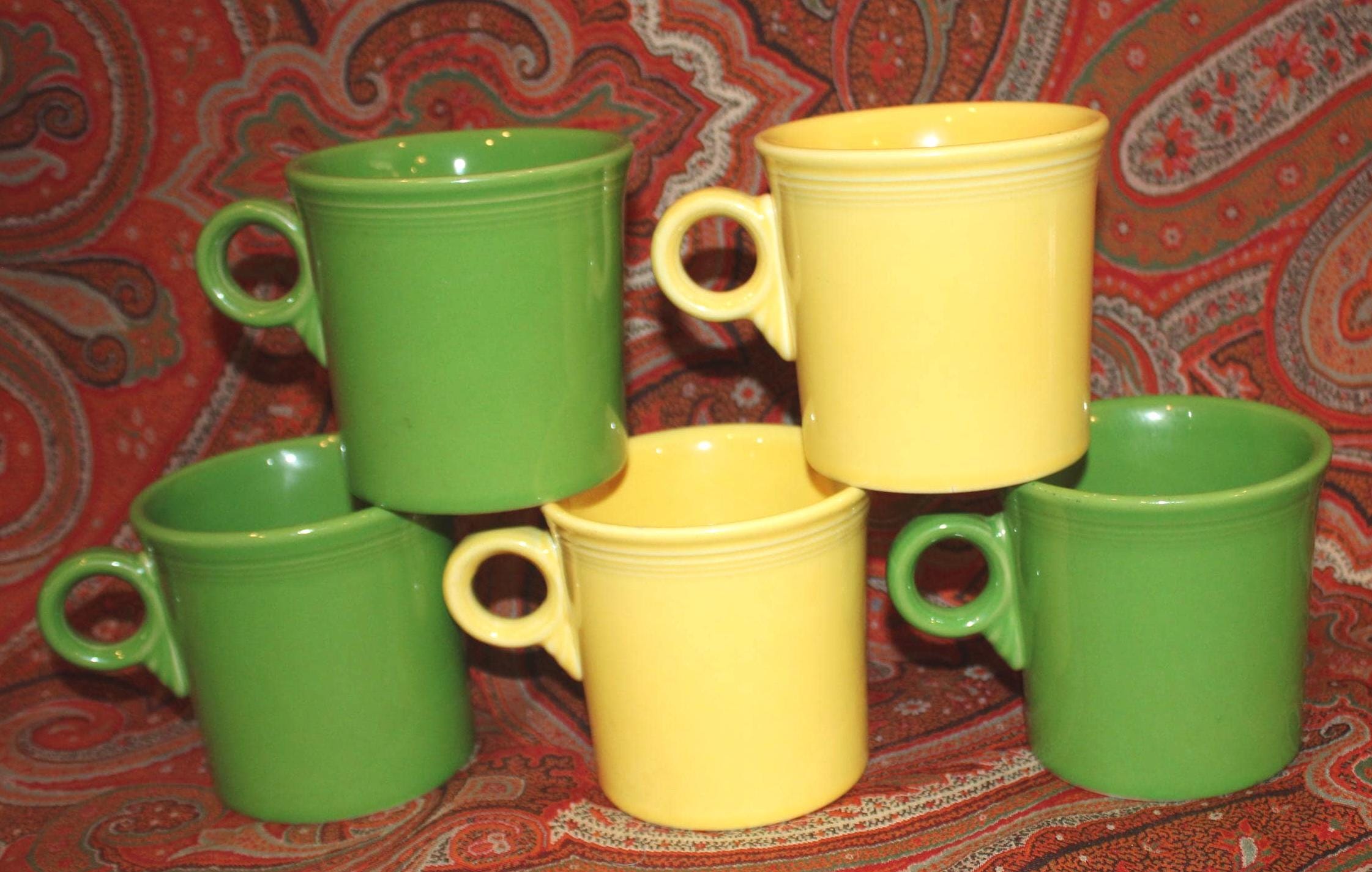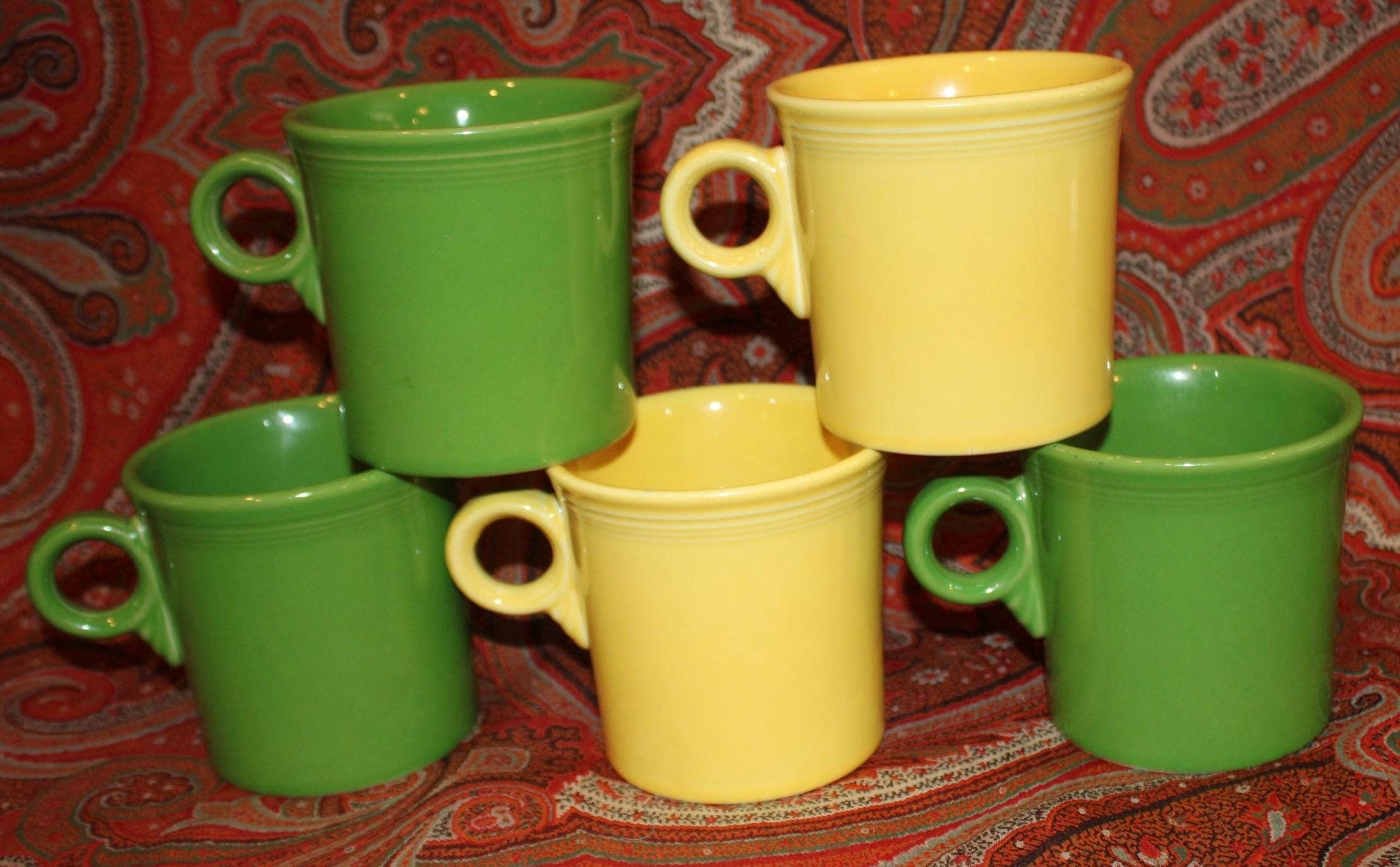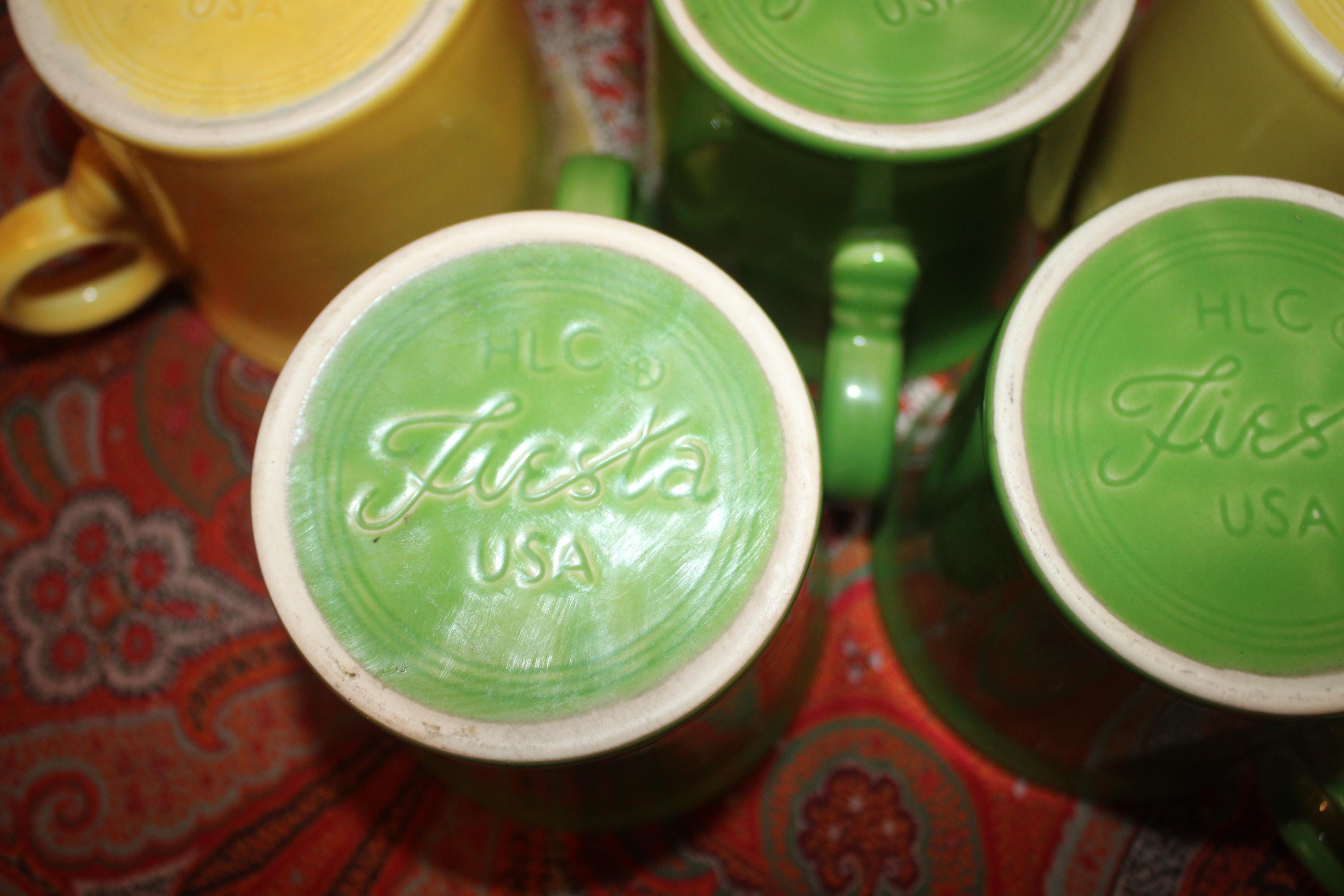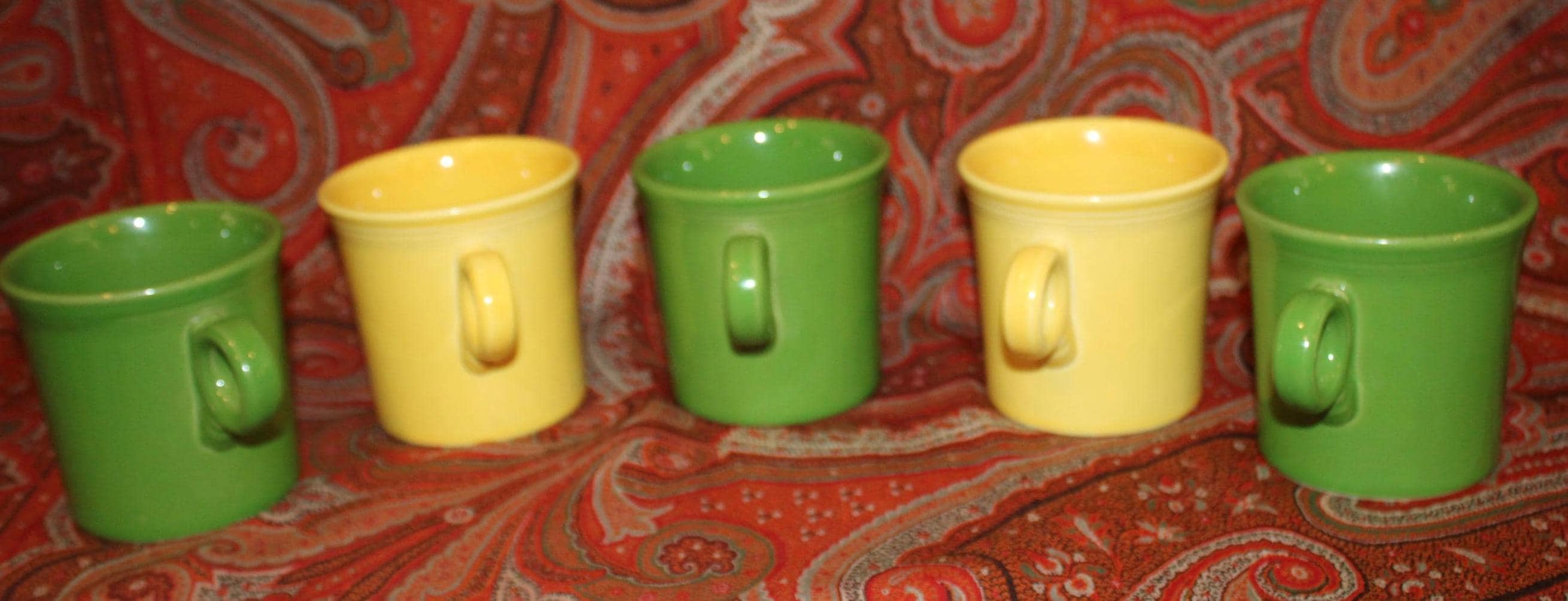 Set of Five Green and Yellow Fiesta Ware Trigger/O-ring Handle Coffee Mugs- Colorful Fiesta/Party/Coffee/Breakfast/Soup