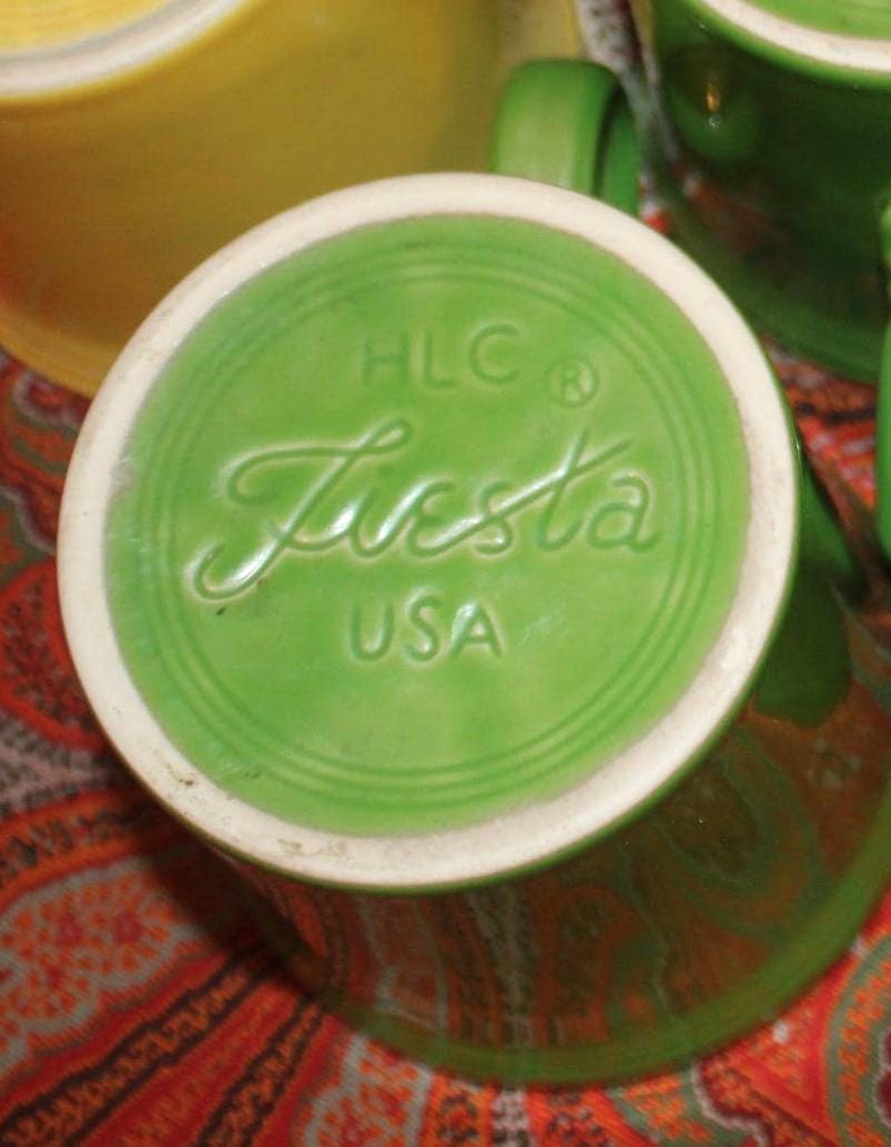 This set of Five Green and Yellow Fiesta Ware Trigger Handle Coffee Mugs is sure to add a little spice to your morning breakfast table! Each mug stands 3.5” tall x 3.5” in diameter with a fabulous trigger handle. The color of each is festive and fabulous- sure to brighten anyone’s spirit! There is no chipping or cracking- you will receive a set of five mugs- 3 green and two yellow. Please message us if you have any questions- Thanks for looking!